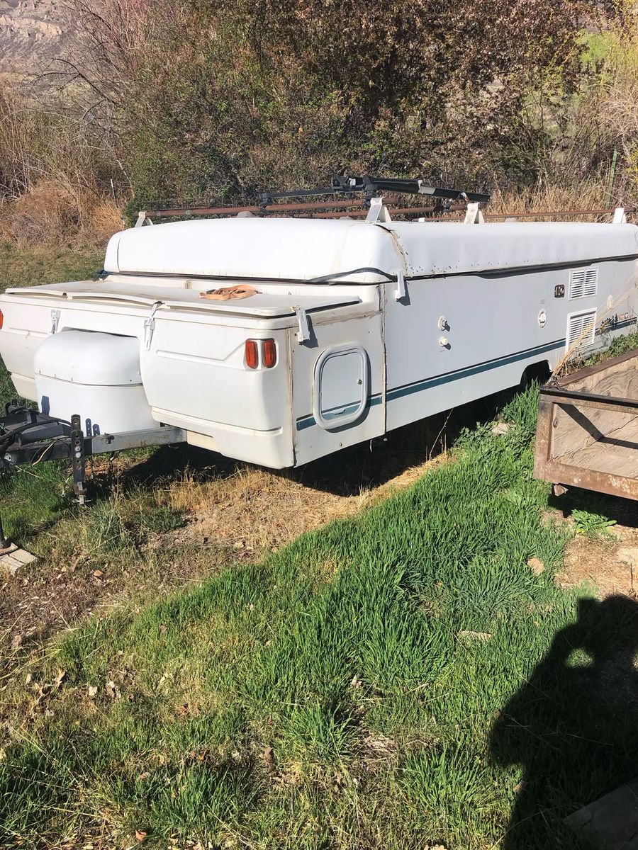 1997 Coleman pop up trailer. Has a kitchenette and two king size beds in the slide outs. Couch and table also go down into beds. There are a couple zippers that need some help and some electrical needs looked at as well. Only half of it works right now. Selling because we only use it once a year now and could really just use the space. $1000 obo text is the best way to reach me.