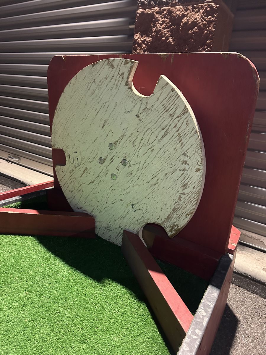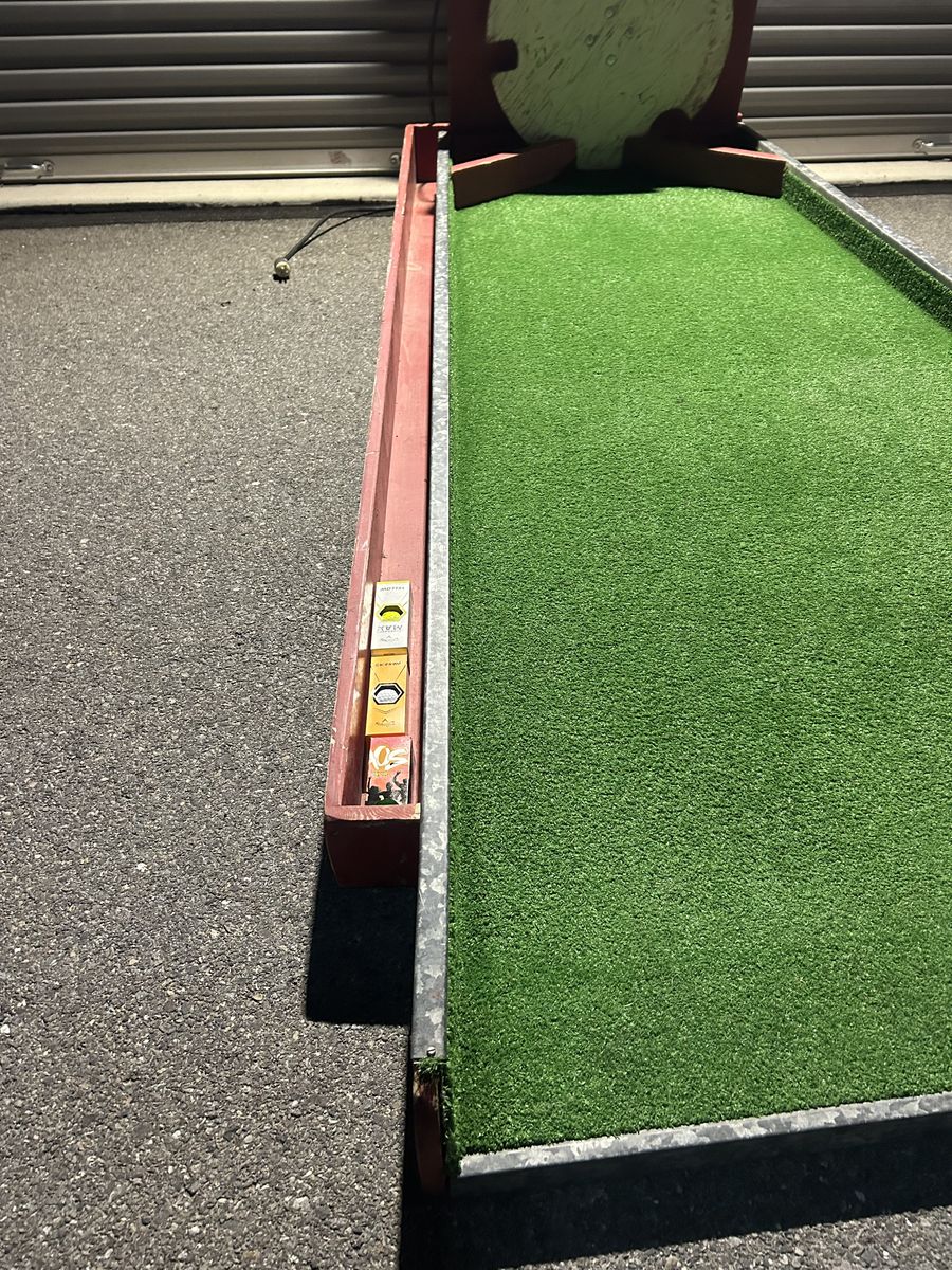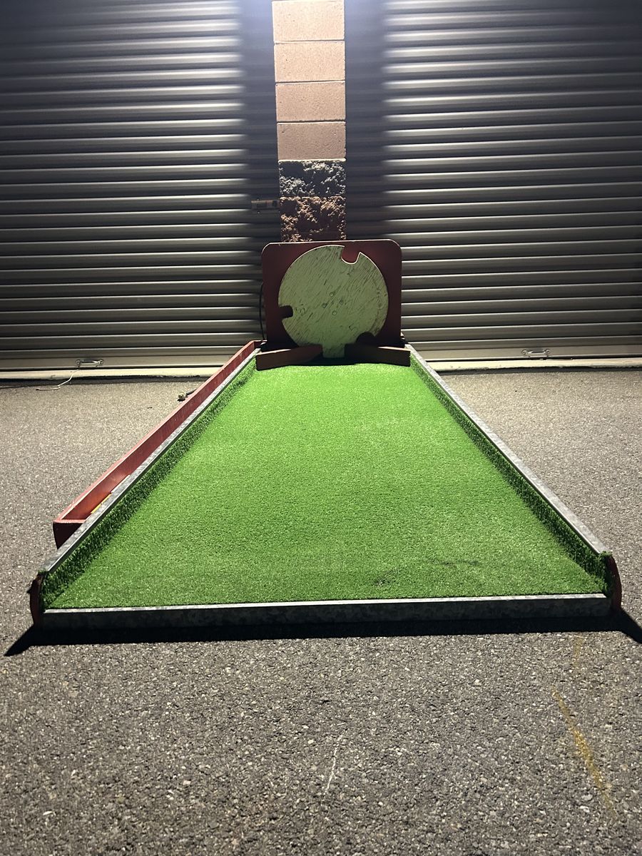 VenmoFun mini golf putting green with artificial grass. Has a red wood frame and a cool spinning wheel at one end. The balls come back to you similar to Skee-Ball. Comes with some golf balls too. Great for running a booth at events or backyard games.
