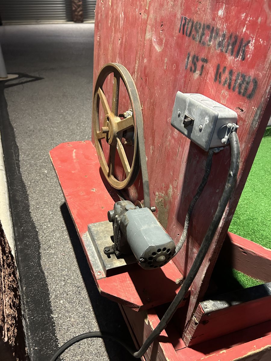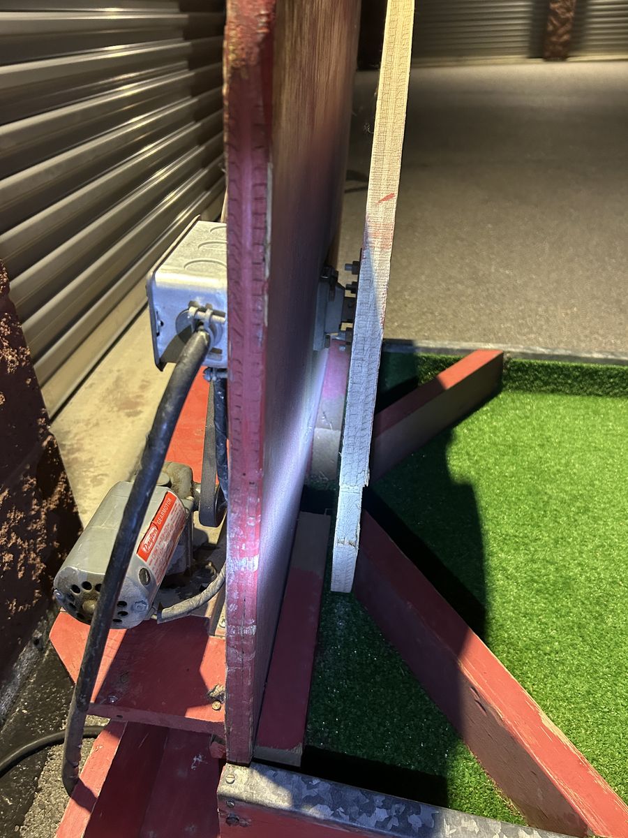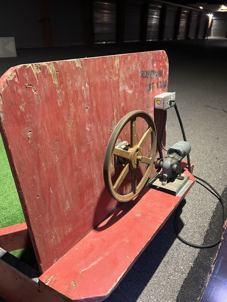 VenmoFun mini golf putting green with artificial grass. Has a red wood frame and a cool spinning wheel at one end. The balls come back to you similar to Skee-Ball. Comes with some golf balls too. Great for running a booth at events or backyard games.