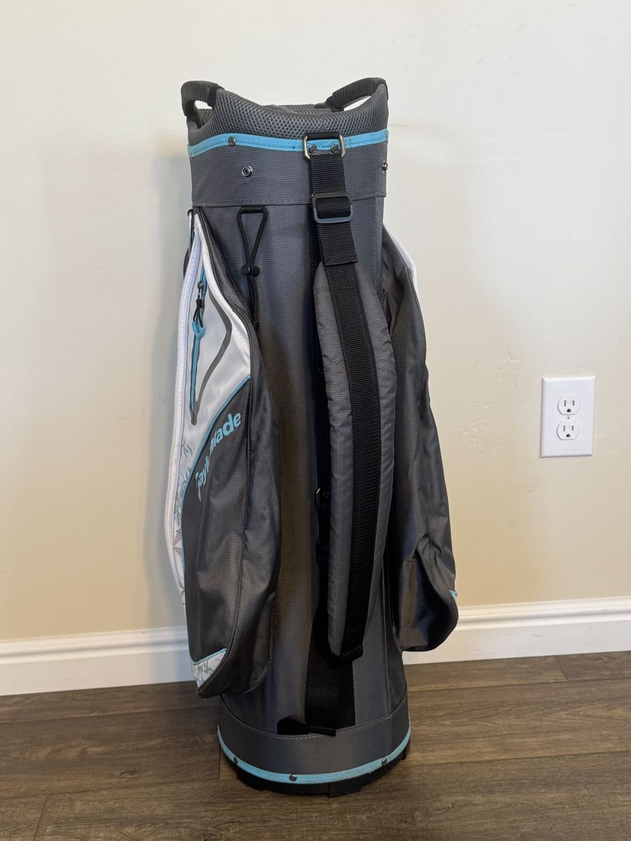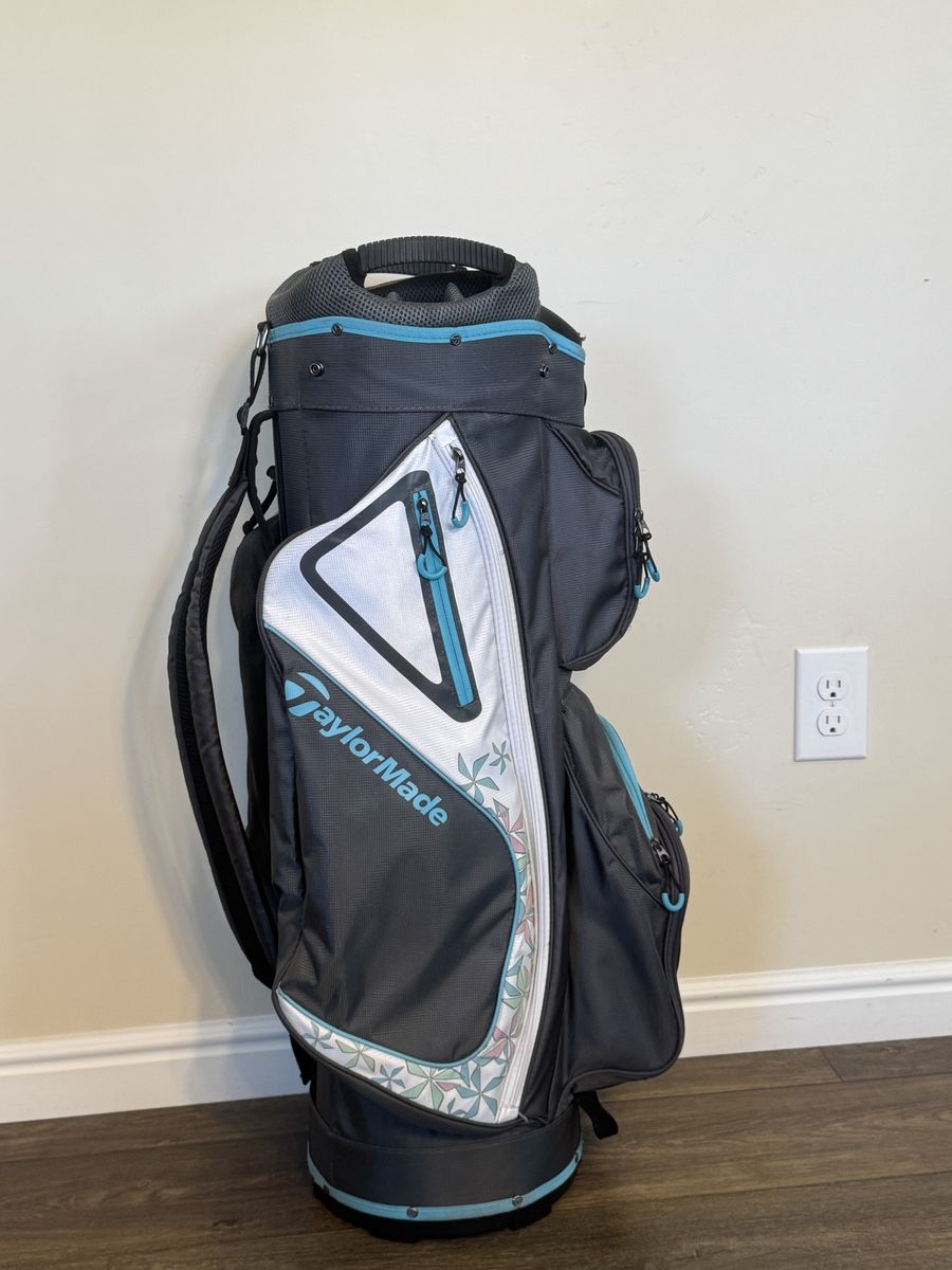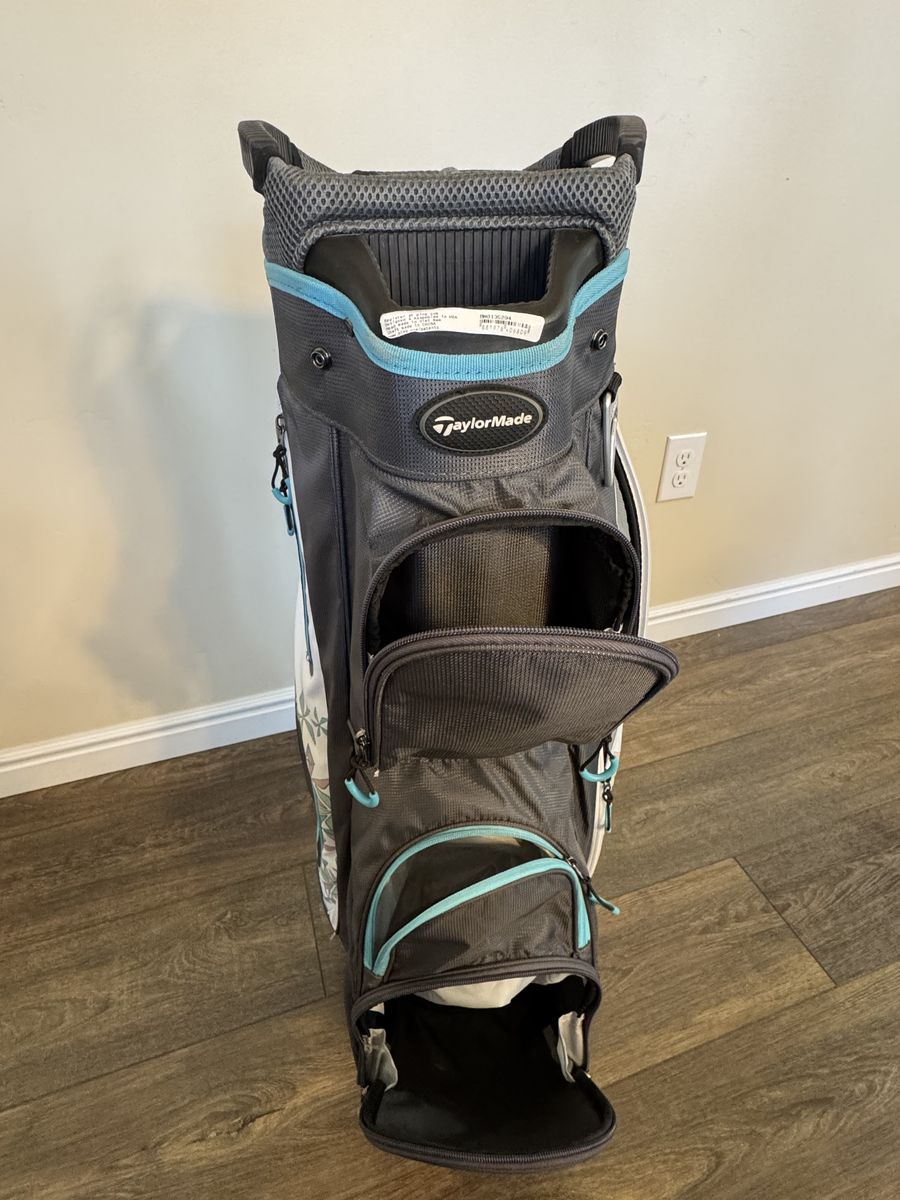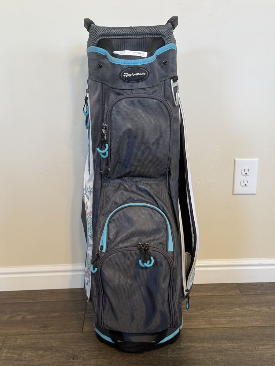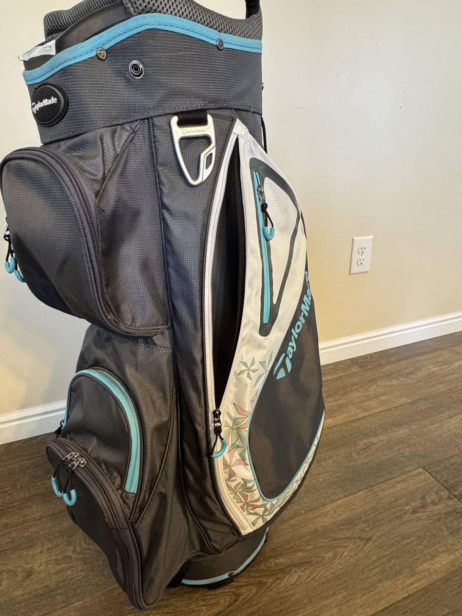 VenmoSelling my TaylorMade Kalea cart bag in excellent, like‑new condition. It’s been used once, kept clean, and stored indoors. Gray with white and teal accents, floral detailing, and a 14‑way top divider that keeps all your clubs organized without any hassle. It has 5 front pockets, tons of storage, and a comfortable single strap. The bag is extremely lightweight, easy to transport, and built with durable construction that will last for years.