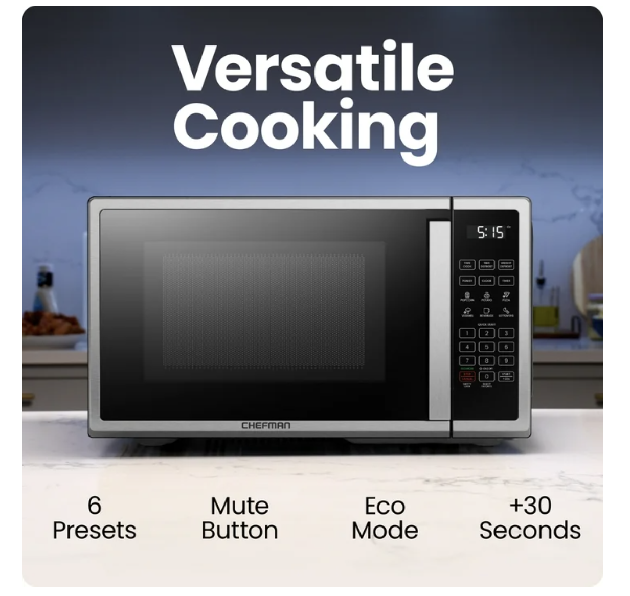 Brand new in box, Chefman 1.1 Cu ft Countertop Microwave Oven, 1000 Watts - Stainless Steel Express Cook Presets: 6 presets for popcorn, potato, pizza, veggies, beverages, and leftovers take the guesswork out of perfectly cooked food. Variable Power Levels: 1000 watts with 10 power levels to heat, defrost, cook, and more all in one compact microwave oven. Memory Function: Save frequently used settings to heat your meals and beverages quickly. Multiphase Cooking: Use two different cooking cycles for one food by programming extra power levels and times. Quiet Operation: Mute option silences beeps and alarms for quieter cooking at home, in the kitchen, apartment, or dorm. Energy Efficient: Eco mode reduces energy use by shutting off the LED display when not in use. Quick Start Button: The +30 button instantly starts microwave heat for 30 seconds and may be pressed multiple times. Child Safety Lock: Childproof lock mode prevents the microwave from being started. Hold the STOP/CANCEL button for 3 seconds to turn on and off. Modern Design: Sleek stainless-steel microwave with a removable turntable will instantly upgrade your space