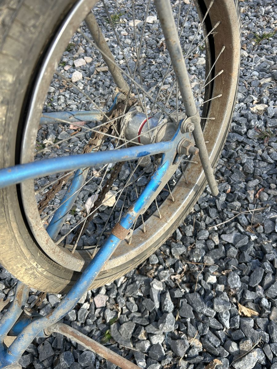 This is an authentic survivor bike with original frame and classic Sting-Ray geometry. Frame still has original blue paint with normal wear/patina from age.
