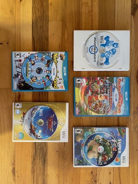 ZelleNintendo Wii U 8 GB Bundle with 5 games: Mario Kart Wii, Nintendo Land, Zelda Skyward Sword, Super Mario Galaxy 2, and Paper Mario Color Splash. Includes 3 Wii remotes, Gamepad, Sensor Bar, 2GB SD card, and all chargers. Refurbished, with minimal wear.