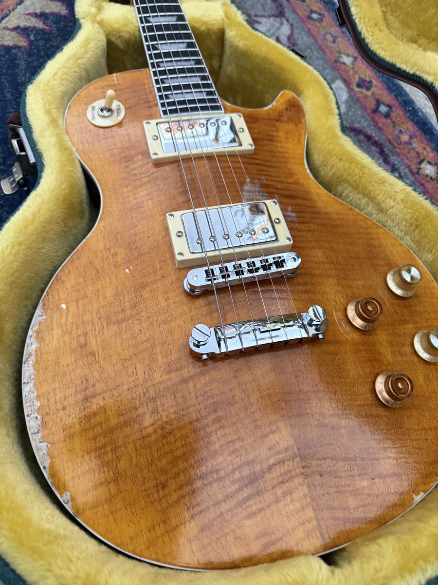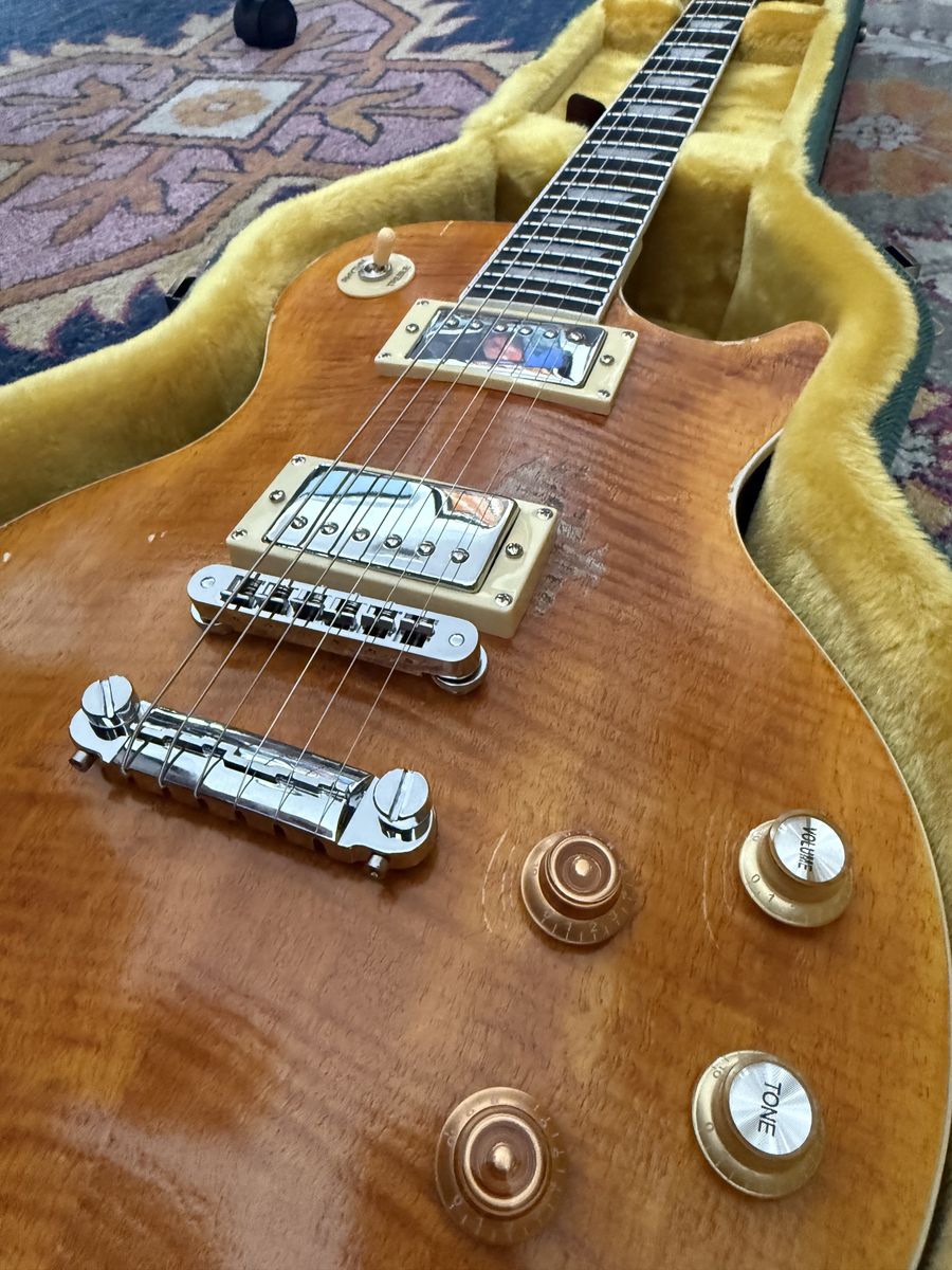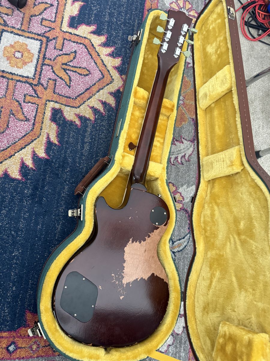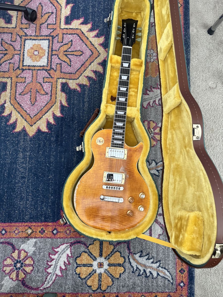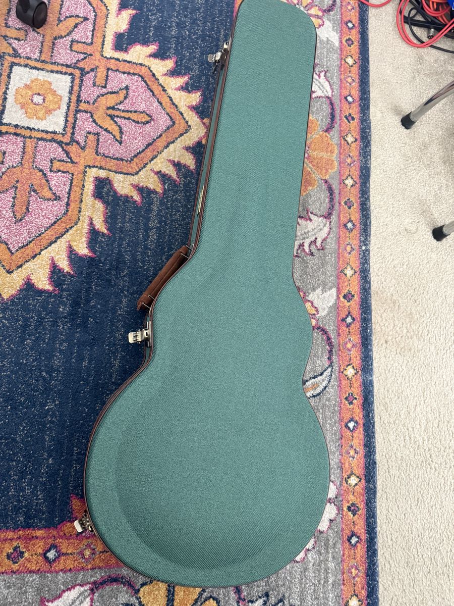This is a no name brand Les Paul “Greeny” that I purchased as a project guitar but just never got around to it. It plays and sounds pretty good for a no name guitar, looks cool too. Comes with hardshell case.