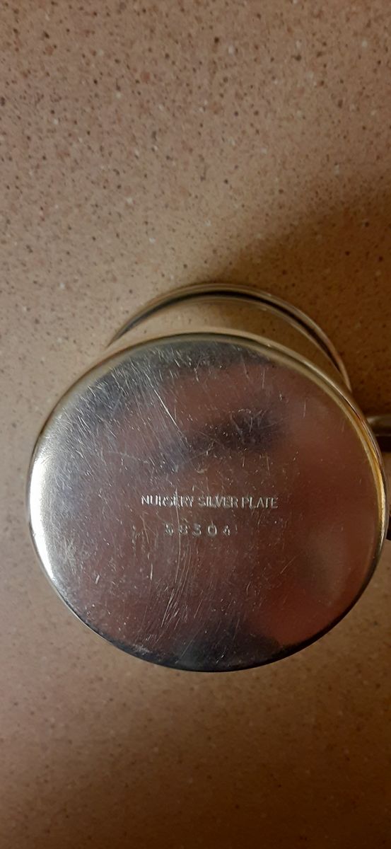 VenmoCharming antique silver-plated nursery cup, traditionally given as a baby or christening gift in the early 20th century. Marked on the bottom “Nursery Silver Plate” with pattern number 58304.