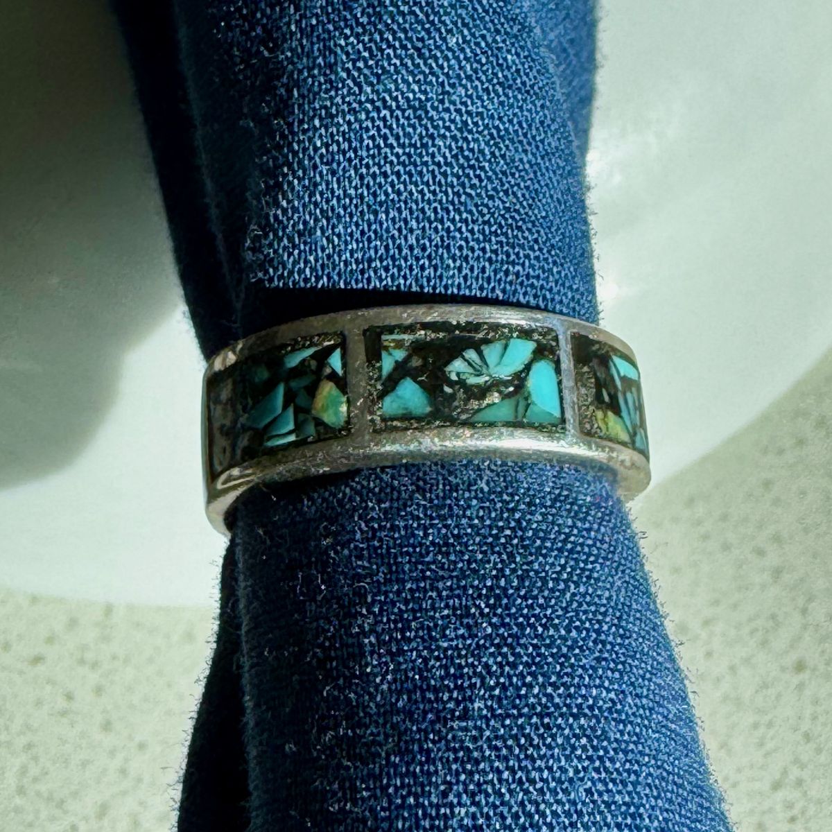 ApplePayThis beautiful, handcrafted Southwestern "storyteller" style band features a vibrant Kingman-blue turquoise mosaic inlay set in solid .925 sterling silver. The turquoise chips are meticulously hand-fitted into a classic geometric channel inlay pattern—a hallmark of authentic 1970s-era Navajo and Zuni artisan craftsmanship. This ring has a comfortable, mid-weight feel and a low profile, making it perfect for daily wear or as a unique stacking band.
