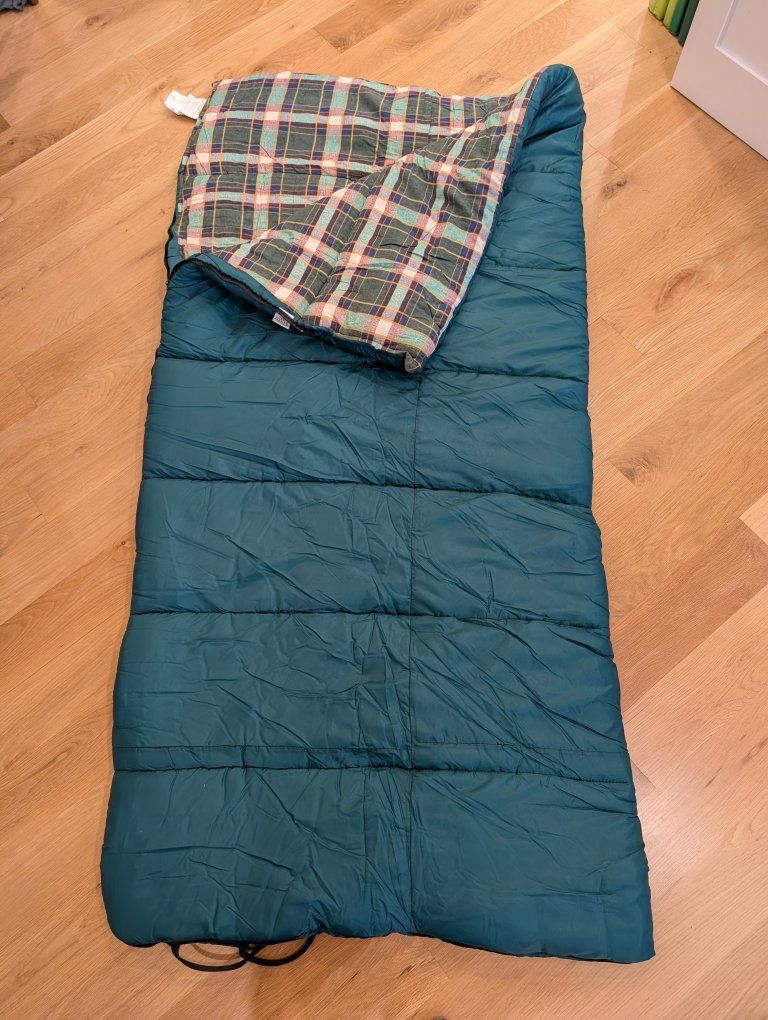 LIKE NEW CONDITION! This sleeping bag has never been used. Made in USA. Measures 38 inches by 81 inches. 100% cotton liner. 100% nylon outer. Weigh 4 pounds. I also have a second identical sleeping bag you can have for free if you'd like. Our neighbor's cat got in our garage and was trapped in the box where we stored one of the sleeping bags and scratched it up trying to get out. See the very last photo for scratches on this sleeping bag. Message or text any time. Cash only please. I can meet at the Kaysville Library (Tuesdays or Fridays) or the South Weber Maverik. Please see my other ads. Thanks!