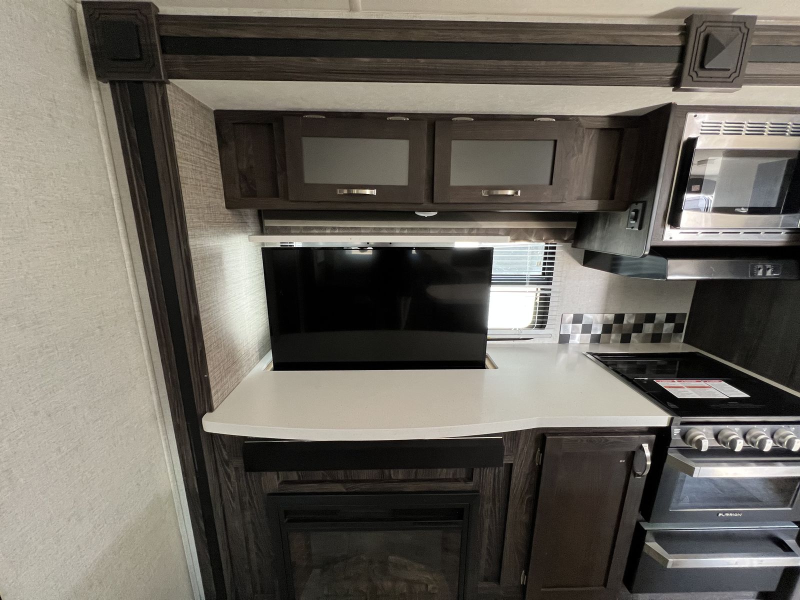 Inside, you'll find a spacious living area with comfortable seating, large panoramic windows, and modern finishes that make it feel like home on the road. The fully equipped kitchen features solid-surface countertops, stainless appliances, ample storage, and a large refrigerator—perfect for cooking at the campsite.