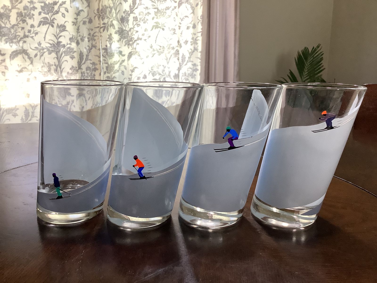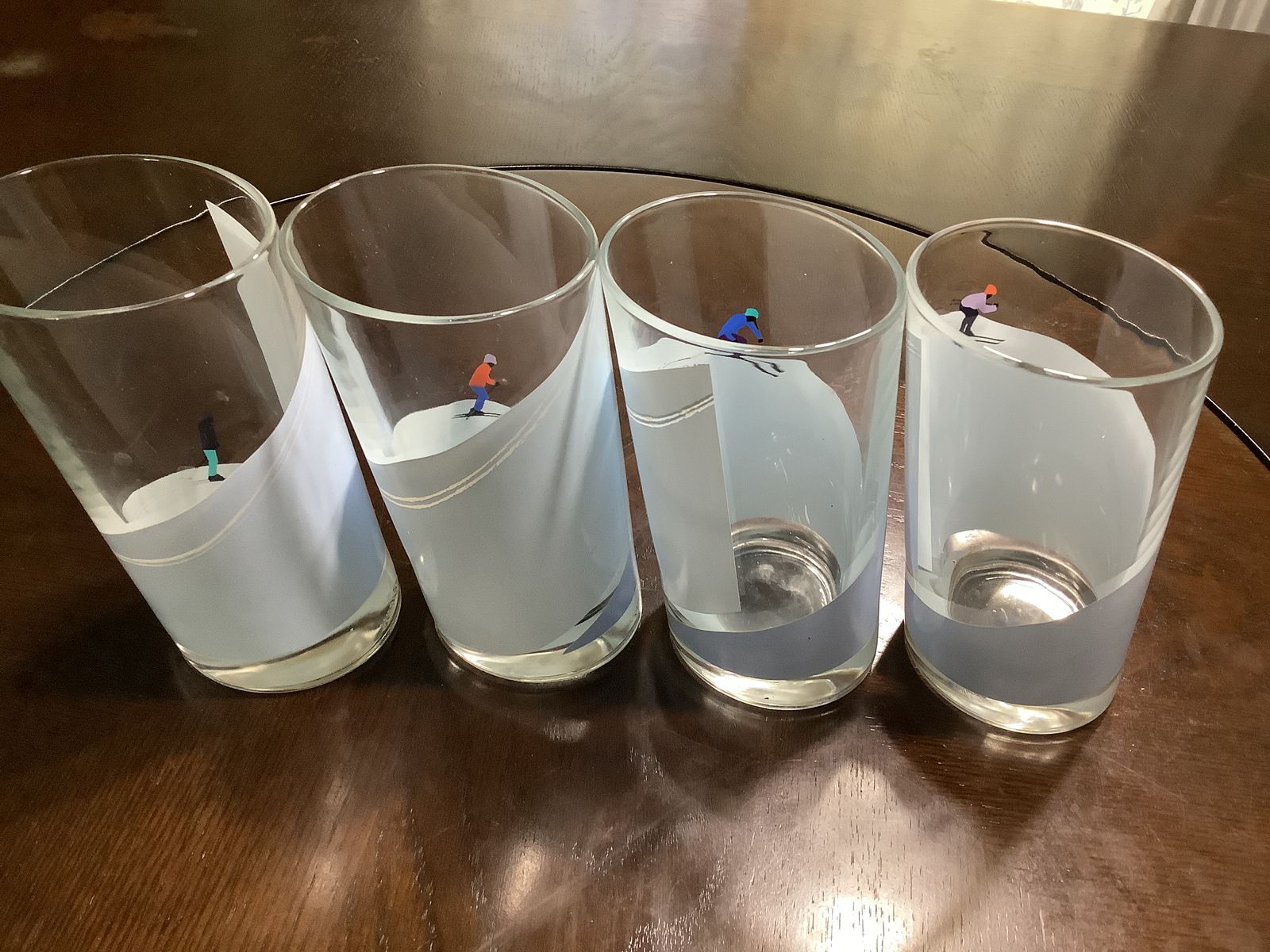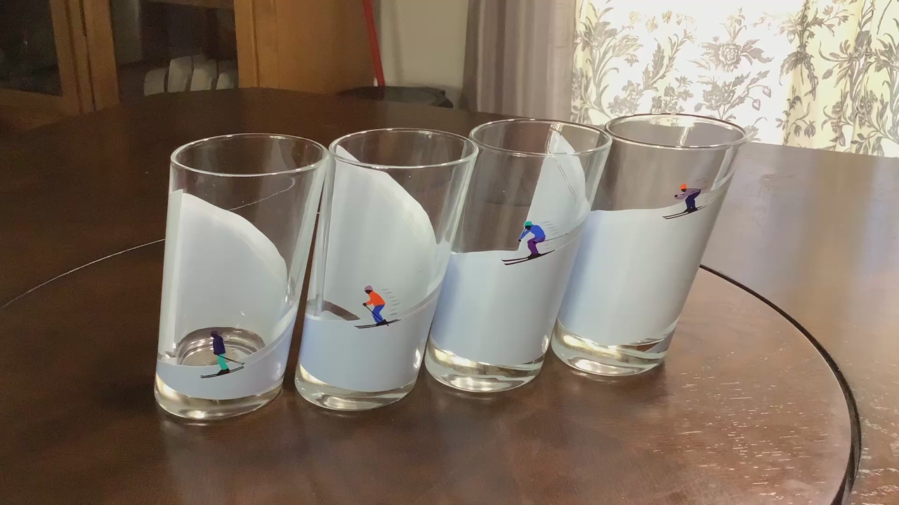 VenmoRare Italian Highball cacktail glass Winter Alpine Snow Skiers strategically designes with angle cut the figures are reversible Set of 4 good condition