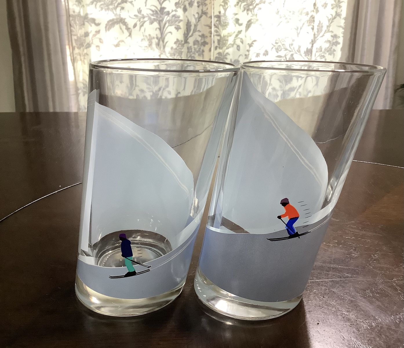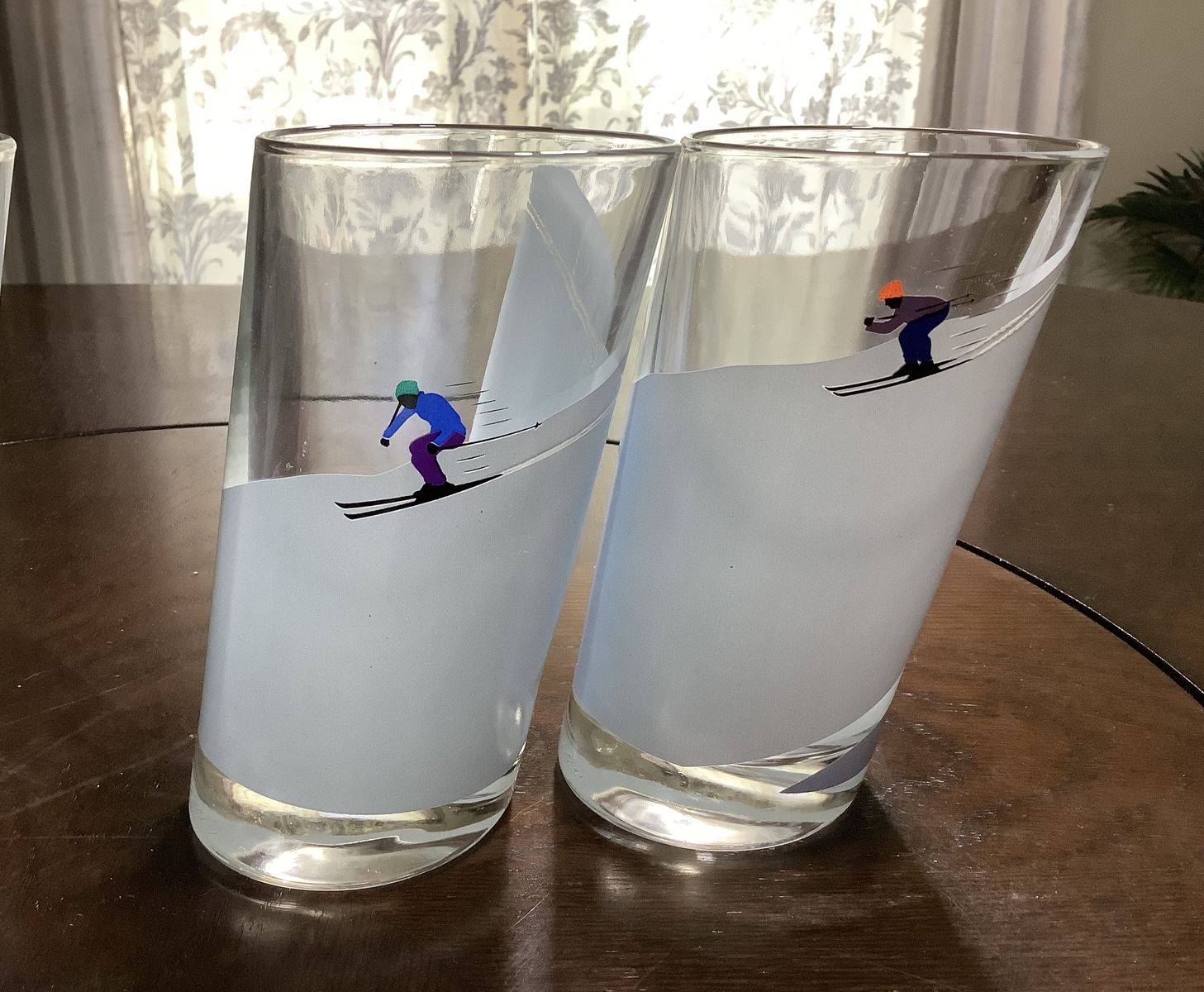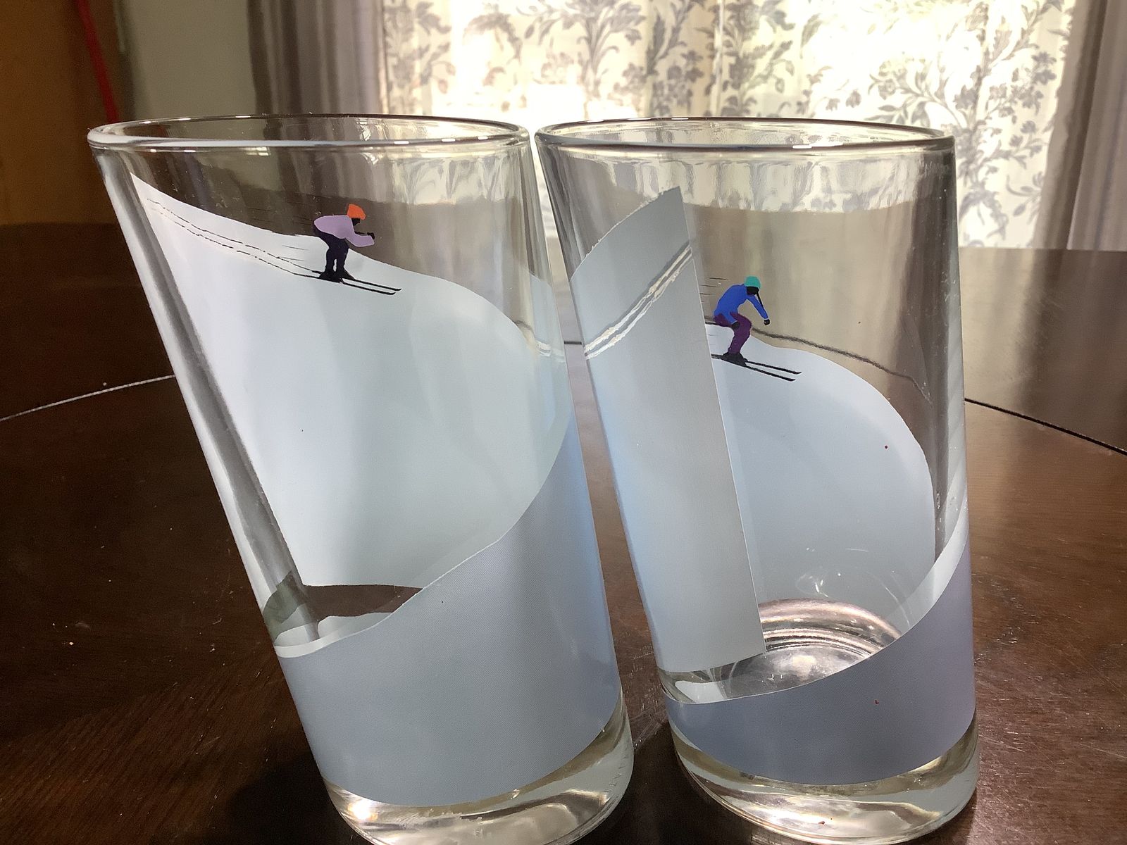 VenmoRare Italian Highball cacktail glass Winter Alpine Snow Skiers strategically designes with angle cut the figures are reversible Set of 4 good condition