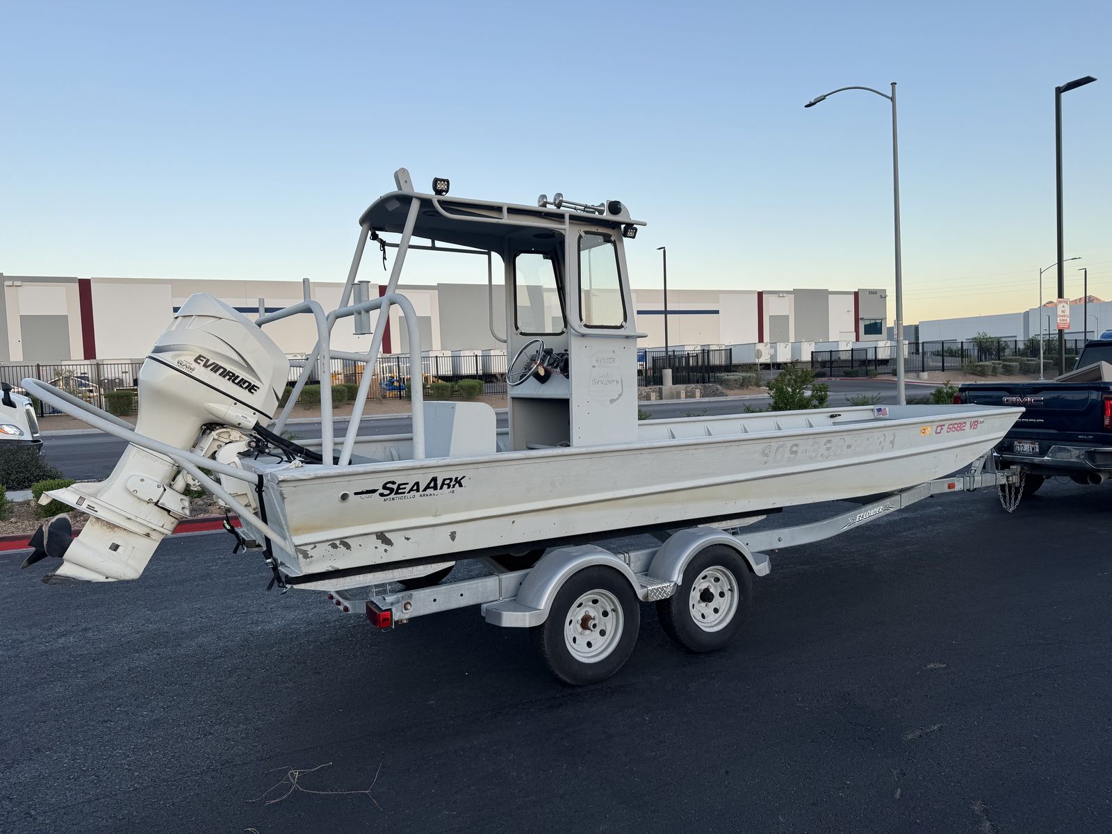 2000 sea ark 24’ aluminum center console shallow draft boat. Jon boat style hull. Original 2001 Evinrude 150hp motor only has 370 hours on it. Boat is equipped with LED lights. Would make an excellent bow fishing platform. Asking $14,900 or best offer.