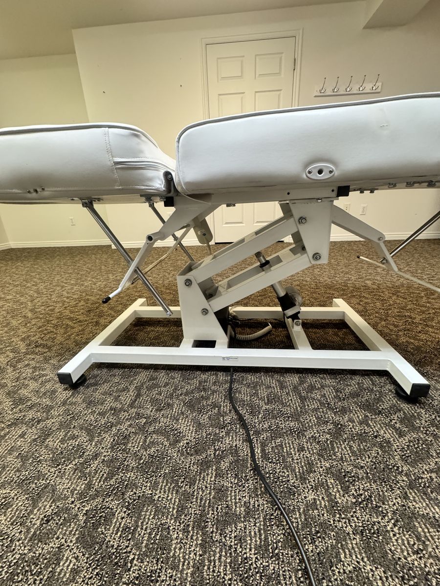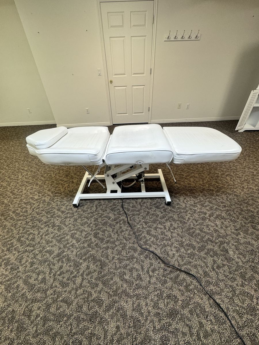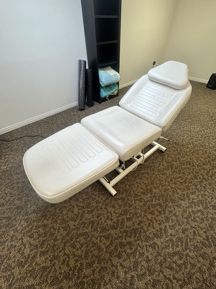 High-quality white aesthetician chair with electric hydraulic adjustment. Clean, modern look and in excellent condition.