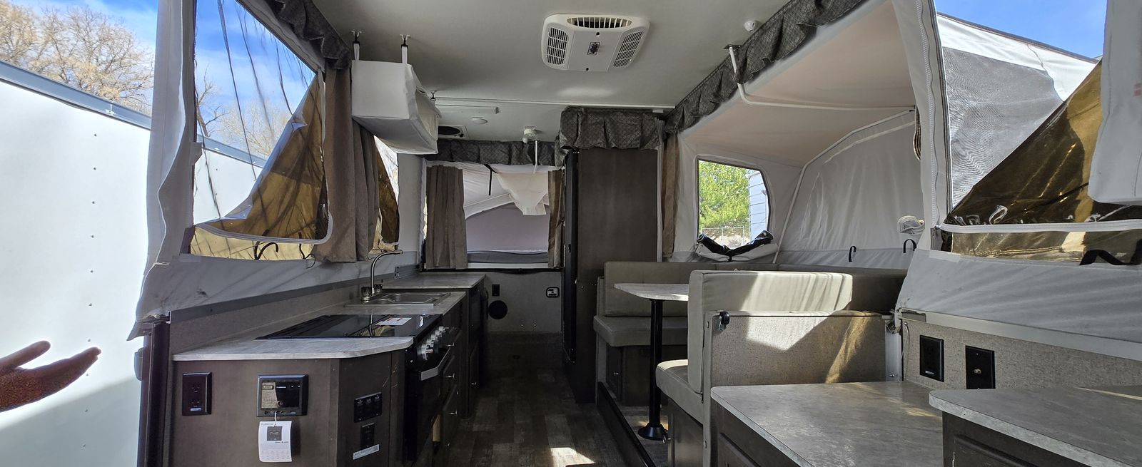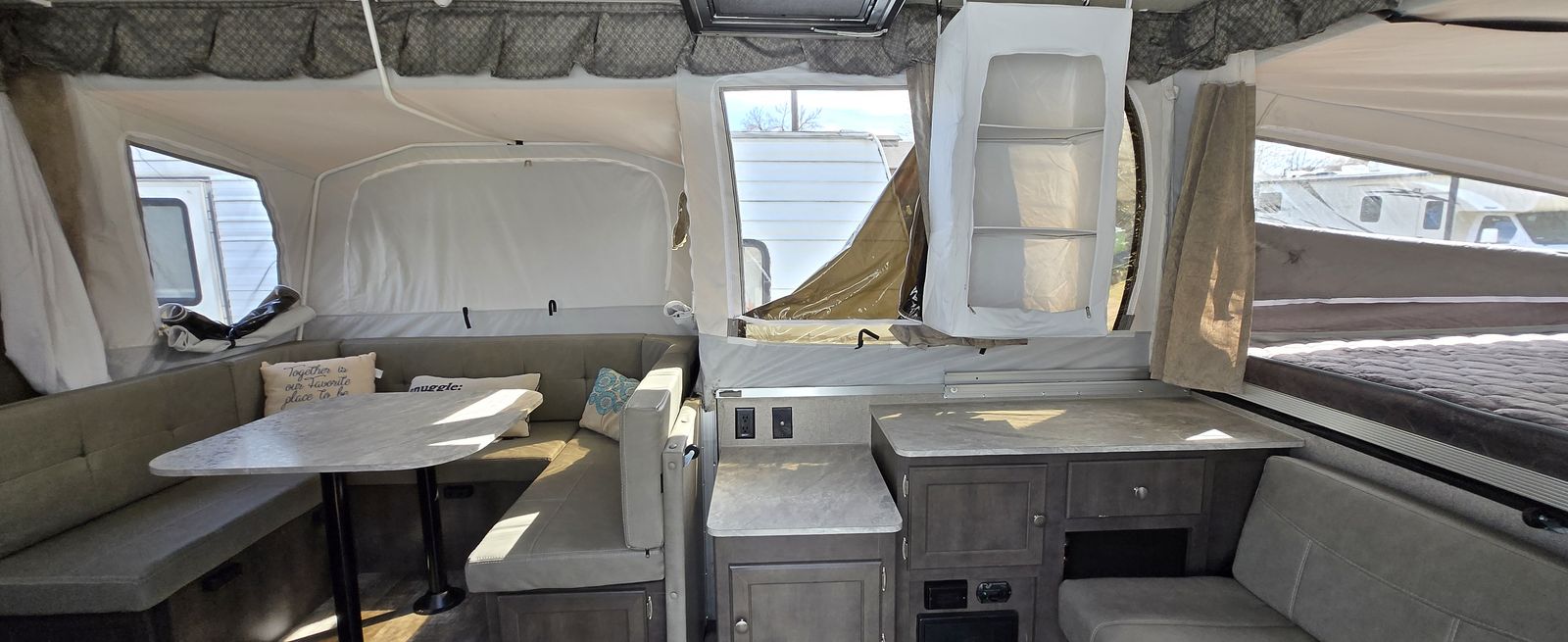 Once set up, it expands to nearly 30 feet of spacious living, offering an unusually generous amount of counter space and storage—a rare find in tent campers.
