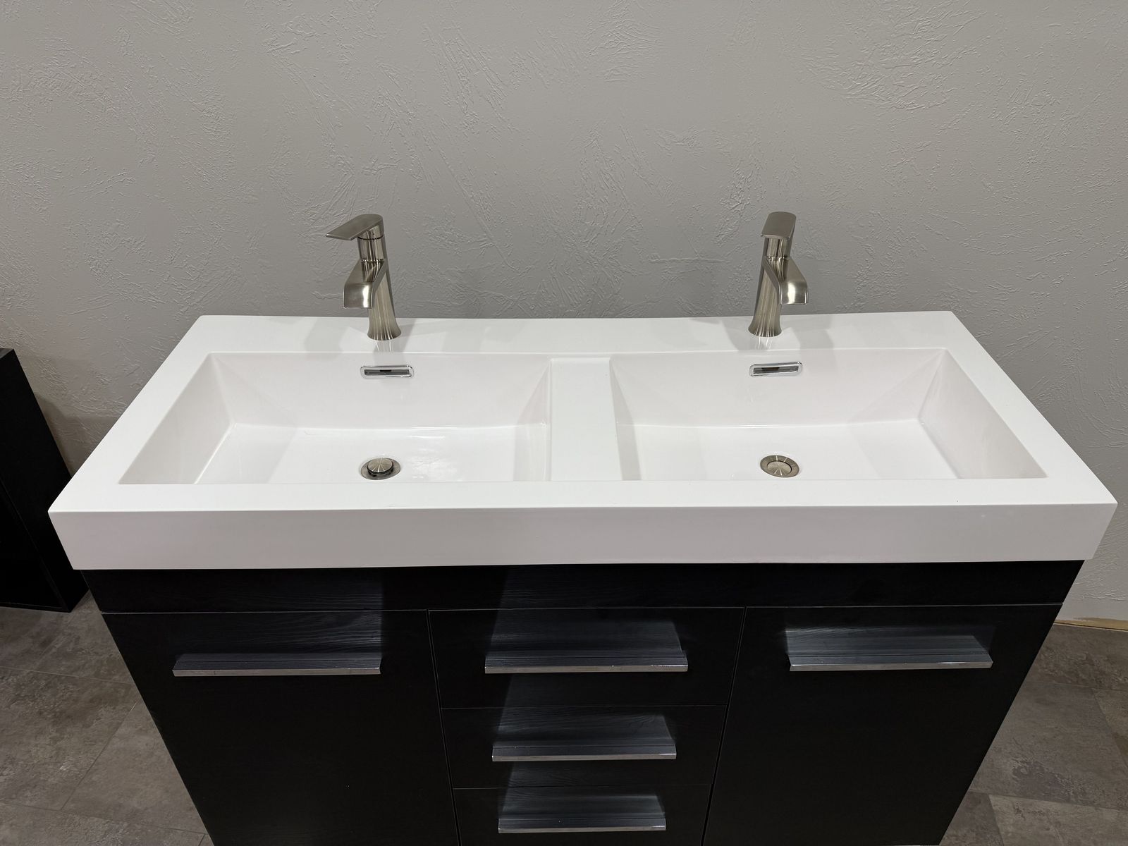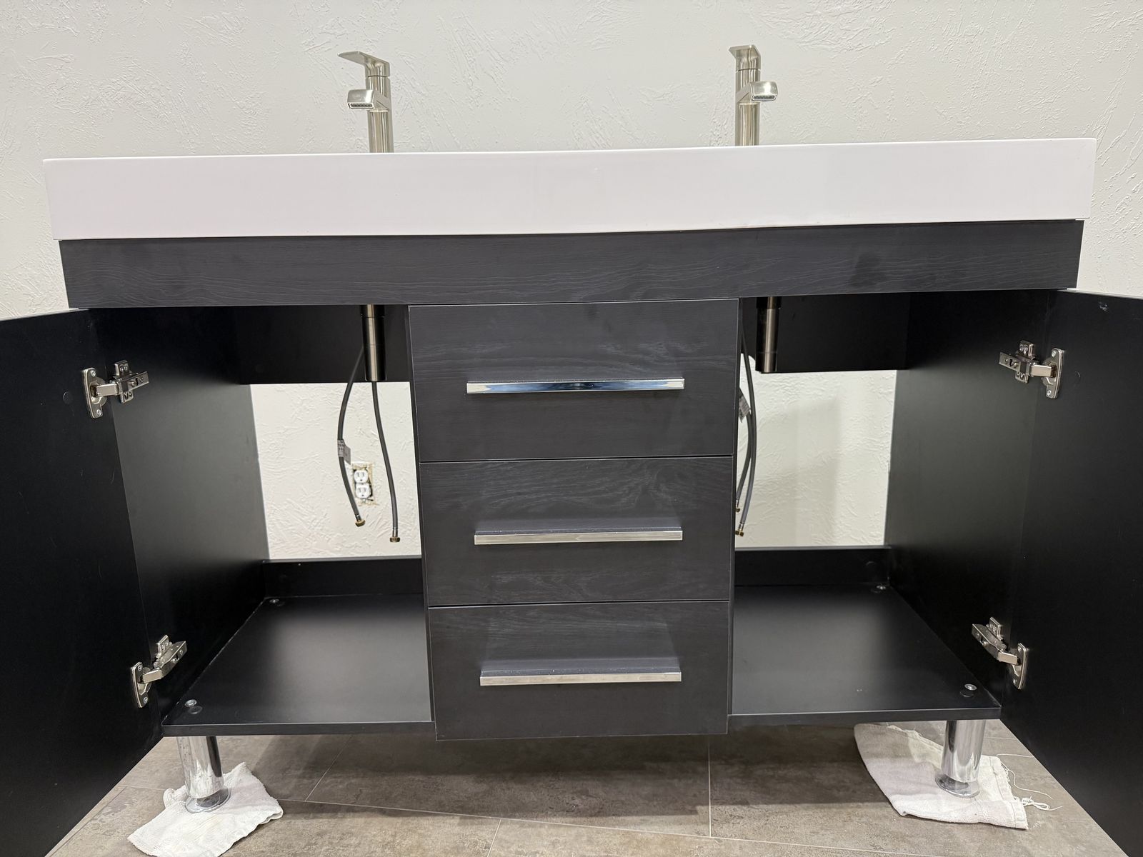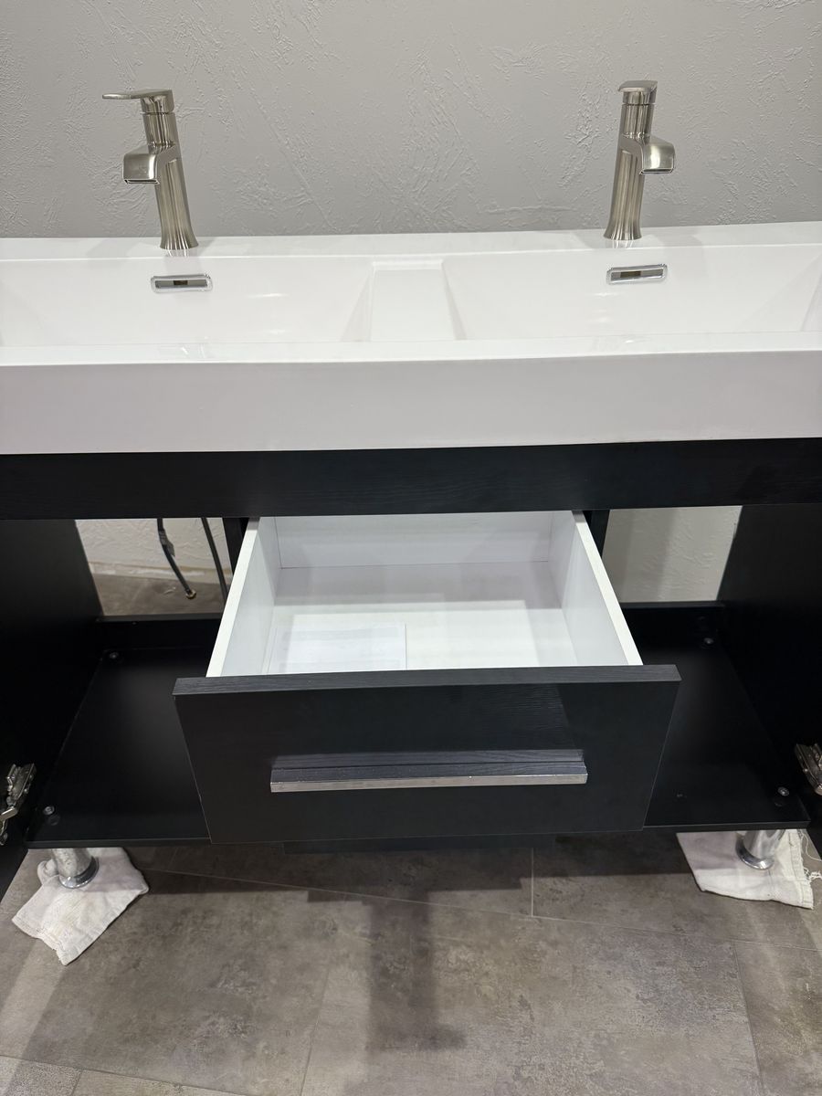 48 inch double sink vanity, faucets included. Purchased from Wayfair in 2020. Installed but never used. The tile and shower were installed incorrectly and the bathroom had to be redone. Vanity has been inside the bathroom the entire time. Was able to make room for a bigger vanity with the remodel. Paid 1200 new. Just asking $400 to get it out of the house.
