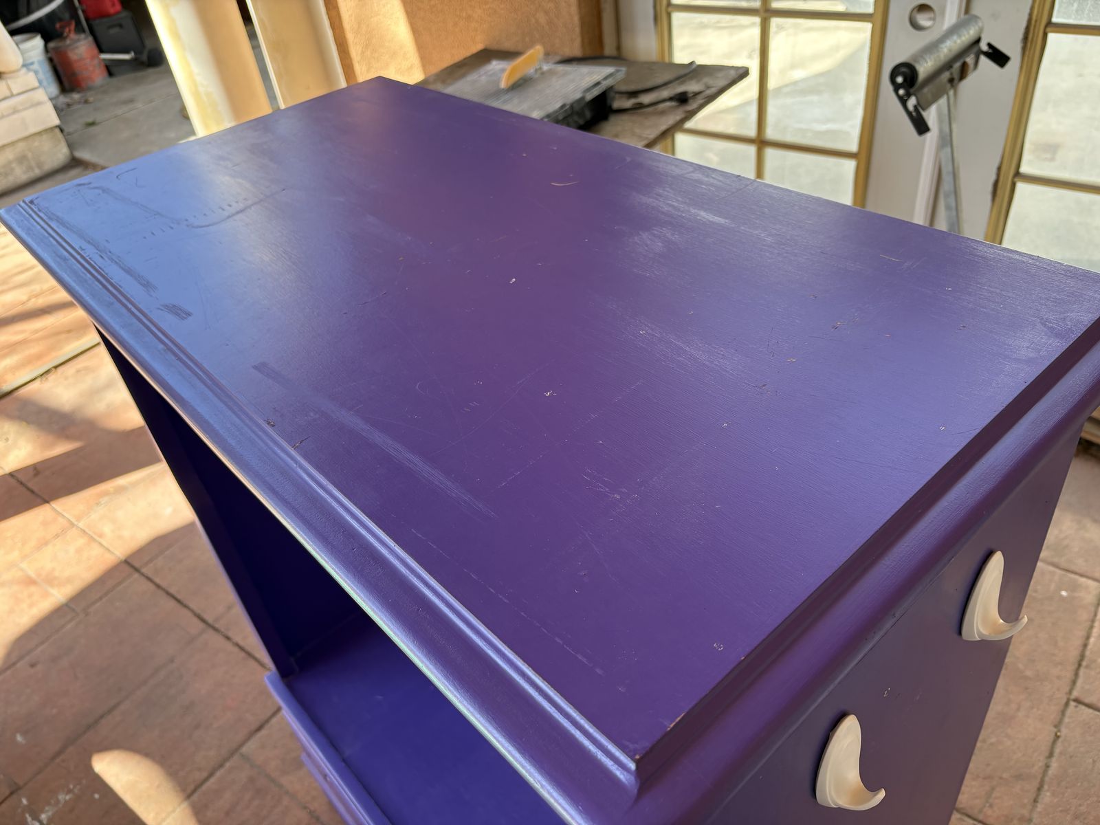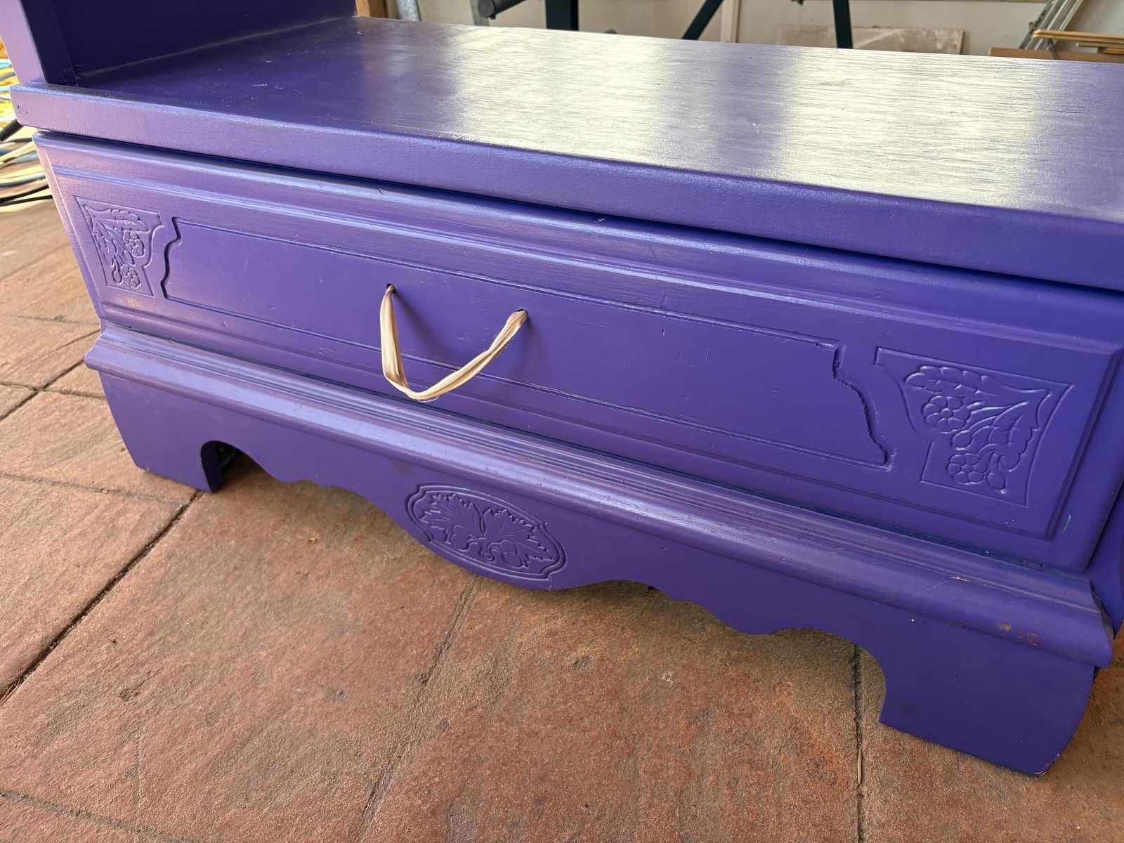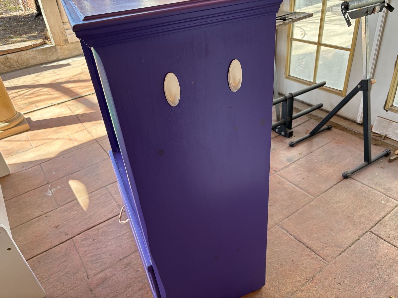 I have a cute dark purple wood cabinet for kids clothes. It was made for dress-up but could be used as a little closet too. It has a rod for hanging clothes and 2 hooks on one side. It also has a drawer at the bottom. It’s in good condition but has a little chip and spot that’s separated on the bottom of the left side (see the last picture). I’ll add the dimensions soon. See my other ads for jewelry, artwork, home decor and more.