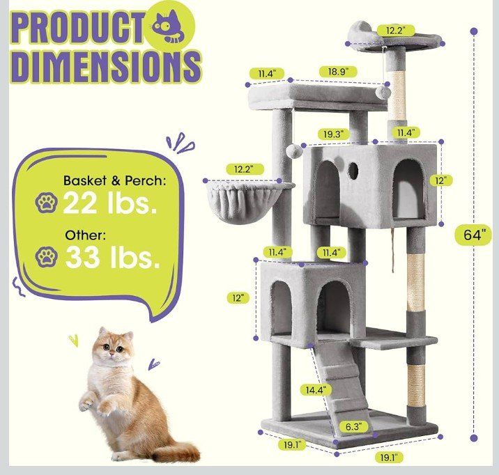 New in box WEEWAY 63in Cat Tree Tower for Indoor Cats, Multi-Level Activity Center with Unique Feline Ear-Style Perch, 2 Cozy Condos, Climbing Ladder, Sisal Scratching Posts, Hanging Balls, Grey