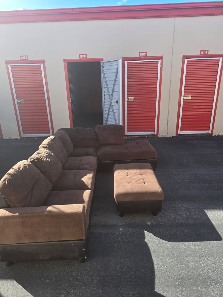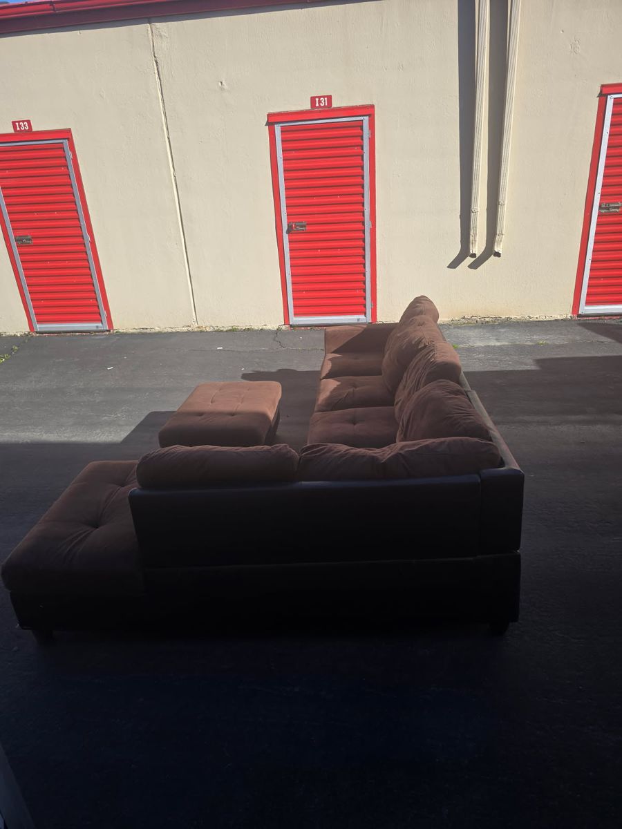 VenmoComfy oversized L-shaped sectional in brown microfiber. Includes large storage ottoman (great for blankets/toys!). In great condition!