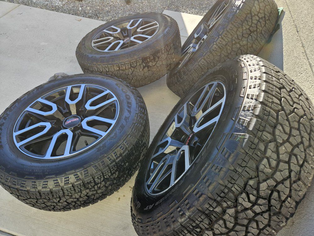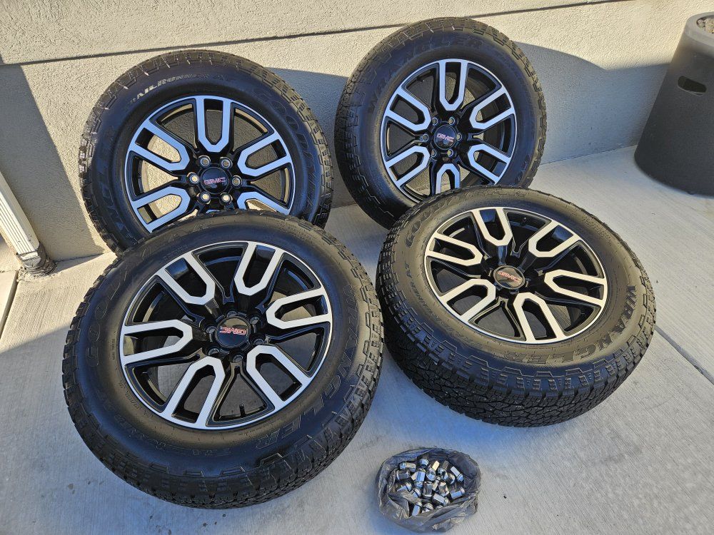 set wheels and tires 20 inch coming from my 2025 gmc sierra at4 6 lugs 6x5.5 coming with lugs nuts and tpms sensor tires have alot life left ready to roll $950