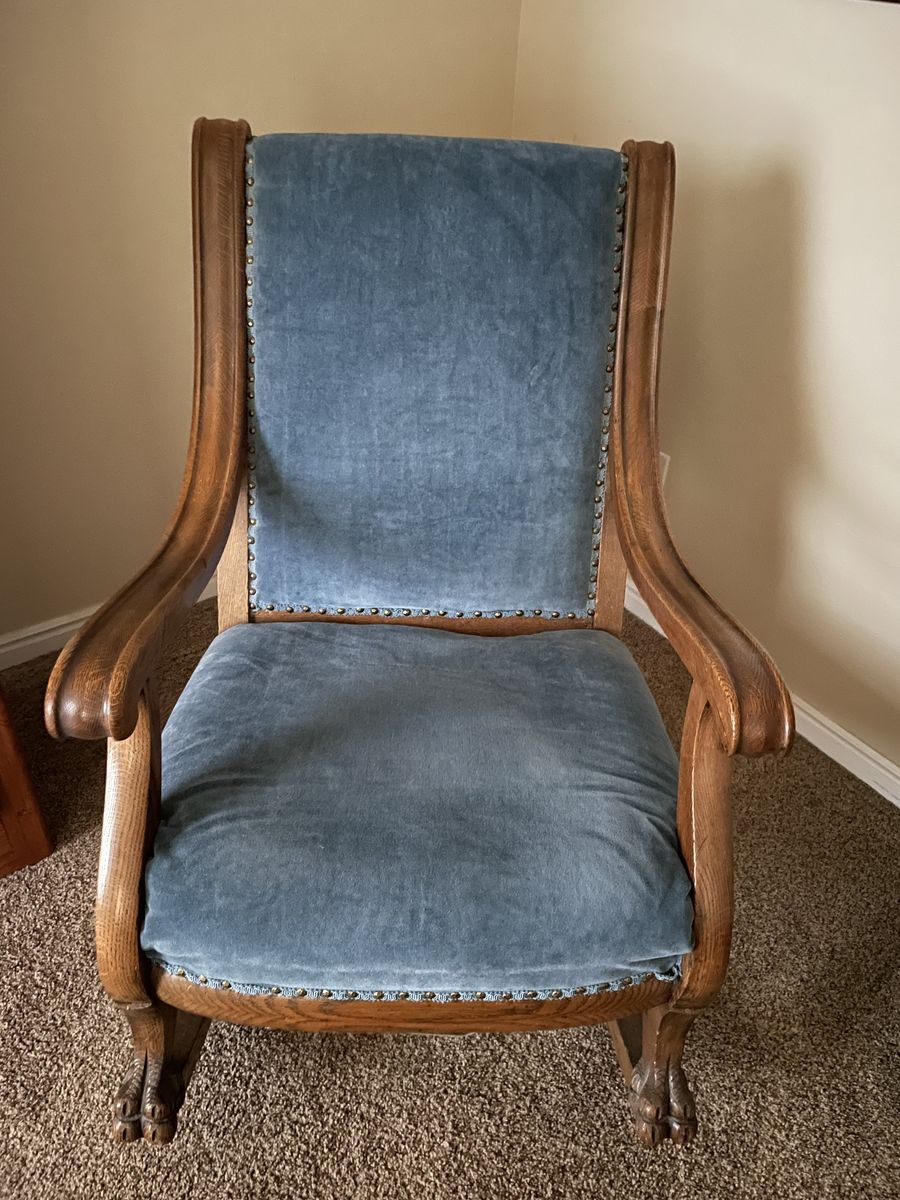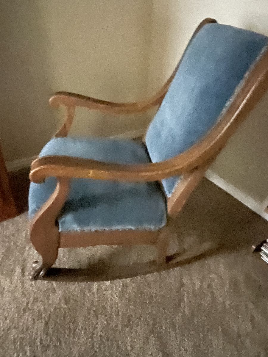 VenmoThis chair is an antique armchair rocker, often referred to as a Voltaire style, characterized by its solid wood structure and high comfortable back rest. Its design features fluid curved lines, typical of mid 19th century French furniture, specifically the Luis Philppe or Charles X periods. This rocker displays ball and claw feet. Grandparents and great grandparents rocked away in this chair.
