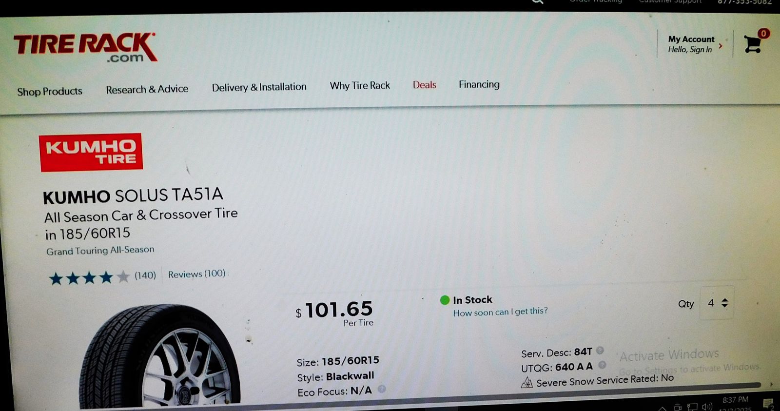 Set of 4 185 60R 15 Kumho Solus AT 51A A/S 84T all season like new $180 $45 per tire Tire Rack $102 per tire must see