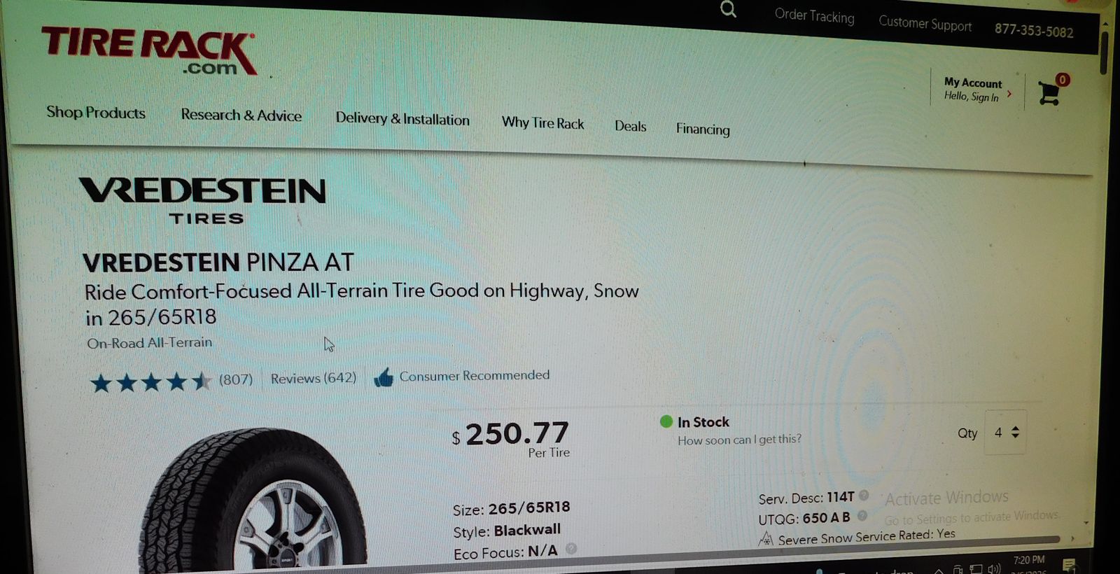 Set of 3 265 65R 18 Verdestein Pinza AT 114T good shape like new $180 $60 per tire Tire Rack $151 per tire 3 for less than price of 1
