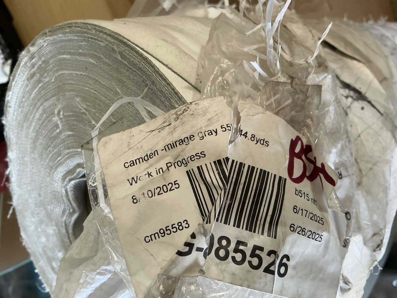 Large roll of upholstery/decor fabric labeled Camden - Mirage Gray. Neutral textured woven fabric in a soft light gray / ivory tone. Great for upholstery, cushions, chairs, benches, pillows, headboards, panels, or other sewing/decor projects.