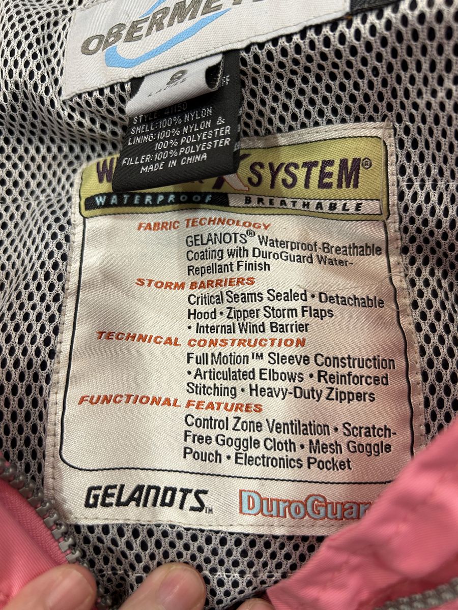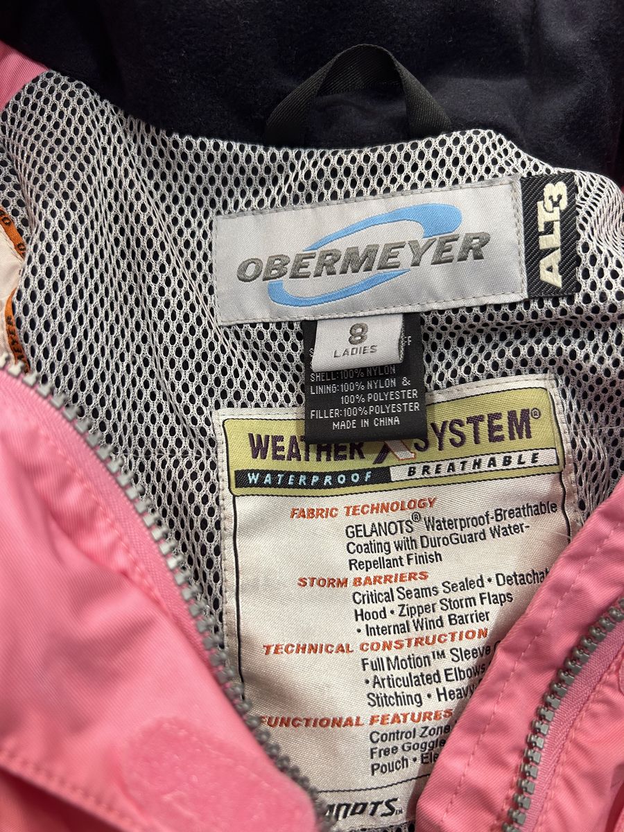 ZelleThis is a pink Obermeyer ski jacket for women in size 8. The jacket is made of softshell polyester fabric with a quilted design and down insulation. It has a mid-length and long sleeves with a zip closure. The jacket features zipped pockets, lightweight, ventilated, full zip, all seasons, and soft shell. It is suitable for travel and casual occasions and can be machine washed. The jacket is perfect for winter, fall, and spring seasons and is made in Bangladesh.