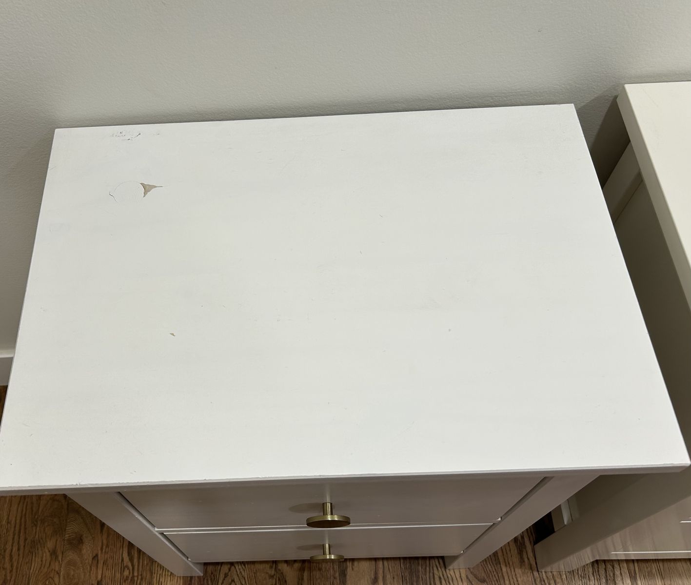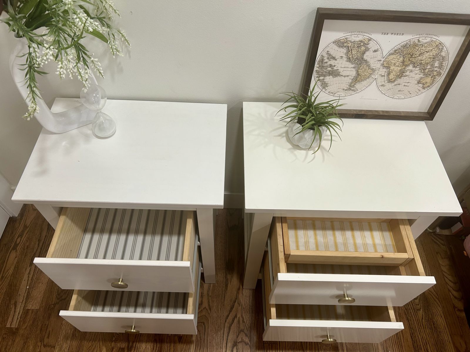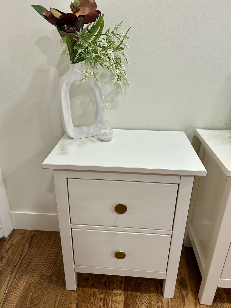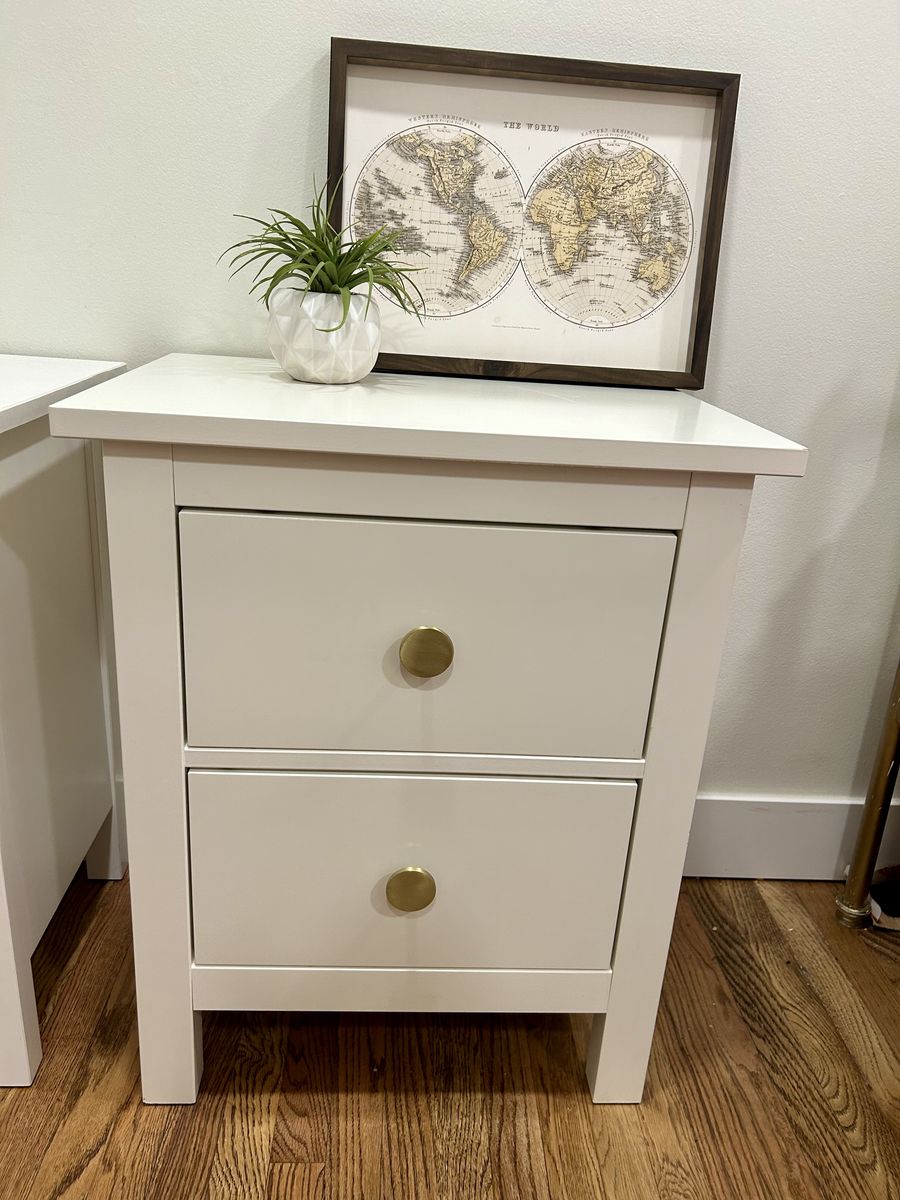 VenmoBeautiful White Coordinating Nighstands 2 drawers each. One includes an extra “hidden” drawer! Both tops have a little bit of damage, but they can easily be hidden with a lamp or decor. Drawers slide smoothly and have cute striped drawer liners! Asking $175 for both