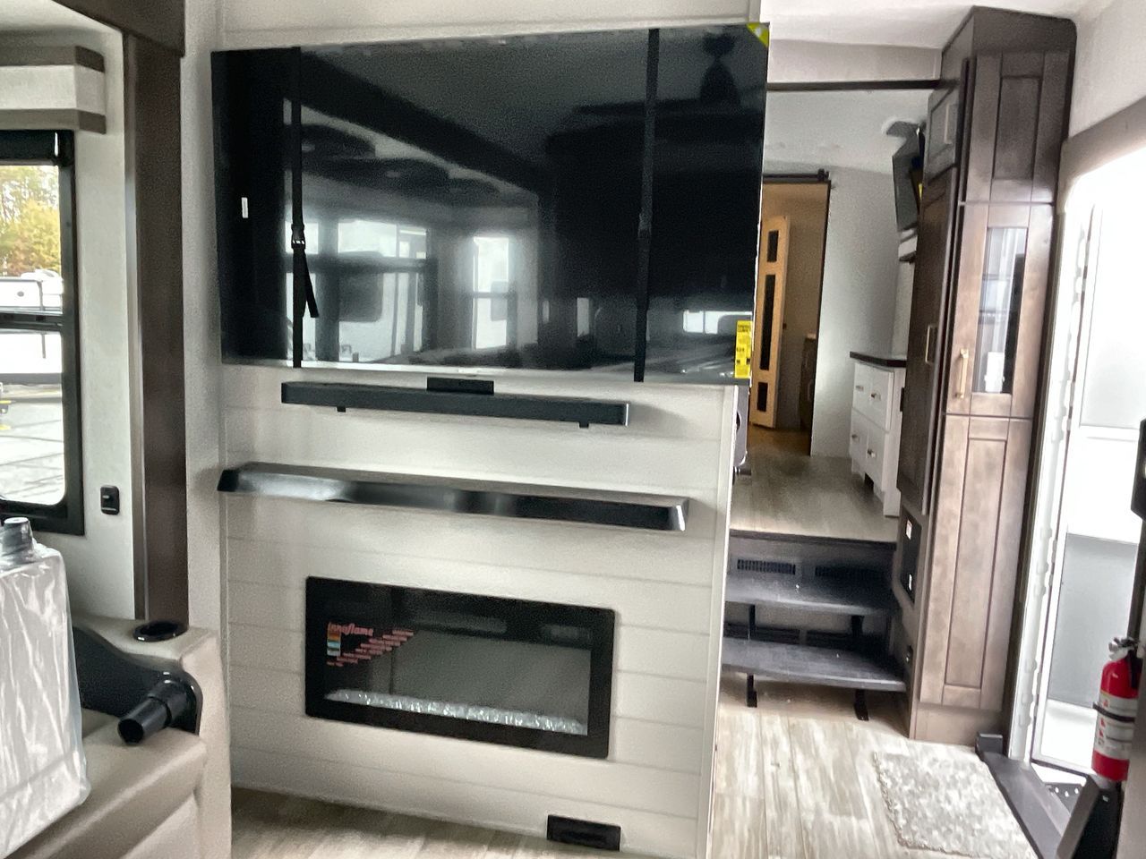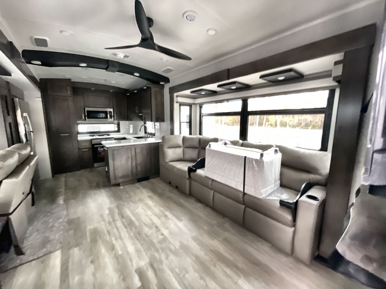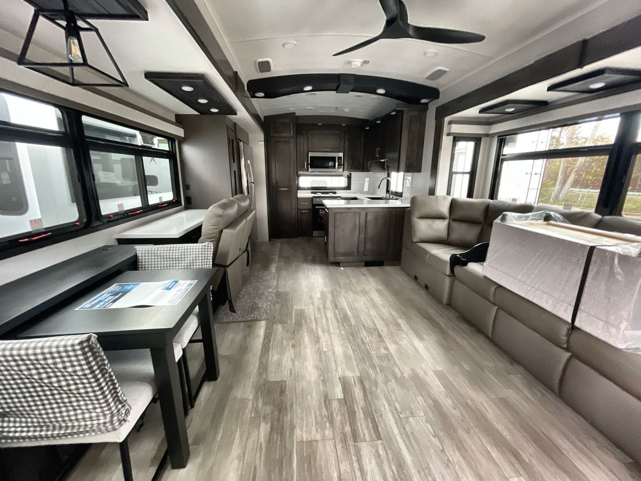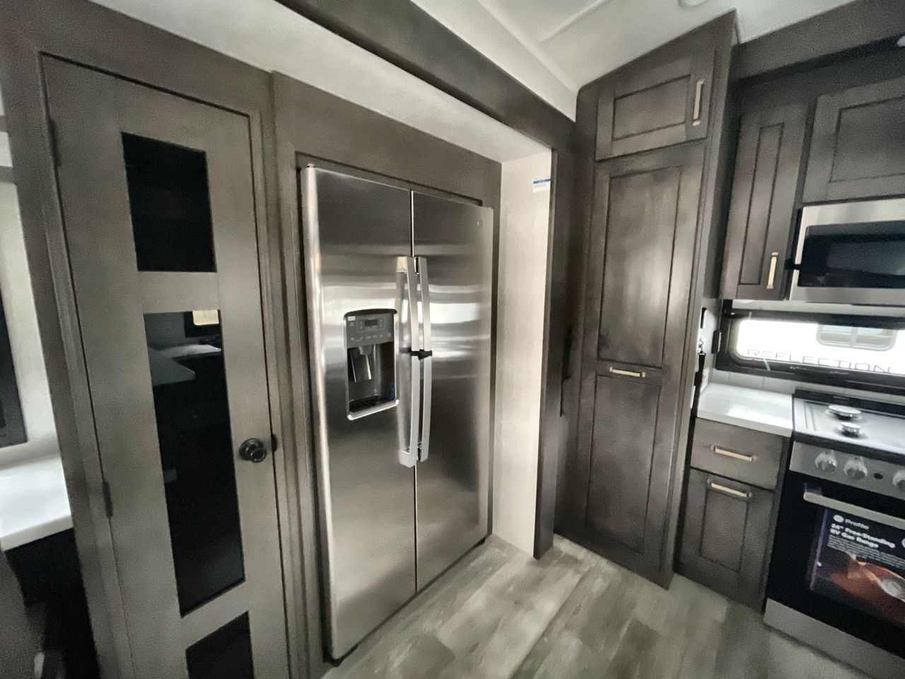 Starting from the back, this impressive 39RK features a rear kitchen designed in a convenient U-shape for easy accessibility and efficient meal prep. The kitchen is fully equipped with plenty of overhead cabinets, a convection microwave with an air fryer, a 24" range, and a pull-out pantry, perfect for the chef on the trip to cook in comfort. Across the kitchen, the large slide-out houses a 21-cu. ft. refrigerator and a second pantry with shelves, providing even more space to store groceries, snacks, and coffee essentials. The nearby desk/coffee bar and roll-out table create an inviting area to enjoy meals or unwind with a cup of coffee. The living area offers a spacious 100" L-shaped sofa and a theater seat facing the TV and fireplace, making it an ideal spot for relaxing or hosting movie nights. Moving forward, you’ll find a convenient half bathroom with linen shelves for added storage and accessibility. At the front, the private bedroom features a 72" x 80" king bed in a slide-out with a dresser across for ample storage. Finally, the full bathroom at the very front includes a 30" x 61" shower with a seat for comfort, a large sink, and a walk-in closet that provides generous space for all your clothing and gear.