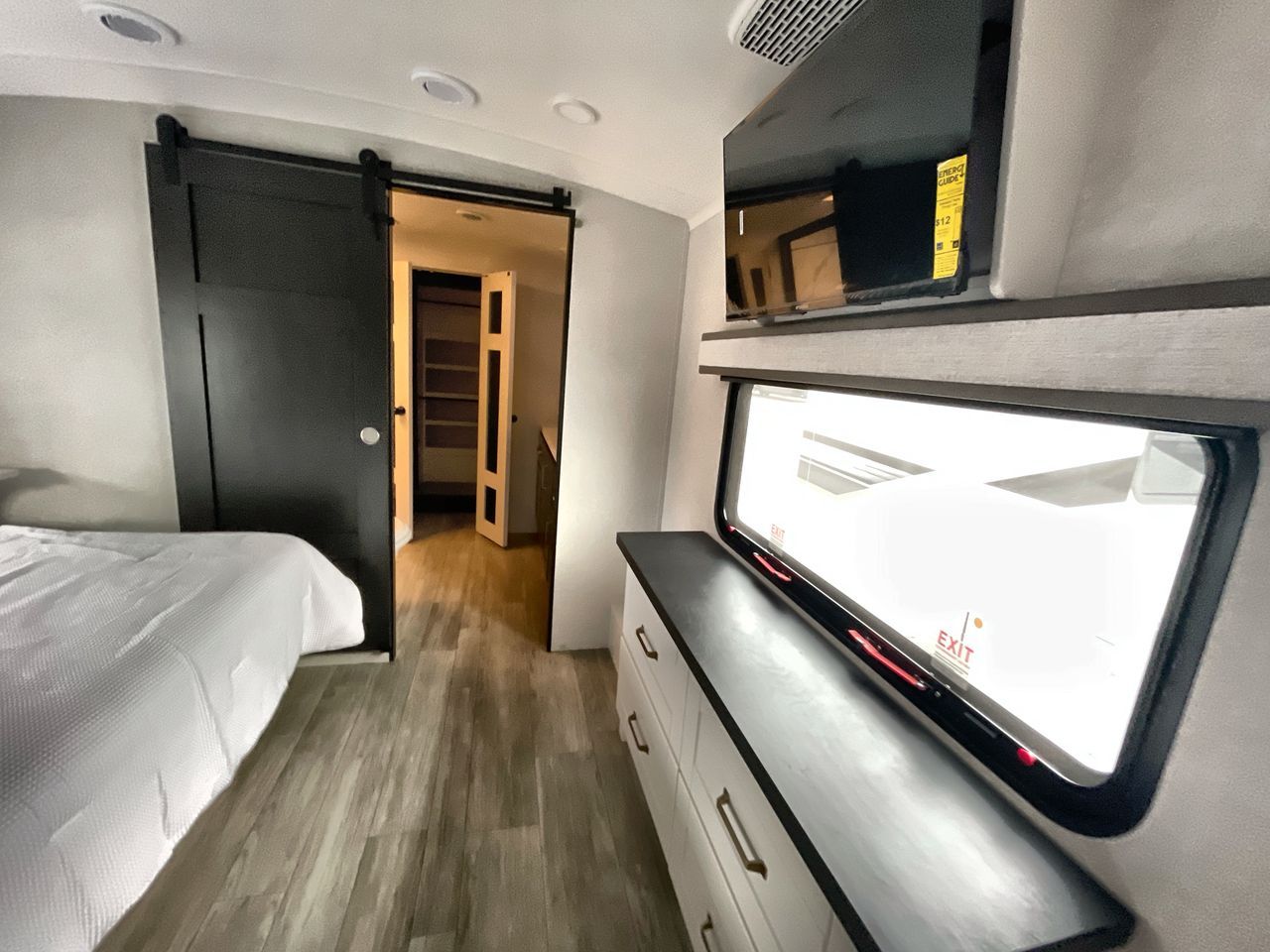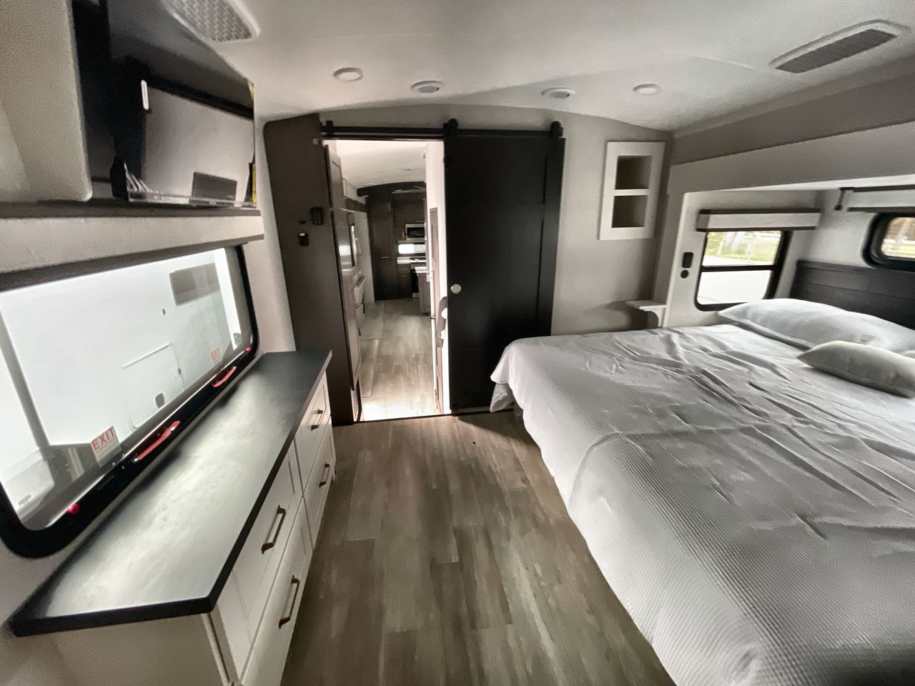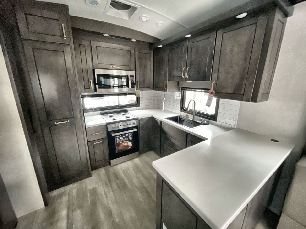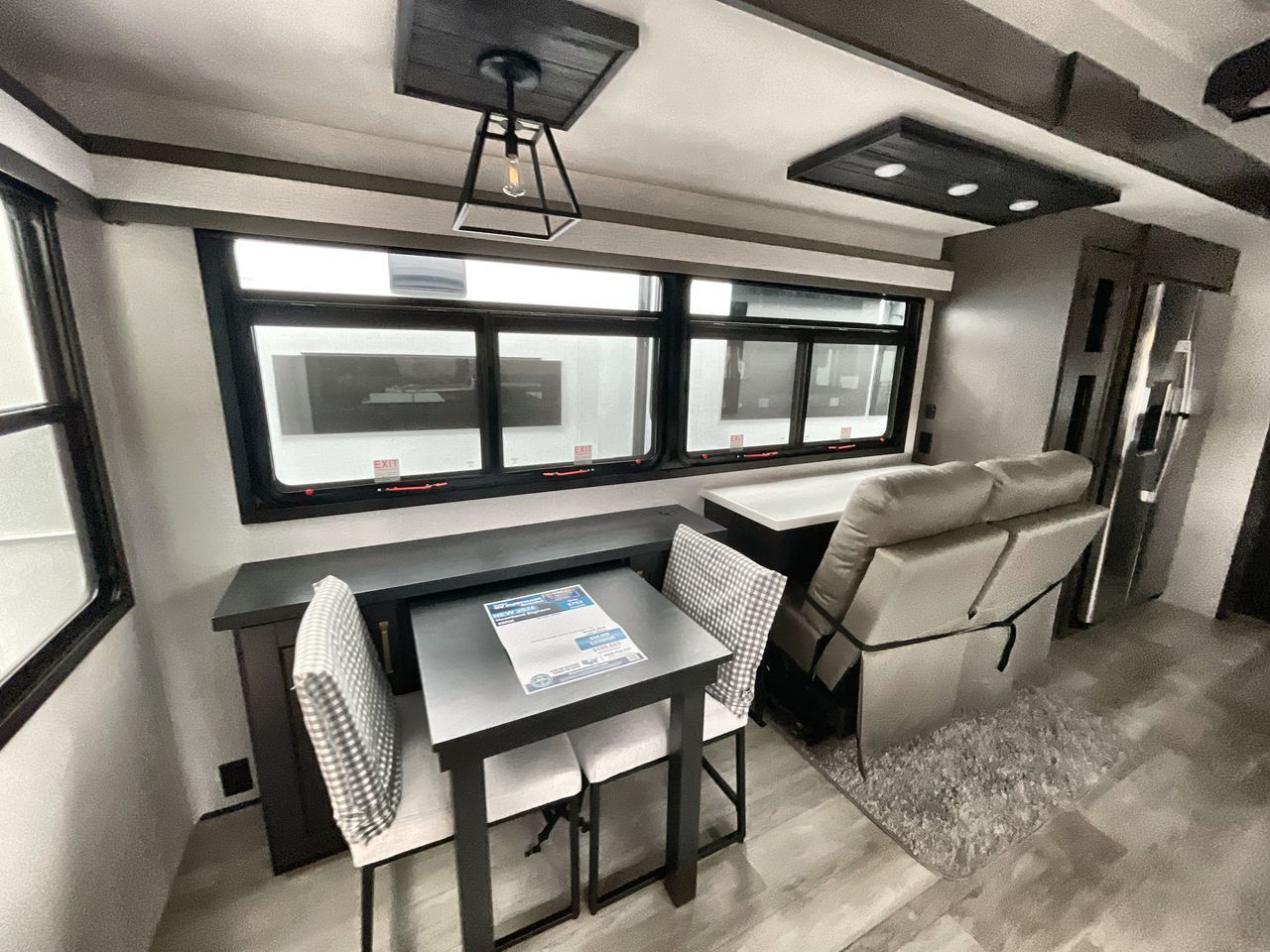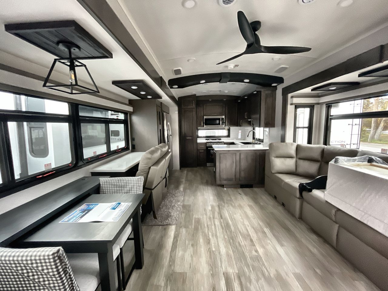 Starting from the back, this impressive 39RK features a rear kitchen designed in a convenient U-shape for easy accessibility and efficient meal prep. The kitchen is fully equipped with plenty of overhead cabinets, a convection microwave with an air fryer, a 24" range, and a pull-out pantry, perfect for the chef on the trip to cook in comfort. Across the kitchen, the large slide-out houses a 21-cu. ft. refrigerator and a second pantry with shelves, providing even more space to store groceries, snacks, and coffee essentials. The nearby desk/coffee bar and roll-out table create an inviting area to enjoy meals or unwind with a cup of coffee. The living area offers a spacious 100" L-shaped sofa and a theater seat facing the TV and fireplace, making it an ideal spot for relaxing or hosting movie nights. Moving forward, you’ll find a convenient half bathroom with linen shelves for added storage and accessibility. At the front, the private bedroom features a 72" x 80" king bed in a slide-out with a dresser across for ample storage. Finally, the full bathroom at the very front includes a 30" x 61" shower with a seat for comfort, a large sink, and a walk-in closet that provides generous space for all your clothing and gear.