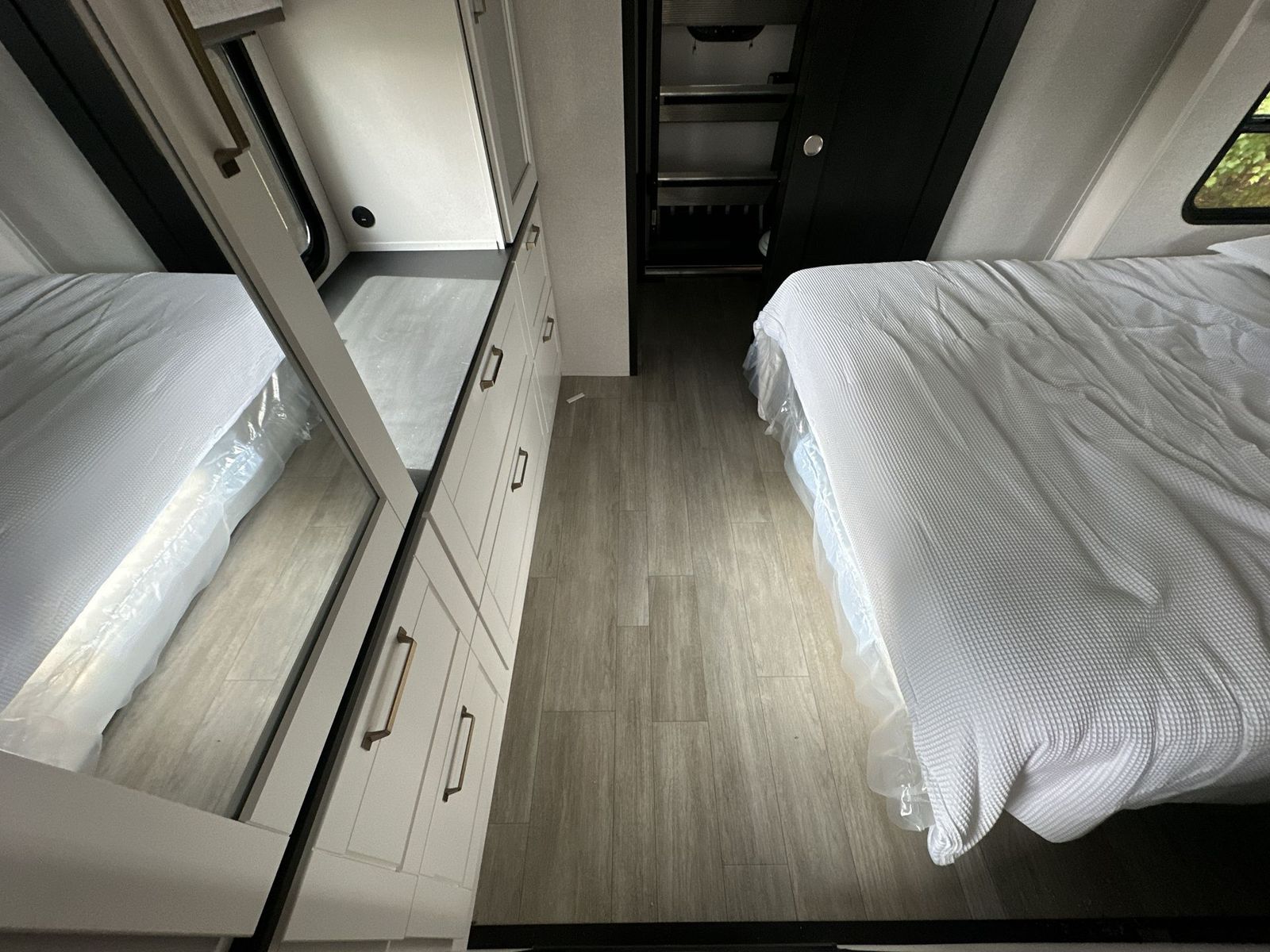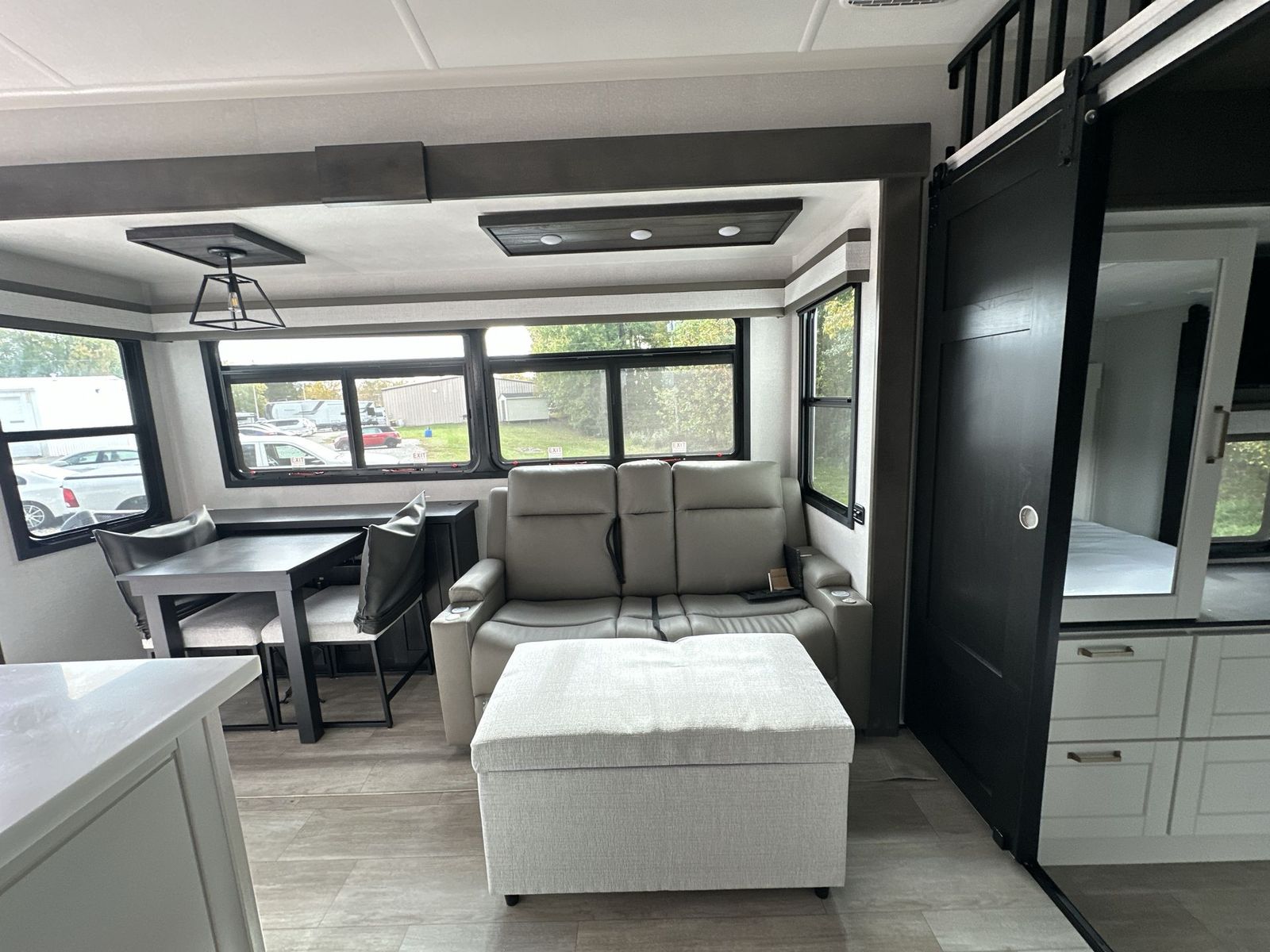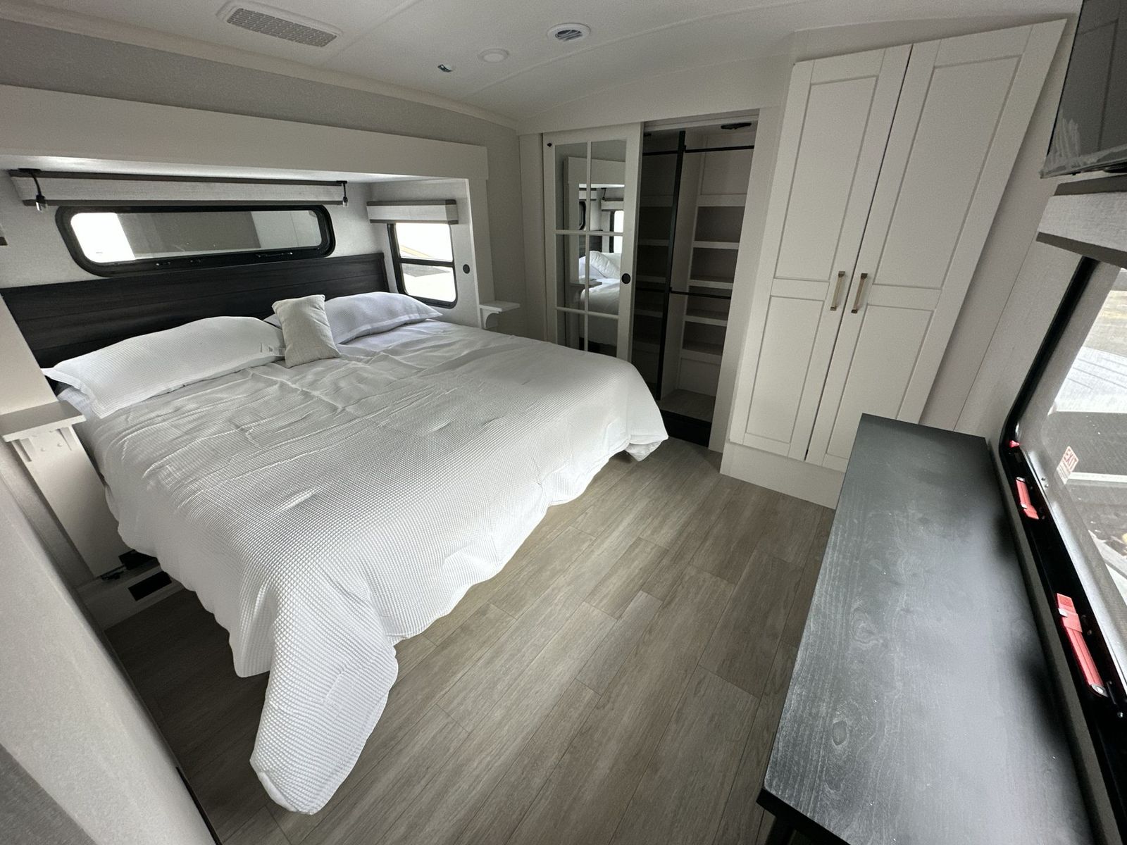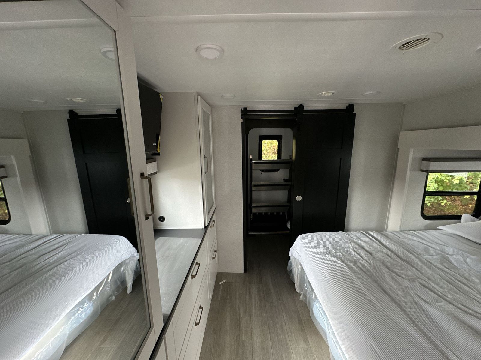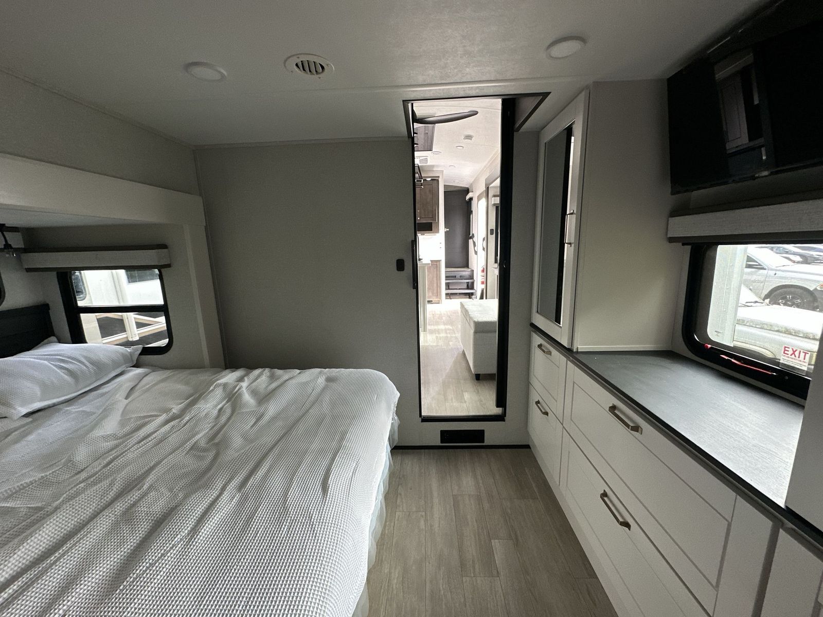 At the front of the 40DB fifth wheel, you’ll find the inviting front bedroom featuring a spacious 72" x 80" king bed, perfect for a restful night’s sleep. This room also includes a wardrobe and a flip-up dresser with a TV above, providing plenty of storage for clothing and essentials. Moving down the hall, one of two full bathrooms offers a 36" x 48" shower with a built-in seat for added accessibility, along with linen shelves for extra storage. At the center of the trailer, the main living area opens up with dual opposing slides for maximum comfort and room to move. One slide houses a 21-cu. ft. residential refrigerator and a 30" space-saving convection microwave with a built-in air fryer, while the central kitchen island includes a sink and pull-out cutting board, everything you need to prepare meals on the go. Across the way, the opposite slide features a roll-out table and theater seating, creating the perfect space to dine and relax after a long day. At the rear, the second bedroom includes a 60" x 80" queen bed in a slide-out with two wardrobes opposite for ample storage, plus a private full bathroom complete with a tub/shower combo and its own exterior exit for added convenience. Above it all, the loft provides three 30" x 80" bed mats and a loft cabinet, offering extra-sleeping space or additional storage for the whole family’s adventures.