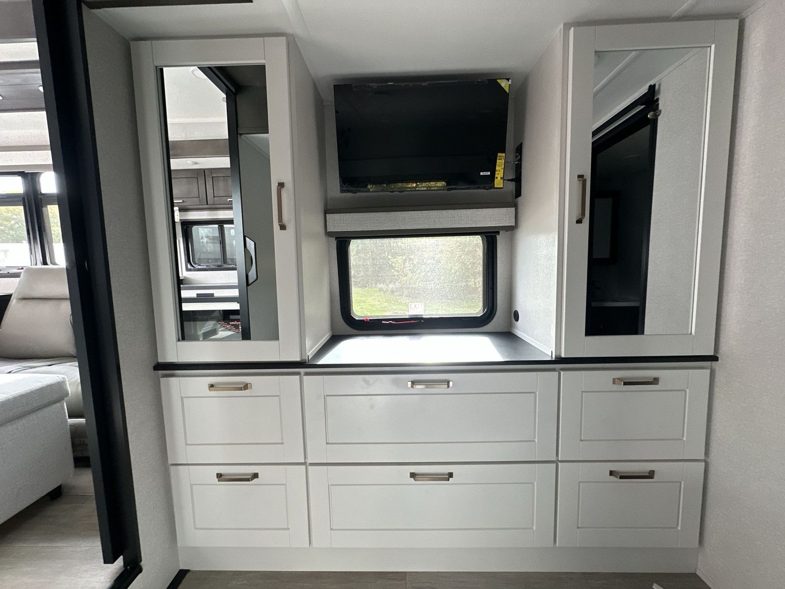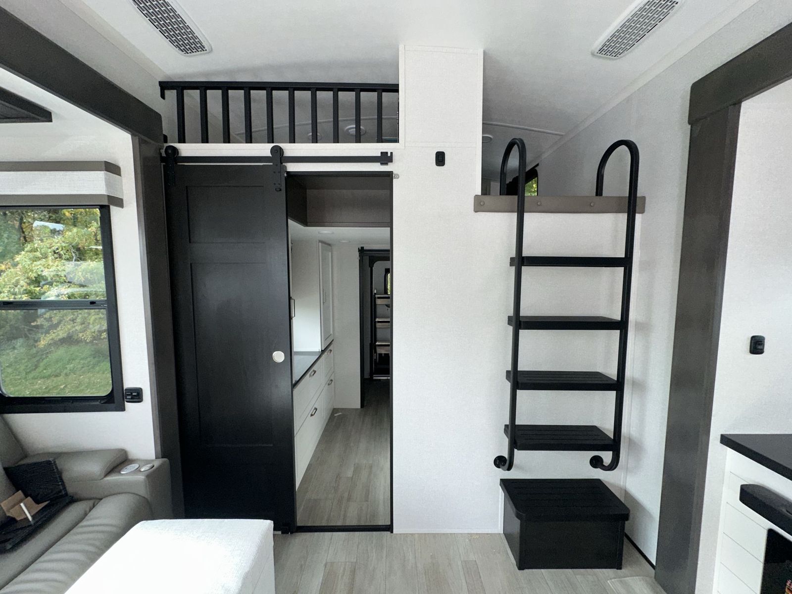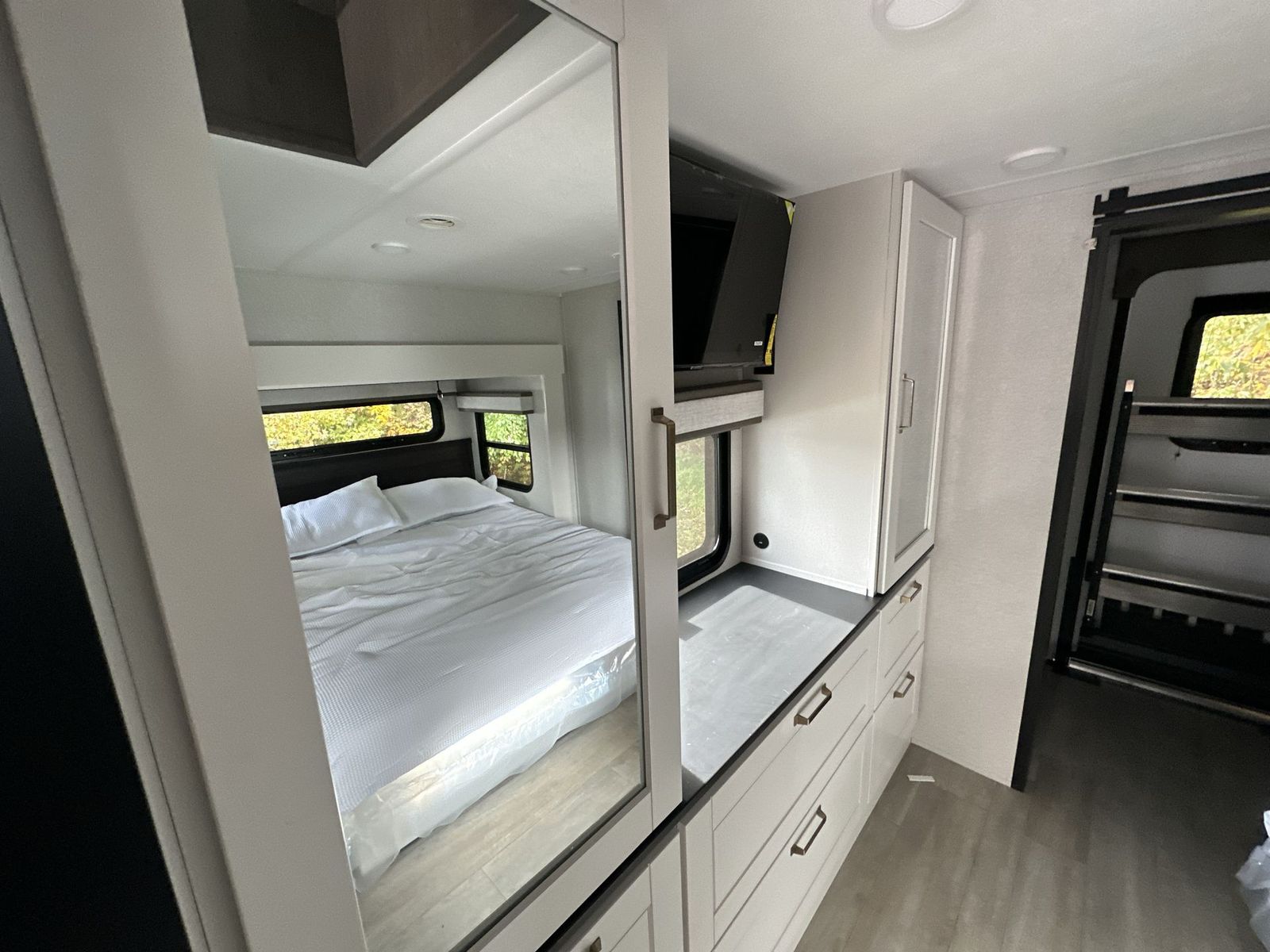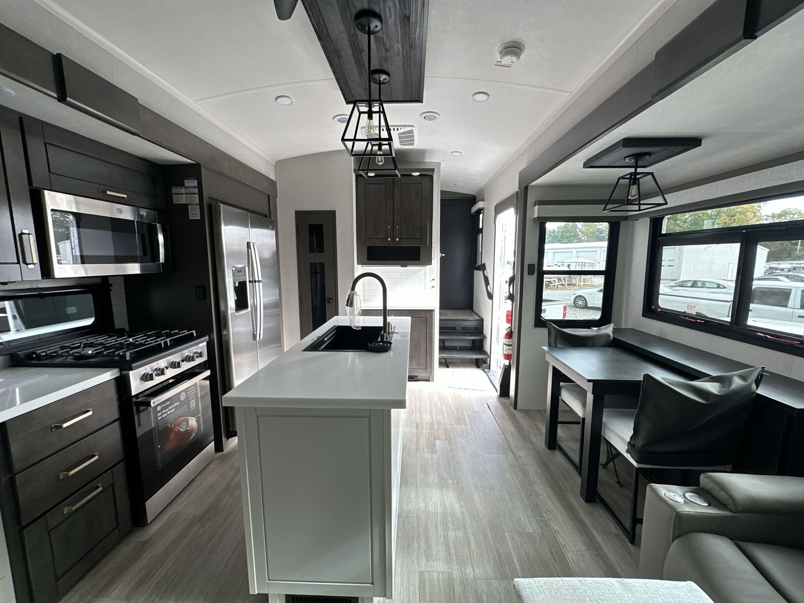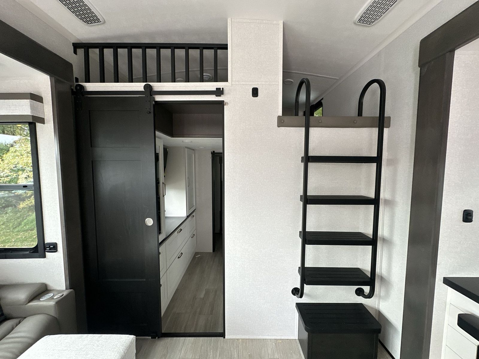 At the front of the 40DB fifth wheel, you’ll find the inviting front bedroom featuring a spacious 72" x 80" king bed, perfect for a restful night’s sleep. This room also includes a wardrobe and a flip-up dresser with a TV above, providing plenty of storage for clothing and essentials. Moving down the hall, one of two full bathrooms offers a 36" x 48" shower with a built-in seat for added accessibility, along with linen shelves for extra storage. At the center of the trailer, the main living area opens up with dual opposing slides for maximum comfort and room to move. One slide houses a 21-cu. ft. residential refrigerator and a 30" space-saving convection microwave with a built-in air fryer, while the central kitchen island includes a sink and pull-out cutting board, everything you need to prepare meals on the go. Across the way, the opposite slide features a roll-out table and theater seating, creating the perfect space to dine and relax after a long day. At the rear, the second bedroom includes a 60" x 80" queen bed in a slide-out with two wardrobes opposite for ample storage, plus a private full bathroom complete with a tub/shower combo and its own exterior exit for added convenience. Above it all, the loft provides three 30" x 80" bed mats and a loft cabinet, offering extra-sleeping space or additional storage for the whole family’s adventures.