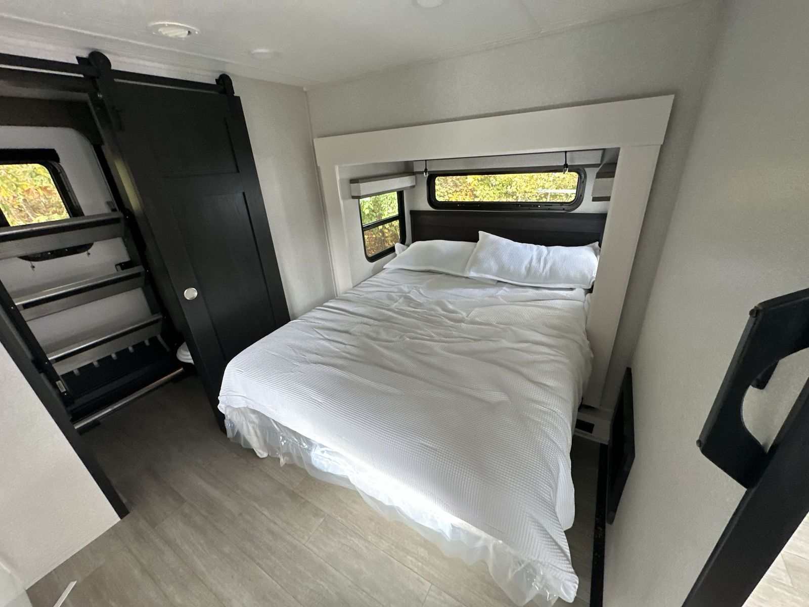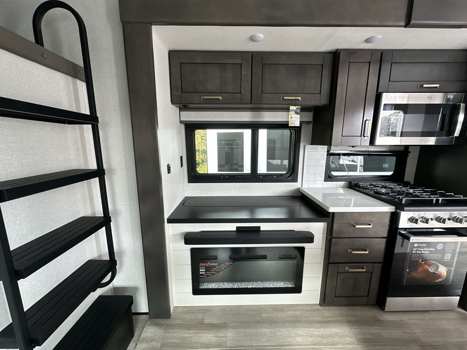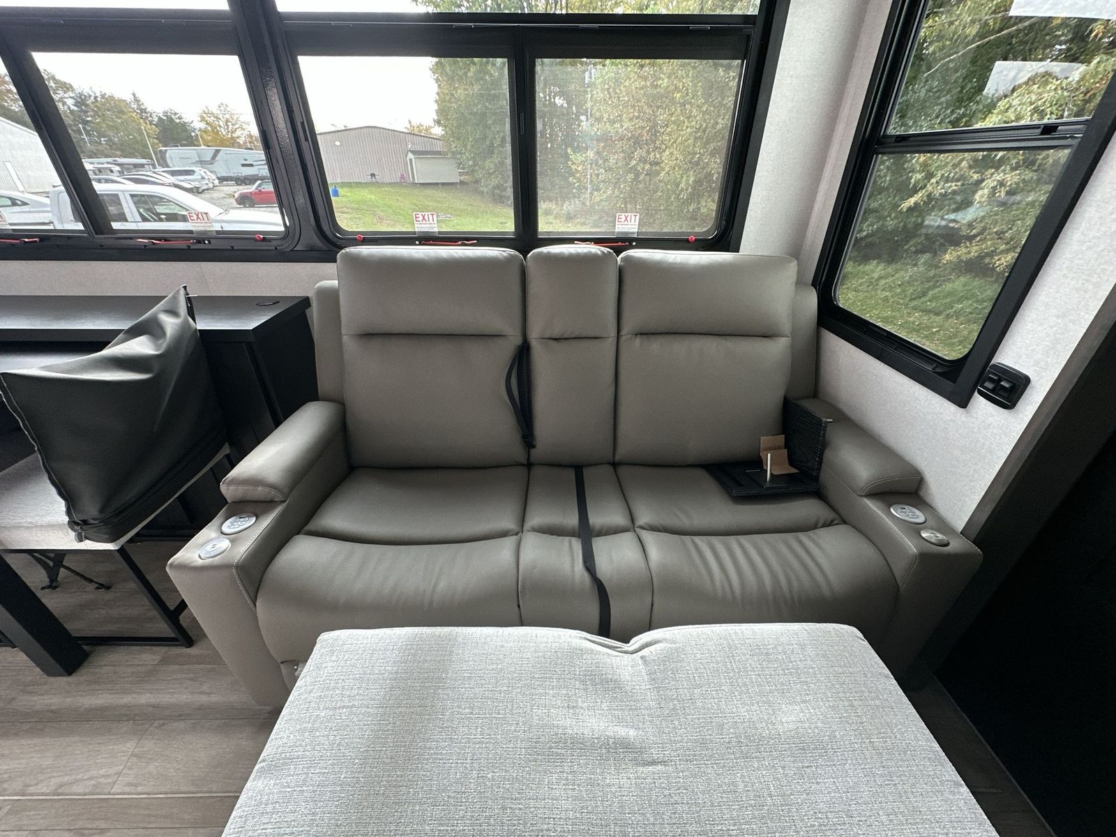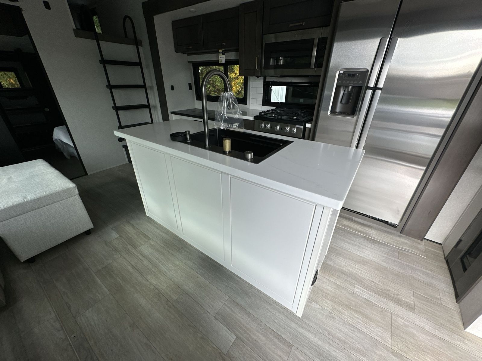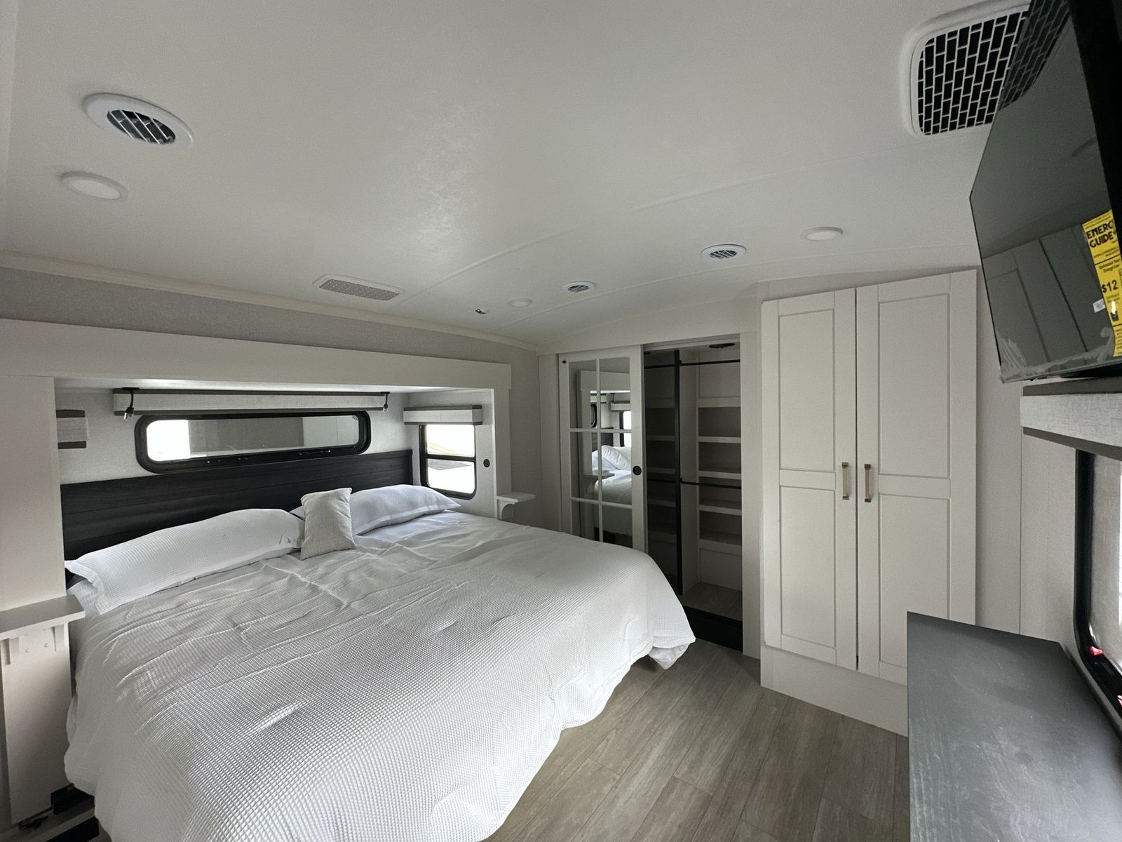 At the front of the 40DB fifth wheel, you’ll find the inviting front bedroom featuring a spacious 72" x 80" king bed, perfect for a restful night’s sleep. This room also includes a wardrobe and a flip-up dresser with a TV above, providing plenty of storage for clothing and essentials. Moving down the hall, one of two full bathrooms offers a 36" x 48" shower with a built-in seat for added accessibility, along with linen shelves for extra storage. At the center of the trailer, the main living area opens up with dual opposing slides for maximum comfort and room to move. One slide houses a 21-cu. ft. residential refrigerator and a 30" space-saving convection microwave with a built-in air fryer, while the central kitchen island includes a sink and pull-out cutting board, everything you need to prepare meals on the go. Across the way, the opposite slide features a roll-out table and theater seating, creating the perfect space to dine and relax after a long day. At the rear, the second bedroom includes a 60" x 80" queen bed in a slide-out with two wardrobes opposite for ample storage, plus a private full bathroom complete with a tub/shower combo and its own exterior exit for added convenience. Above it all, the loft provides three 30" x 80" bed mats and a loft cabinet, offering extra-sleeping space or additional storage for the whole family’s adventures.