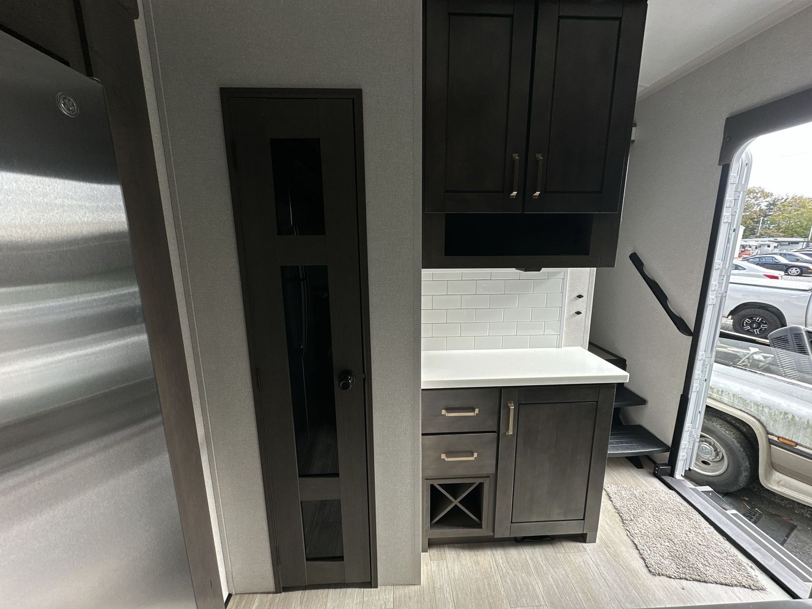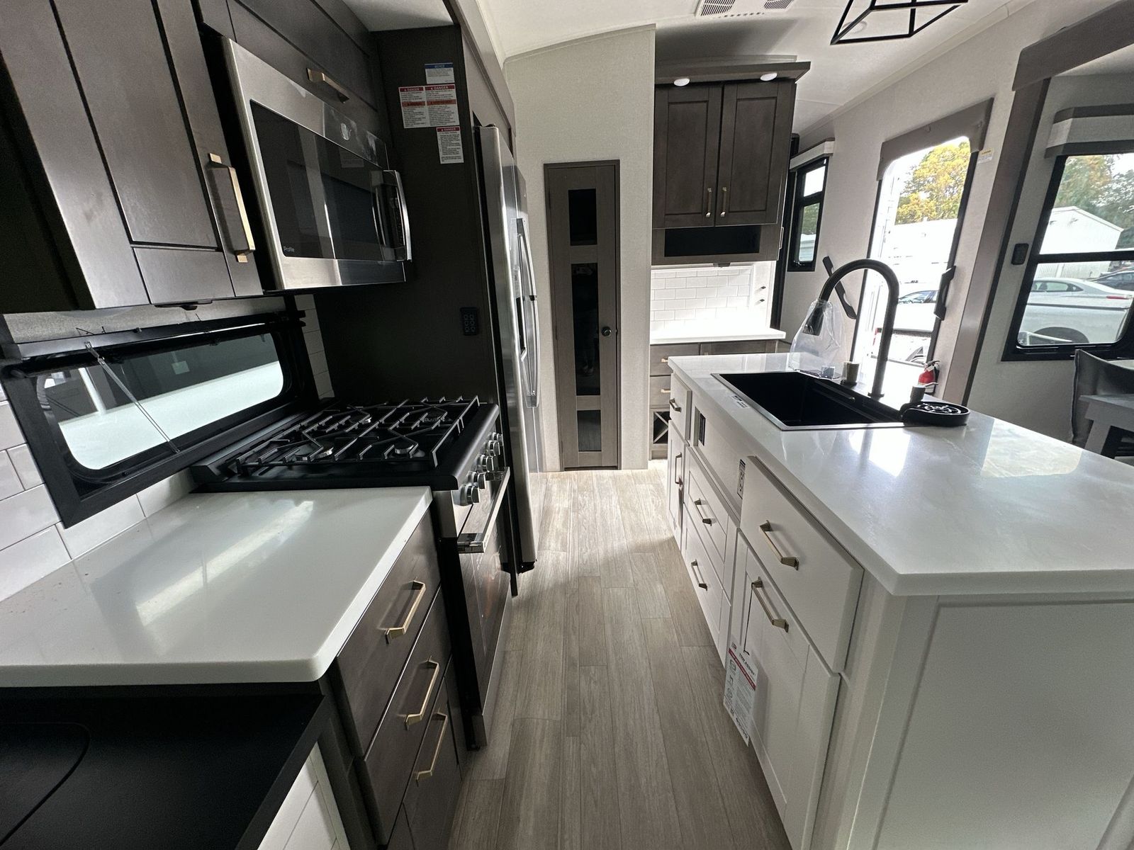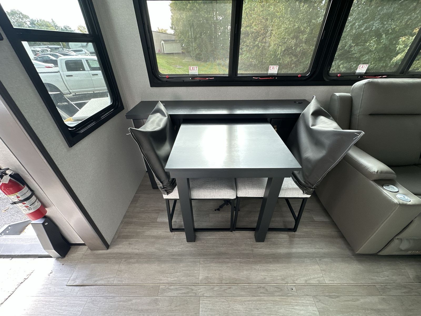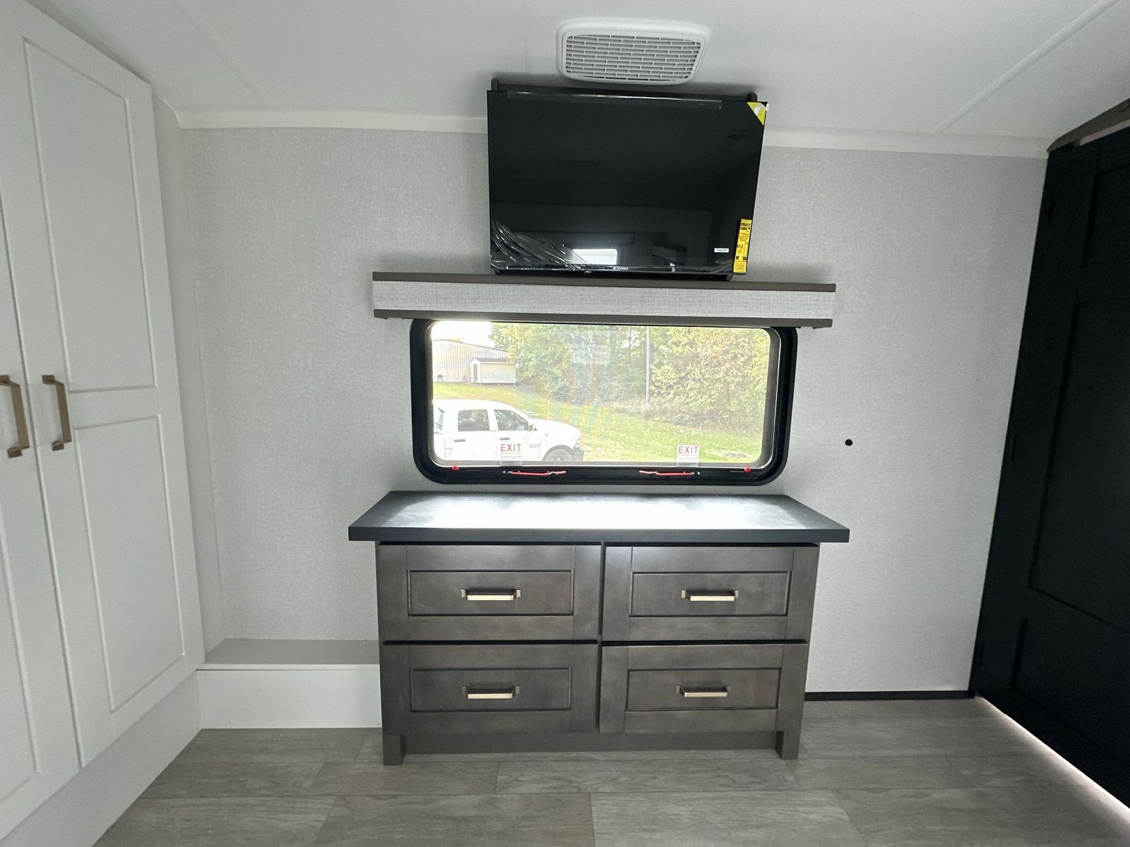 At the front of the 40DB fifth wheel, you’ll find the inviting front bedroom featuring a spacious 72" x 80" king bed, perfect for a restful night’s sleep. This room also includes a wardrobe and a flip-up dresser with a TV above, providing plenty of storage for clothing and essentials. Moving down the hall, one of two full bathrooms offers a 36" x 48" shower with a built-in seat for added accessibility, along with linen shelves for extra storage. At the center of the trailer, the main living area opens up with dual opposing slides for maximum comfort and room to move. One slide houses a 21-cu. ft. residential refrigerator and a 30" space-saving convection microwave with a built-in air fryer, while the central kitchen island includes a sink and pull-out cutting board, everything you need to prepare meals on the go. Across the way, the opposite slide features a roll-out table and theater seating, creating the perfect space to dine and relax after a long day. At the rear, the second bedroom includes a 60" x 80" queen bed in a slide-out with two wardrobes opposite for ample storage, plus a private full bathroom complete with a tub/shower combo and its own exterior exit for added convenience. Above it all, the loft provides three 30" x 80" bed mats and a loft cabinet, offering extra-sleeping space or additional storage for the whole family’s adventures.