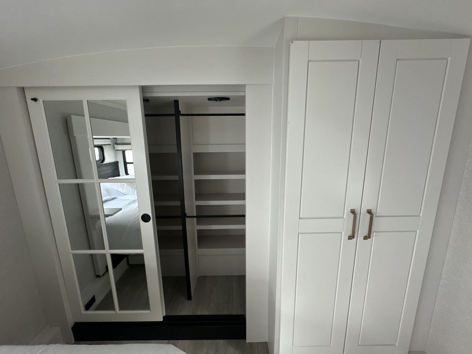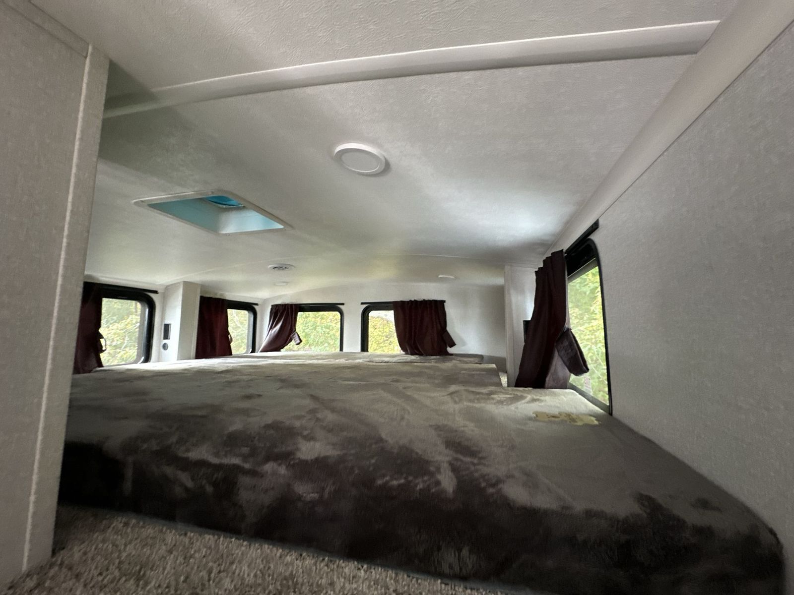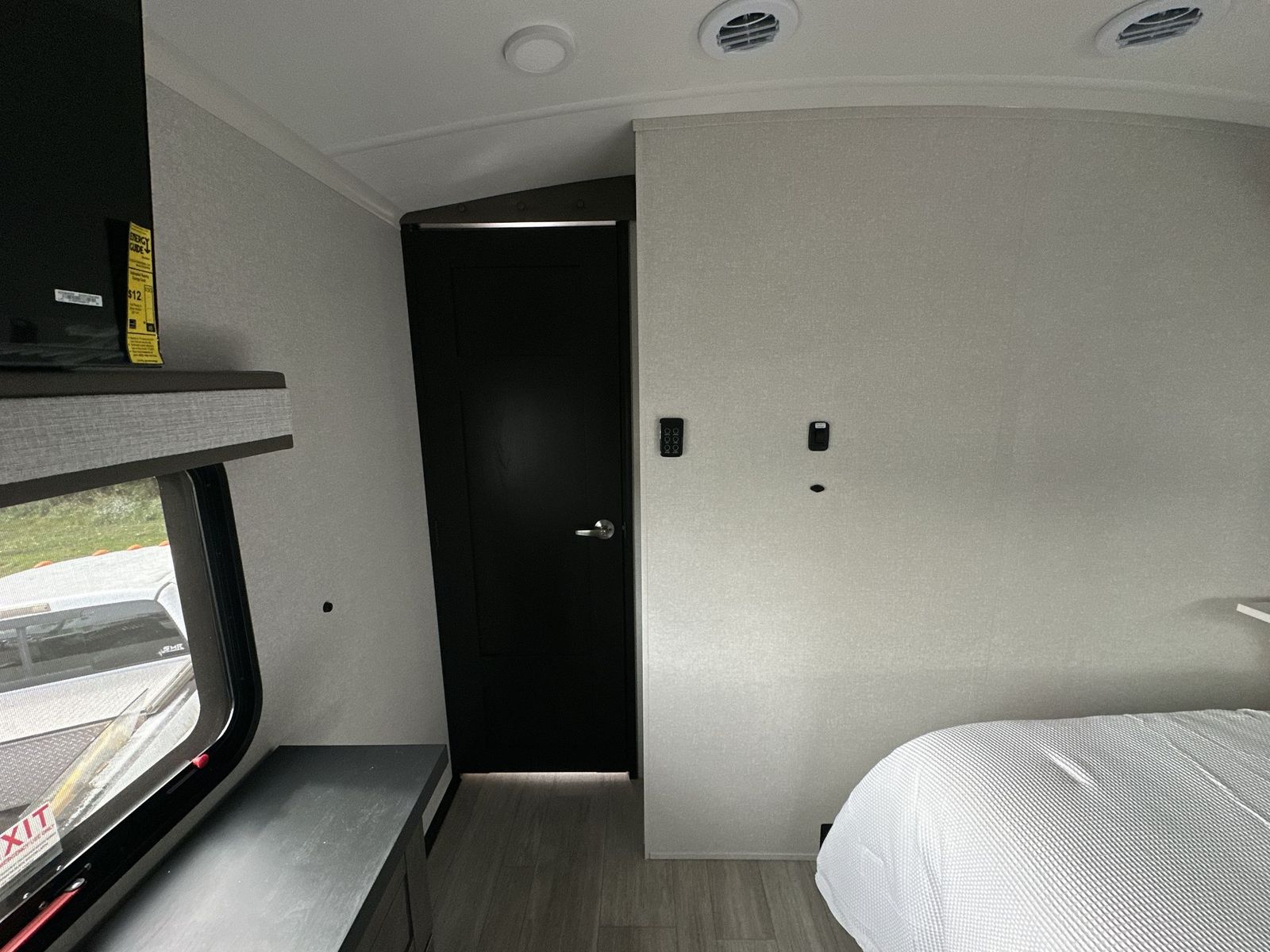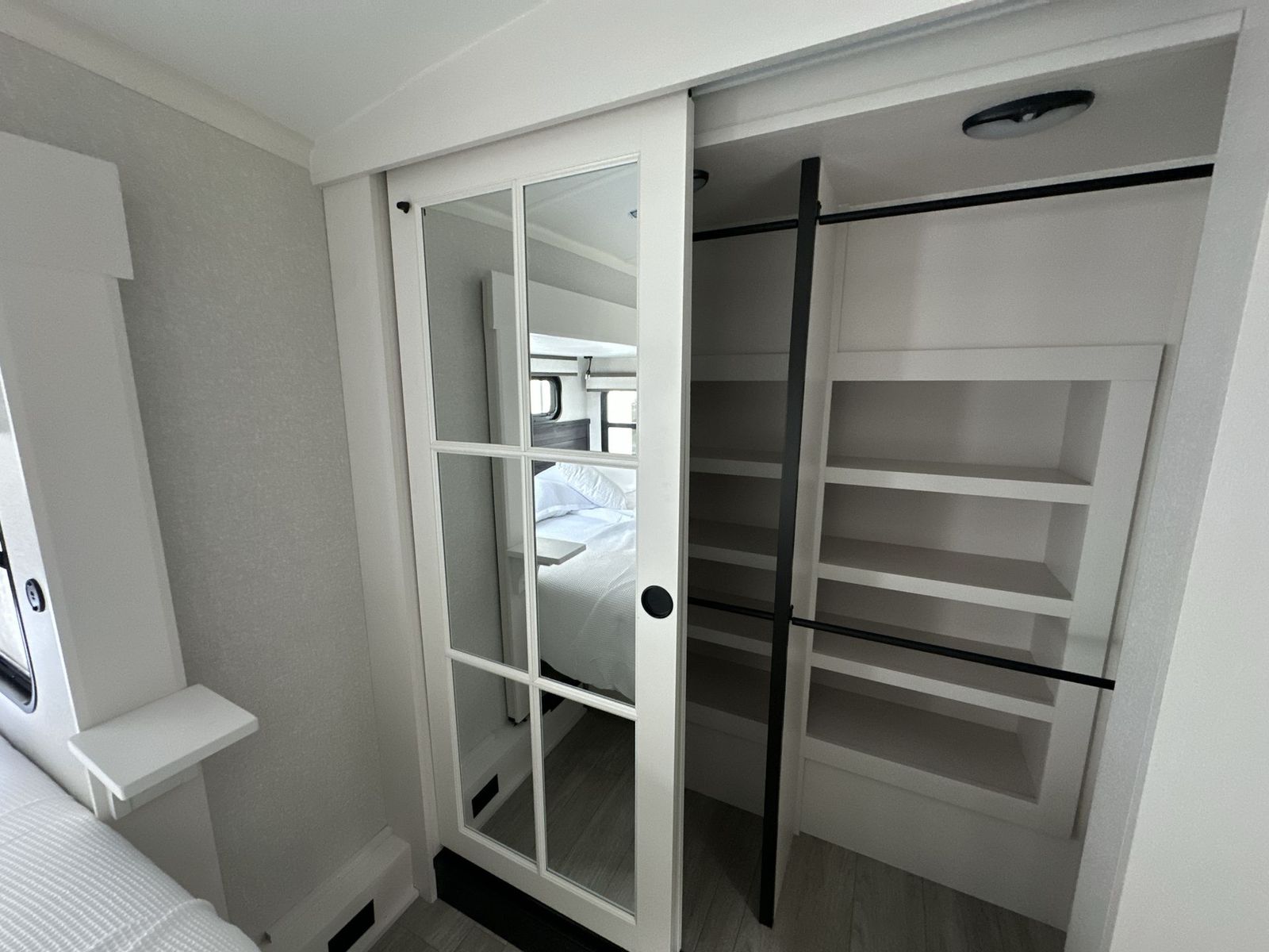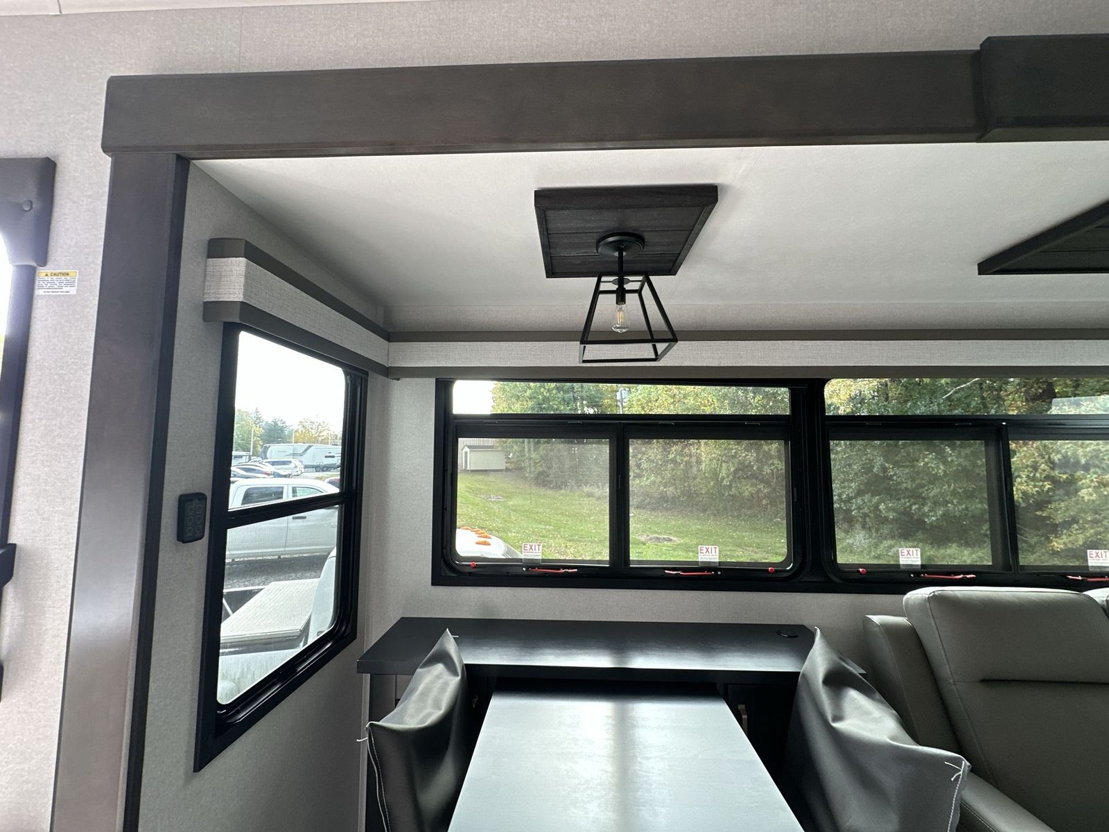 At the front of the 40DB fifth wheel, you’ll find the inviting front bedroom featuring a spacious 72" x 80" king bed, perfect for a restful night’s sleep. This room also includes a wardrobe and a flip-up dresser with a TV above, providing plenty of storage for clothing and essentials. Moving down the hall, one of two full bathrooms offers a 36" x 48" shower with a built-in seat for added accessibility, along with linen shelves for extra storage. At the center of the trailer, the main living area opens up with dual opposing slides for maximum comfort and room to move. One slide houses a 21-cu. ft. residential refrigerator and a 30" space-saving convection microwave with a built-in air fryer, while the central kitchen island includes a sink and pull-out cutting board, everything you need to prepare meals on the go. Across the way, the opposite slide features a roll-out table and theater seating, creating the perfect space to dine and relax after a long day. At the rear, the second bedroom includes a 60" x 80" queen bed in a slide-out with two wardrobes opposite for ample storage, plus a private full bathroom complete with a tub/shower combo and its own exterior exit for added convenience. Above it all, the loft provides three 30" x 80" bed mats and a loft cabinet, offering extra-sleeping space or additional storage for the whole family’s adventures.
