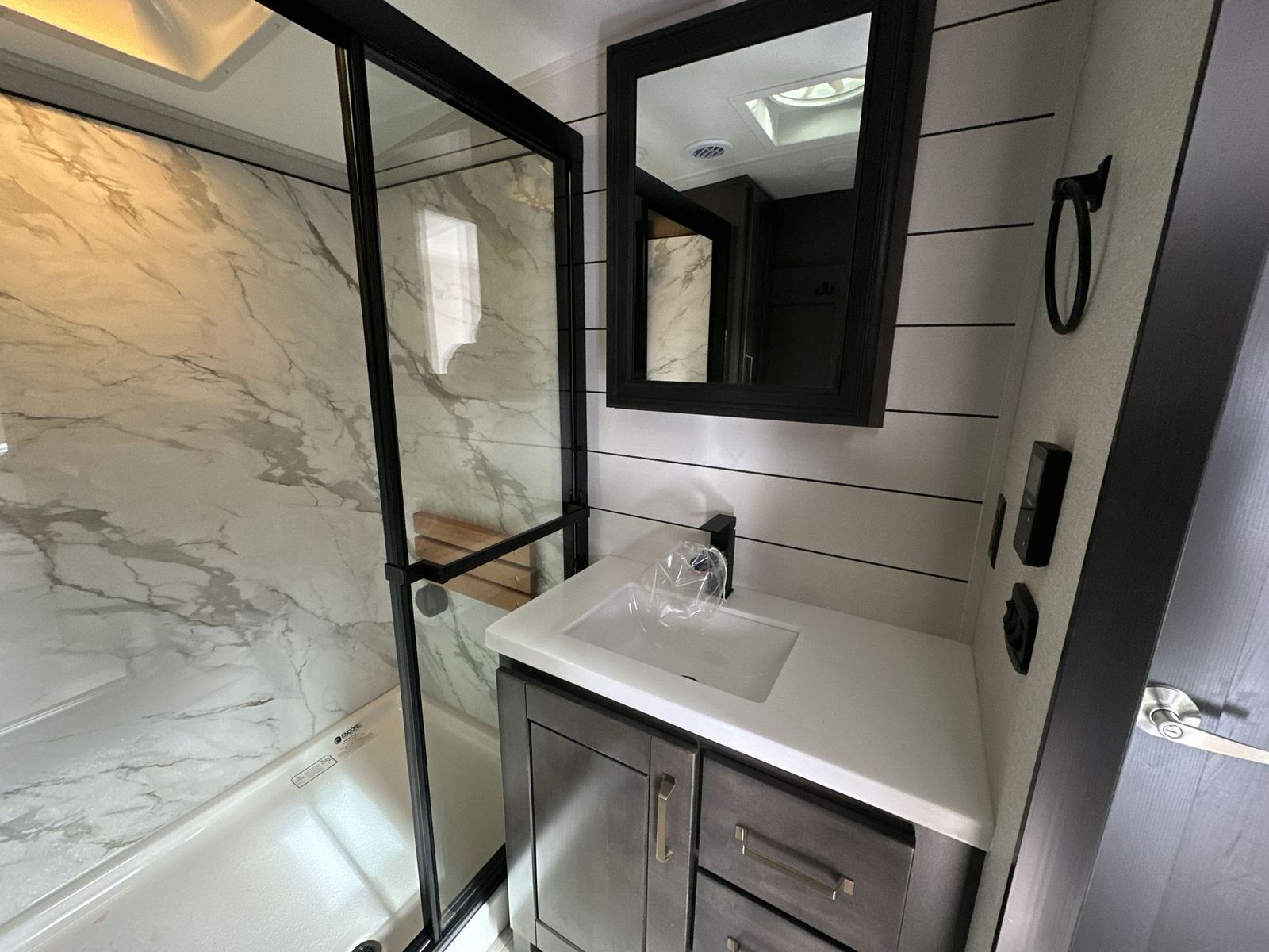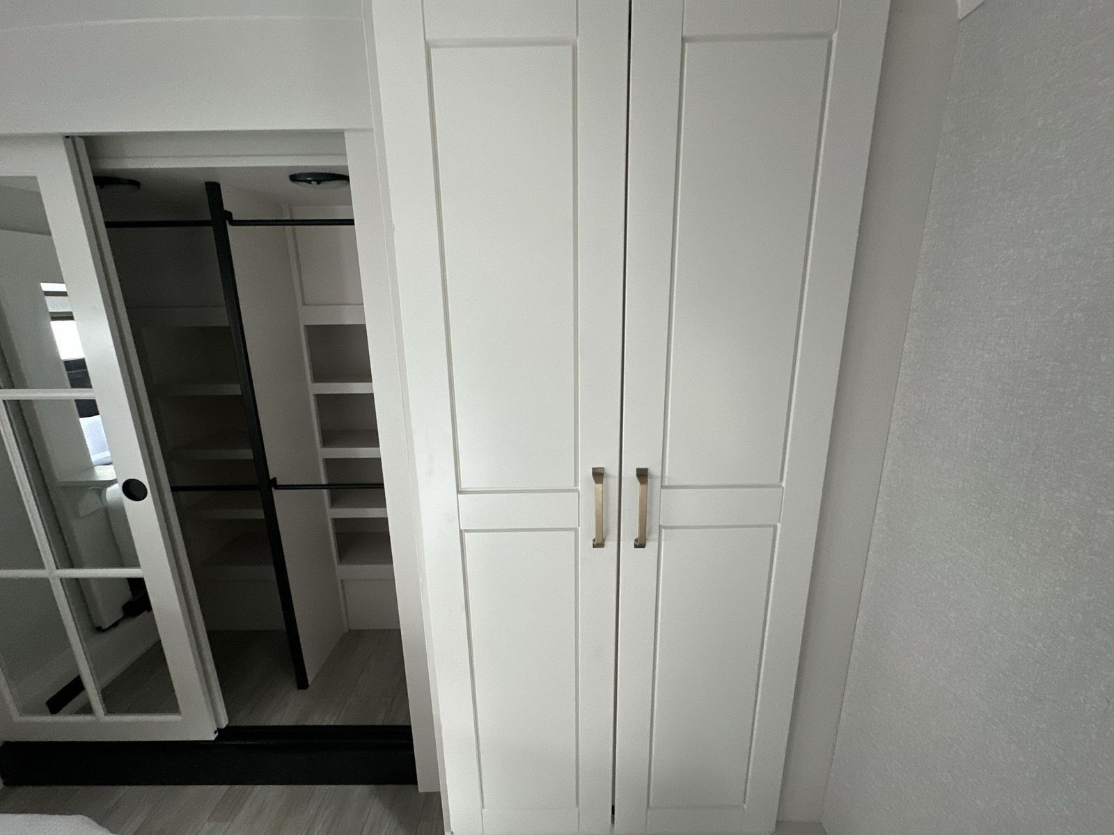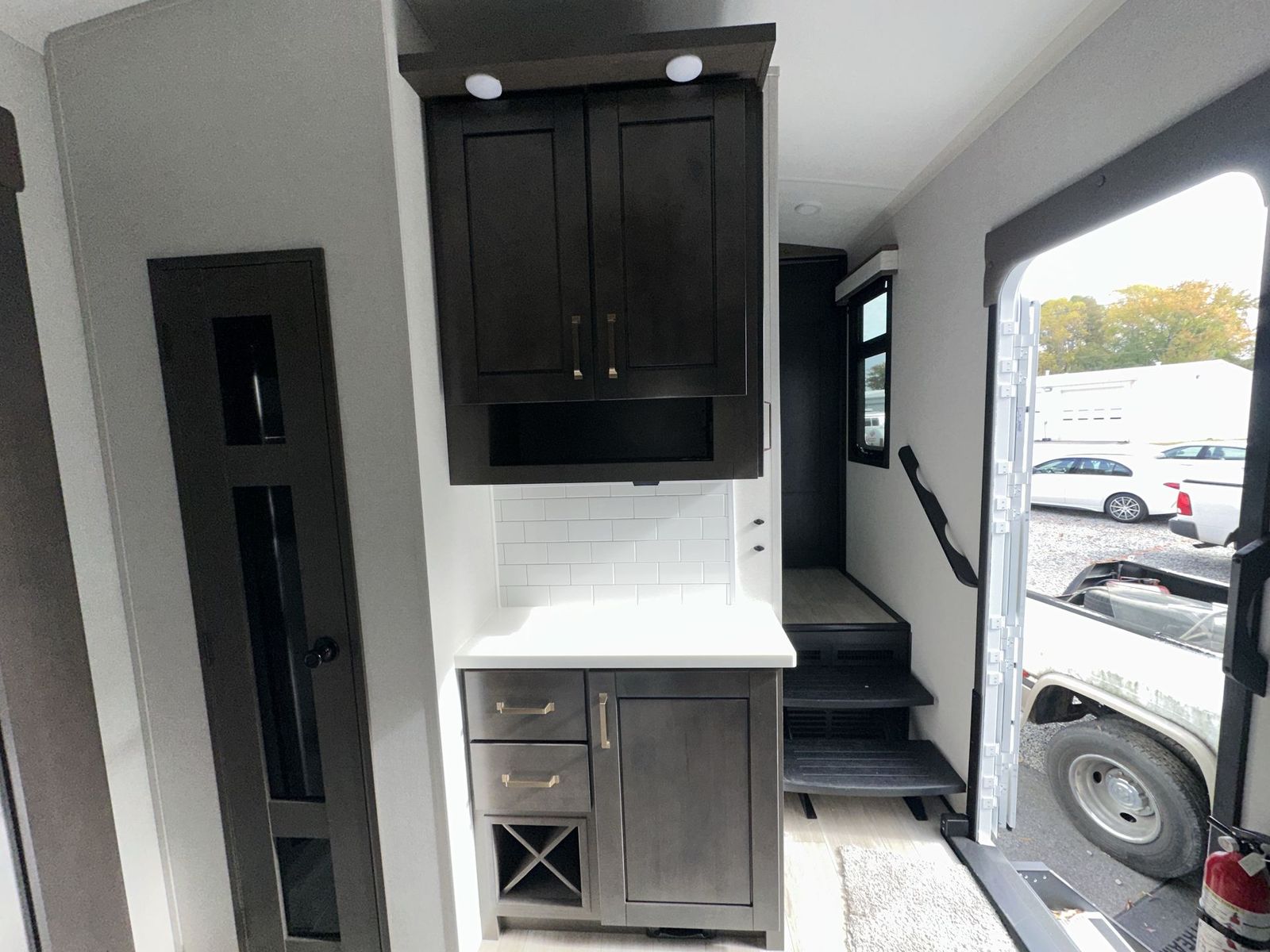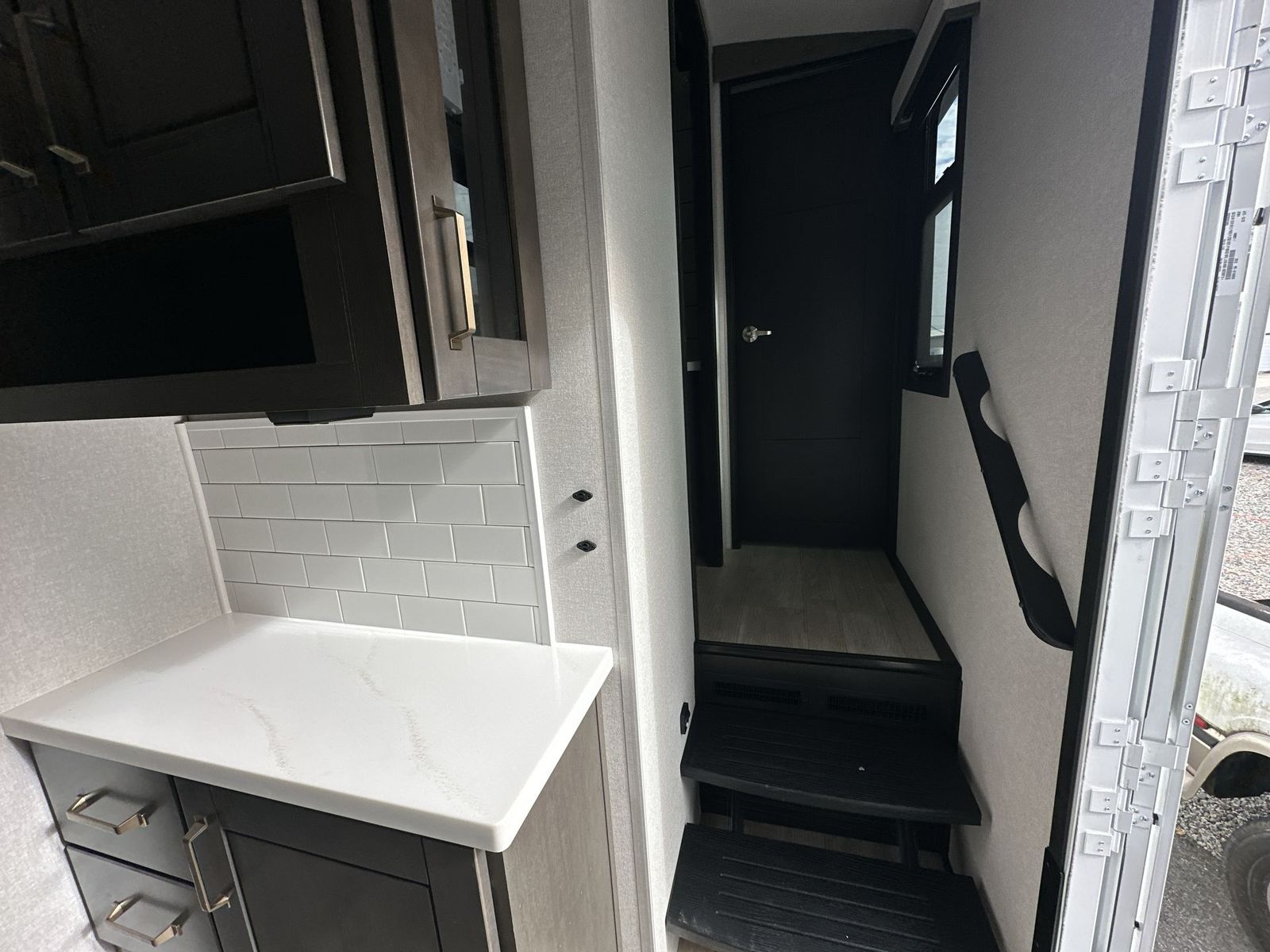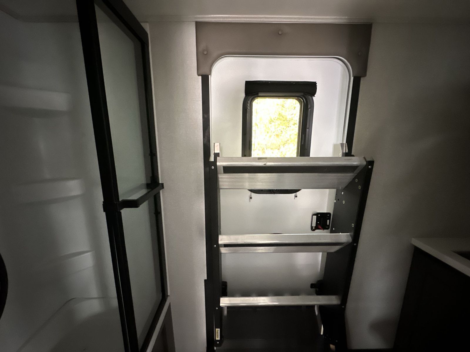 At the front of the 40DB fifth wheel, you’ll find the inviting front bedroom featuring a spacious 72" x 80" king bed, perfect for a restful night’s sleep. This room also includes a wardrobe and a flip-up dresser with a TV above, providing plenty of storage for clothing and essentials. Moving down the hall, one of two full bathrooms offers a 36" x 48" shower with a built-in seat for added accessibility, along with linen shelves for extra storage. At the center of the trailer, the main living area opens up with dual opposing slides for maximum comfort and room to move. One slide houses a 21-cu. ft. residential refrigerator and a 30" space-saving convection microwave with a built-in air fryer, while the central kitchen island includes a sink and pull-out cutting board, everything you need to prepare meals on the go. Across the way, the opposite slide features a roll-out table and theater seating, creating the perfect space to dine and relax after a long day. At the rear, the second bedroom includes a 60" x 80" queen bed in a slide-out with two wardrobes opposite for ample storage, plus a private full bathroom complete with a tub/shower combo and its own exterior exit for added convenience. Above it all, the loft provides three 30" x 80" bed mats and a loft cabinet, offering extra-sleeping space or additional storage for the whole family’s adventures.
