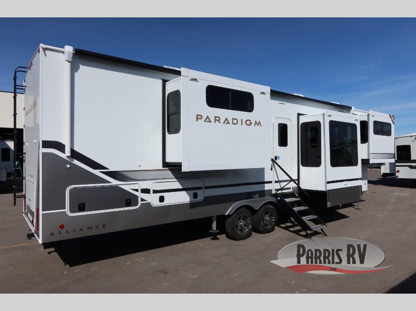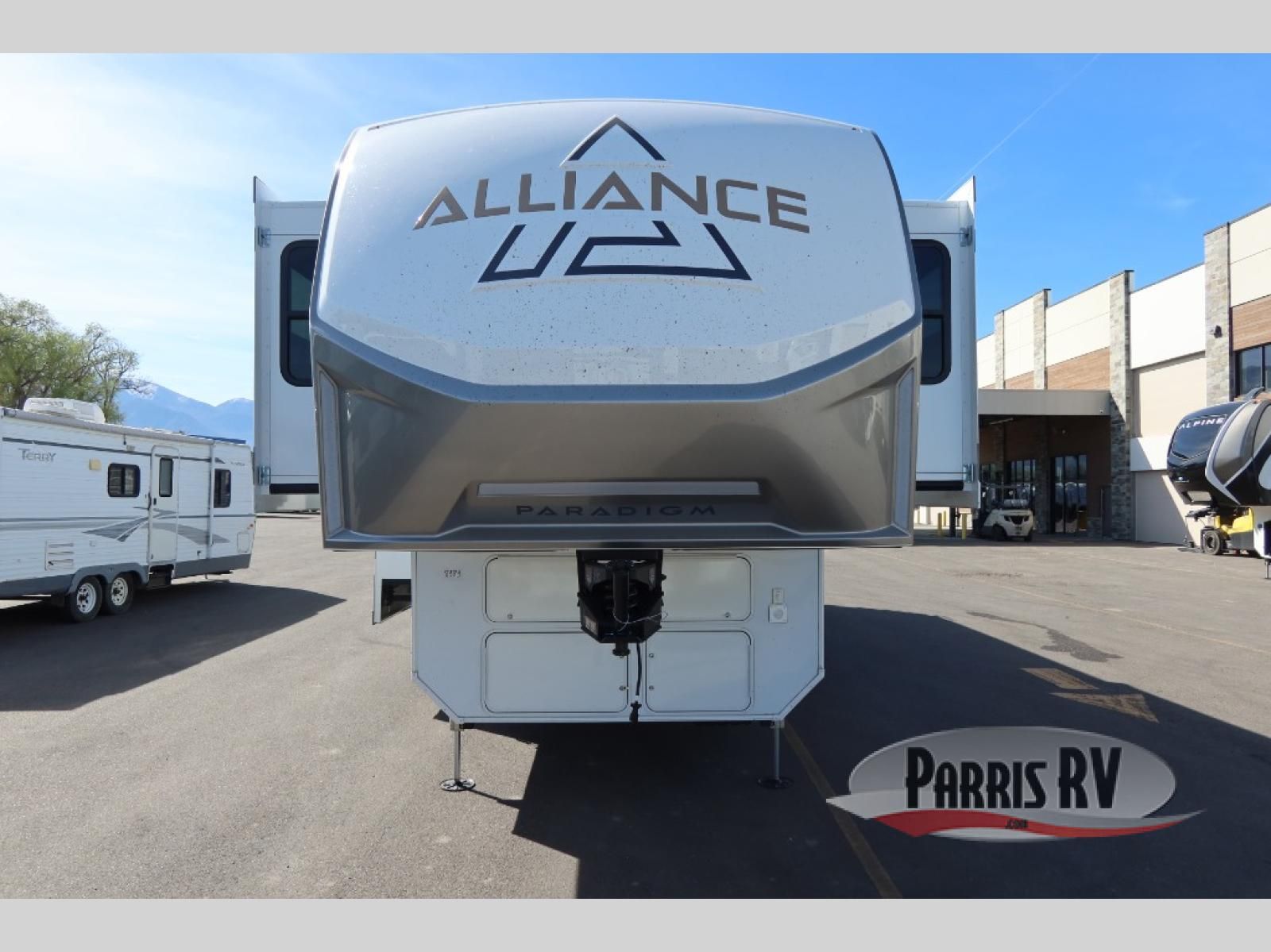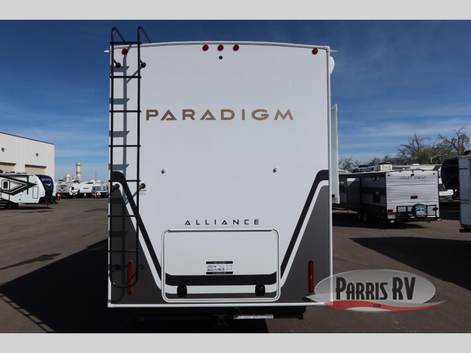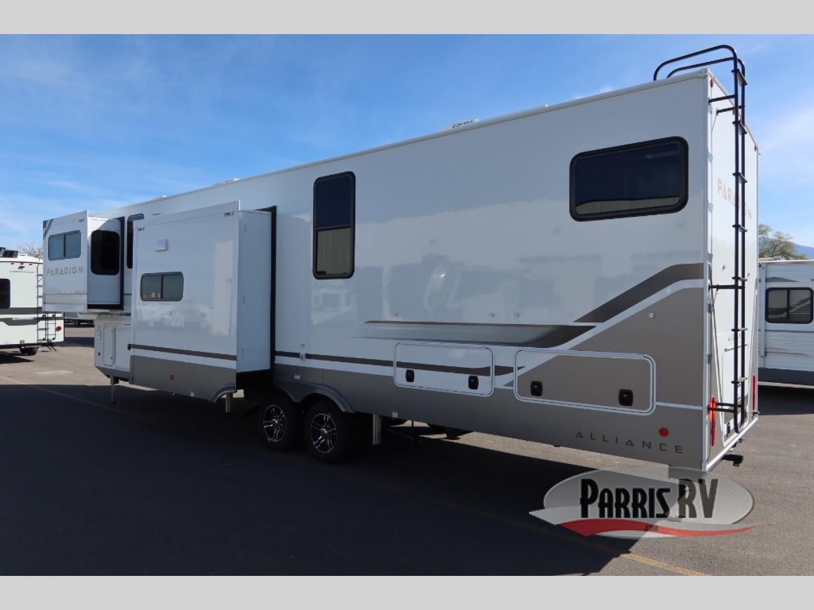 The Paradigm fifth wheels by Alliance RV are functional, high-quality, and luxurious for an unforgettable camping experience. There are three A/C units and a 40K BTU furnace to keep you comfortable year around, and you'll appreciate additional convenient amenities, like the all-in-one enclosed/heated utility center and the color coded and numbered wiring. A Helux Series coil spring pin box comes standard for hassle-free towing, along with Curt 8,000 lb. axles. You'll love the kitchen with its LG solid surface countertops and Lusso range, plus there is LED motion lighting in the pantry and a Maxx fan with a rain sensor to keep everything fresh when making dinner. Each model also includes an HD Smart TV in the living room and bedroom. And of course there are a variety of options you can choose from to further customize your fifth wheel; dual pane windows, Super Solar Plus, slide out awning toppers, and generator prep or a generator to name a few!