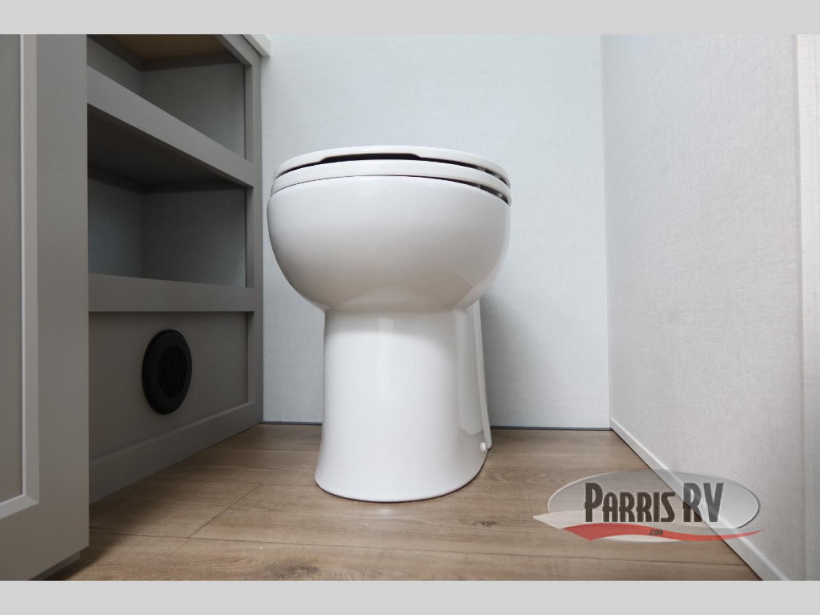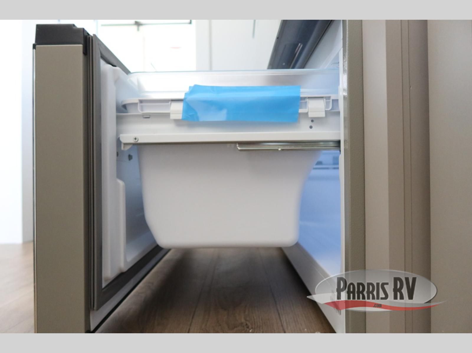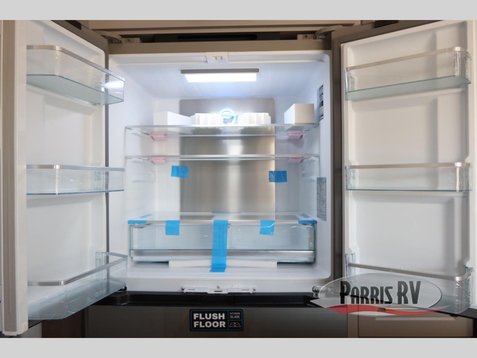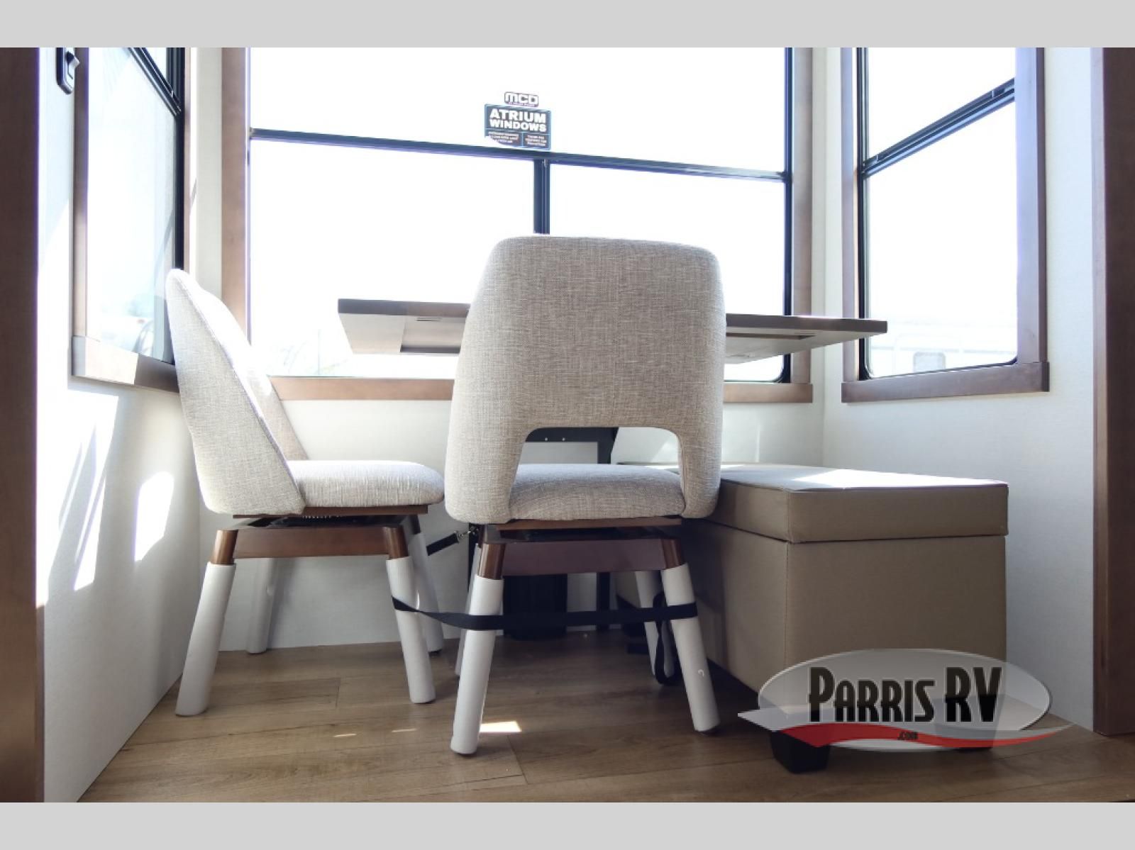 An active family will want this fifth wheel with its 48" x 115" exterior basement pull-out tray for kayaks or extra storage. Just above this area is the master suite with a rear bathroom that offers a residential shower, a porcelain toilet with soft close seat, plus a wardrobe and shelf storage. The king bed slide gives you more floor space, and you will have a seat, a flip-top dresser, and a Smart TV to watch movies in bed. The half bath is next to the main entry which is super convenient, and the middle kitchen is separate from the front living area. The cook will love the residential microwave, range and oven, plus the 19 cu. ft. 12 volt residential refrigerator. There is also a pantry and extra counter space on the kitchen island with a large sink. The views out of the atrium windows in the slide out, which includes the swivel table and desk, are a must see. And when you need to watch the big game, the 55" Smart TV with a pull-out fireplace storage are up front with the dual recliner love seat and two sleeper sofas.