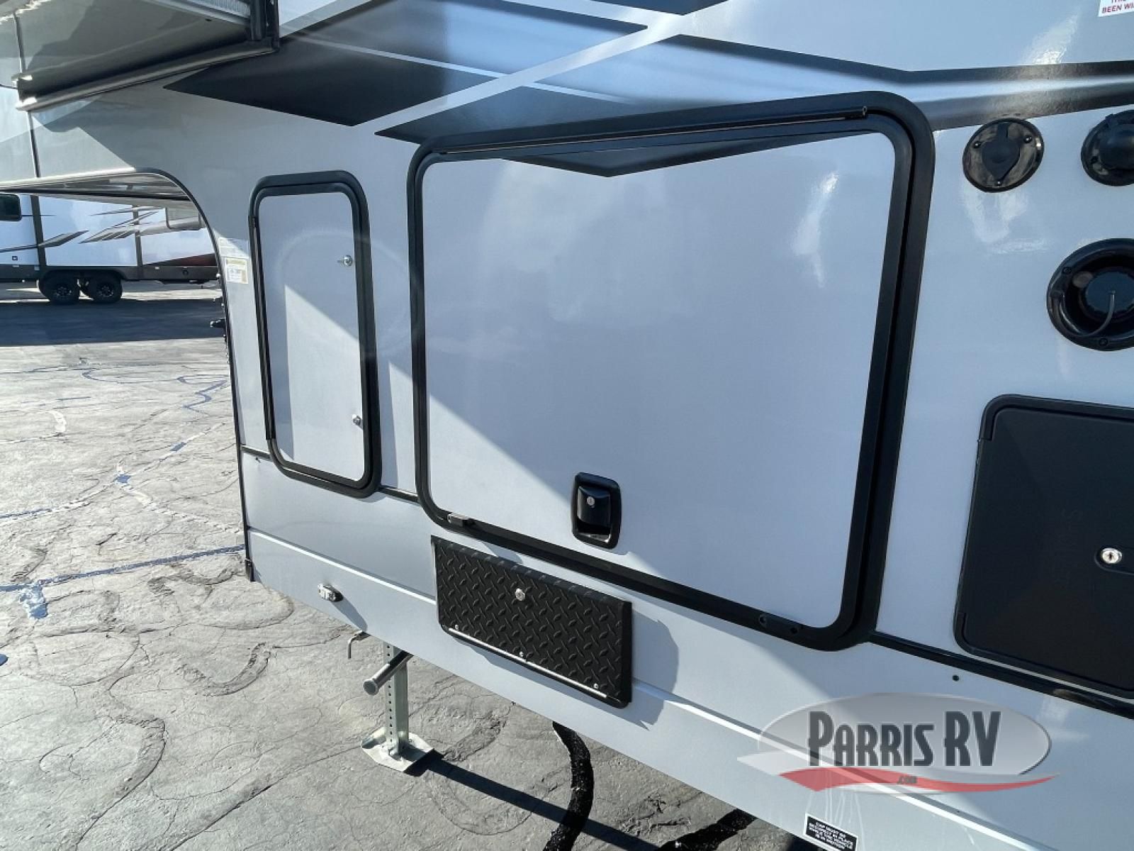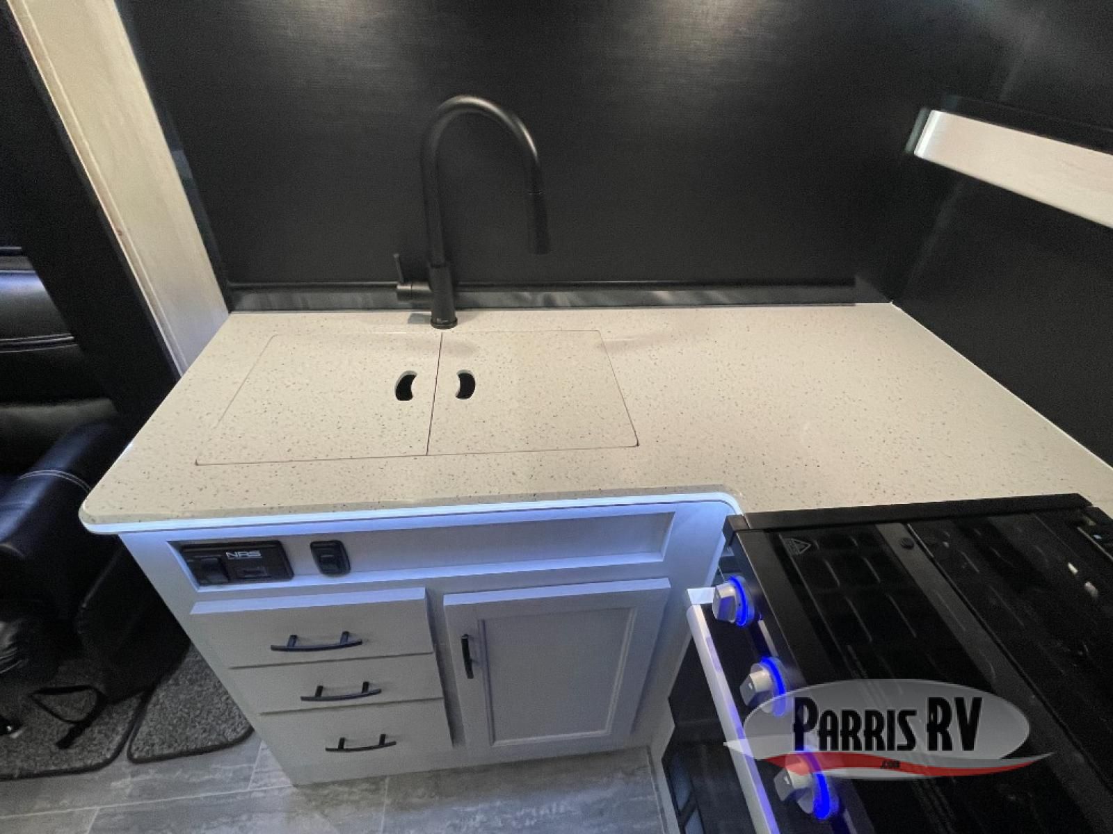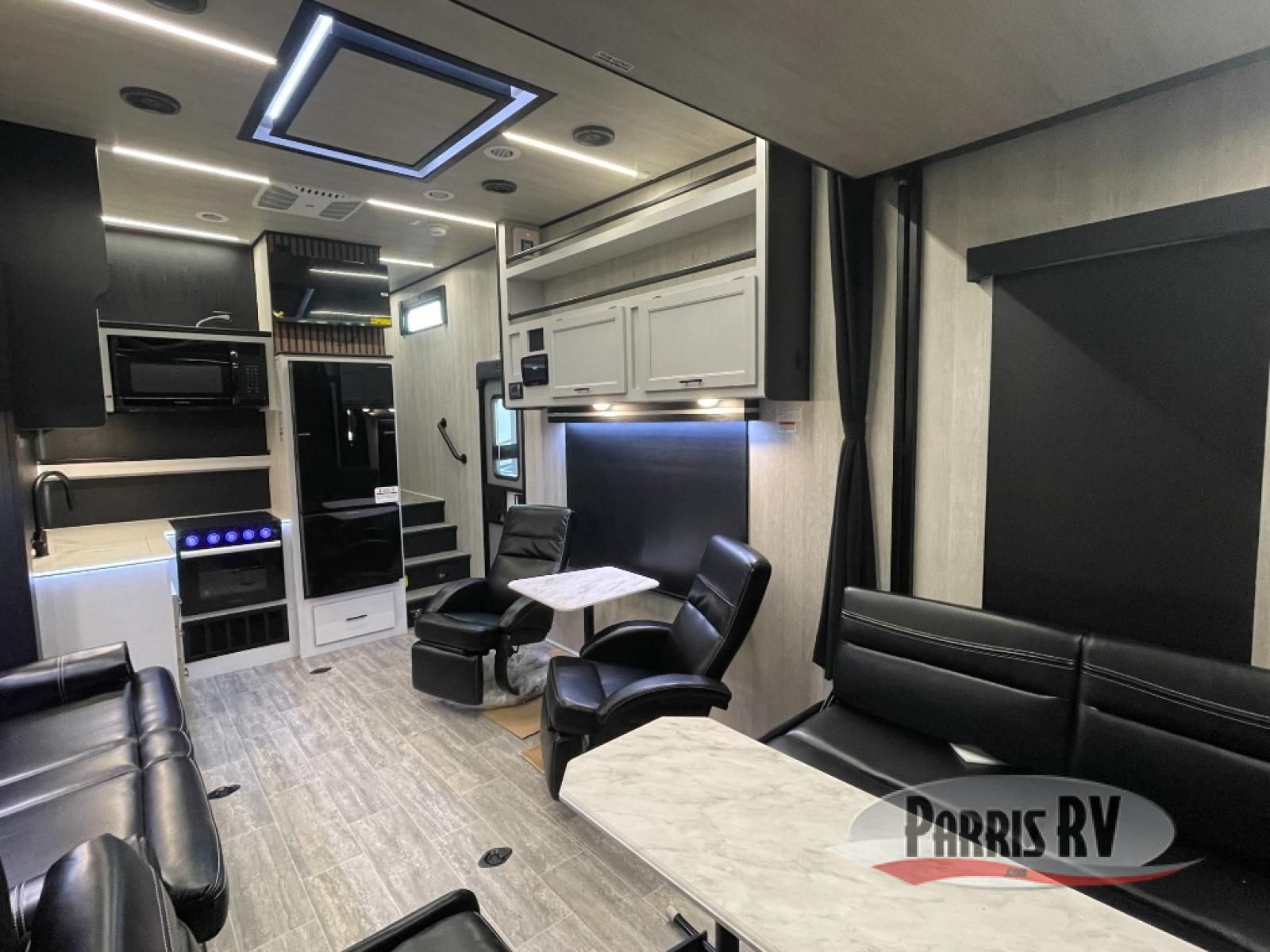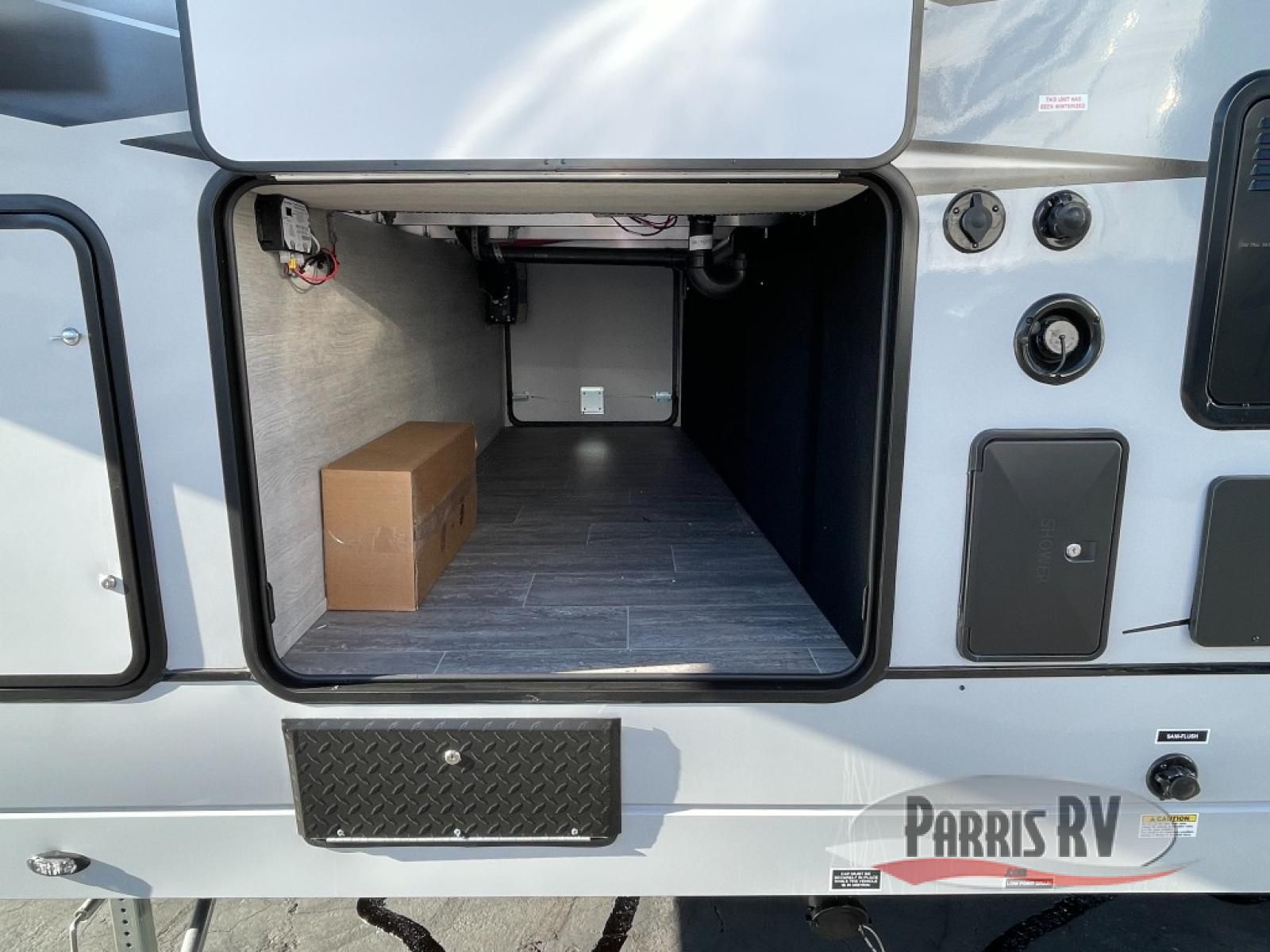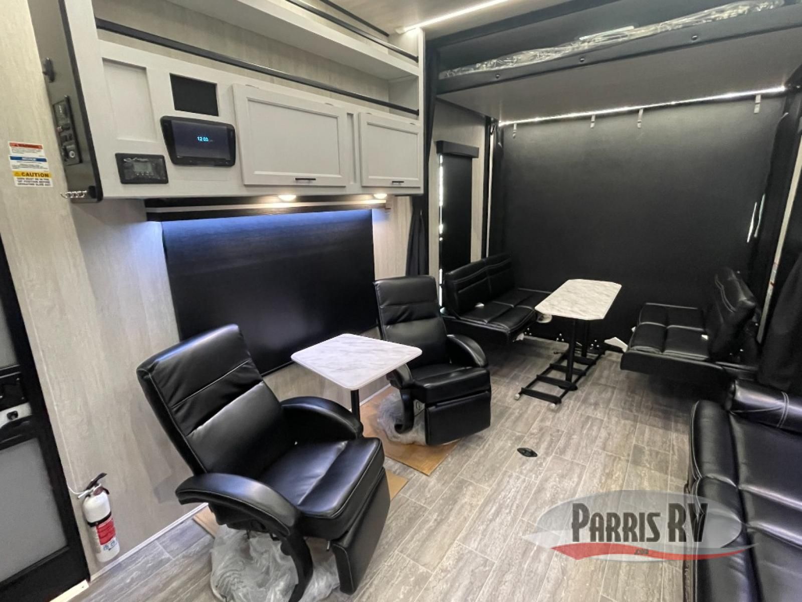 This toy hauler is ready for fun when you are! After your toys are unloaded from the garage, relax on the power sofa bed or let your guests take a rest on the power queen bed above the sofa. There are also dual swivel/rocker chairs with a table you can enjoy your morning coffee at each morning. The chef of your group can make eggs and bacon on the three burner cooktop before you all head out, and the full bath will allow you to clean up when you return. The front private bedroom will feel just like home with its RV queen bed, nightstand, wardrobe, and overhead cabinets. This model also has two optional slide outs if you'd like to add more interior space!