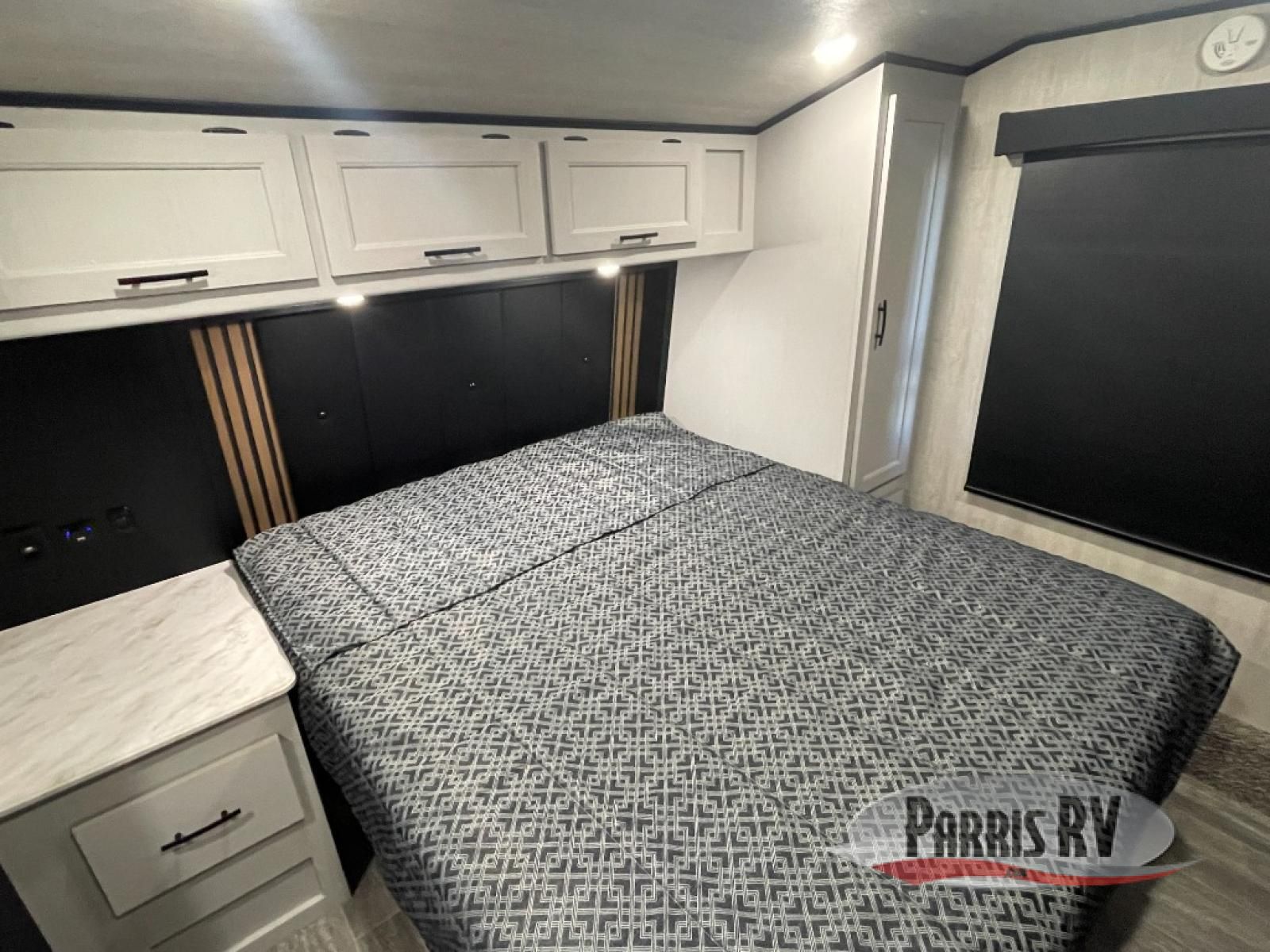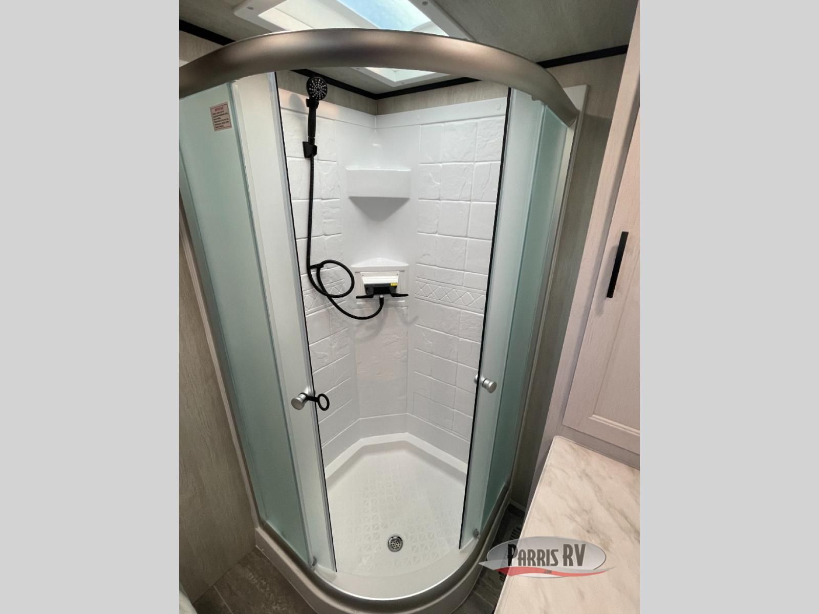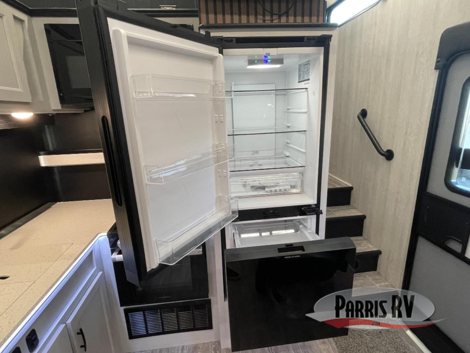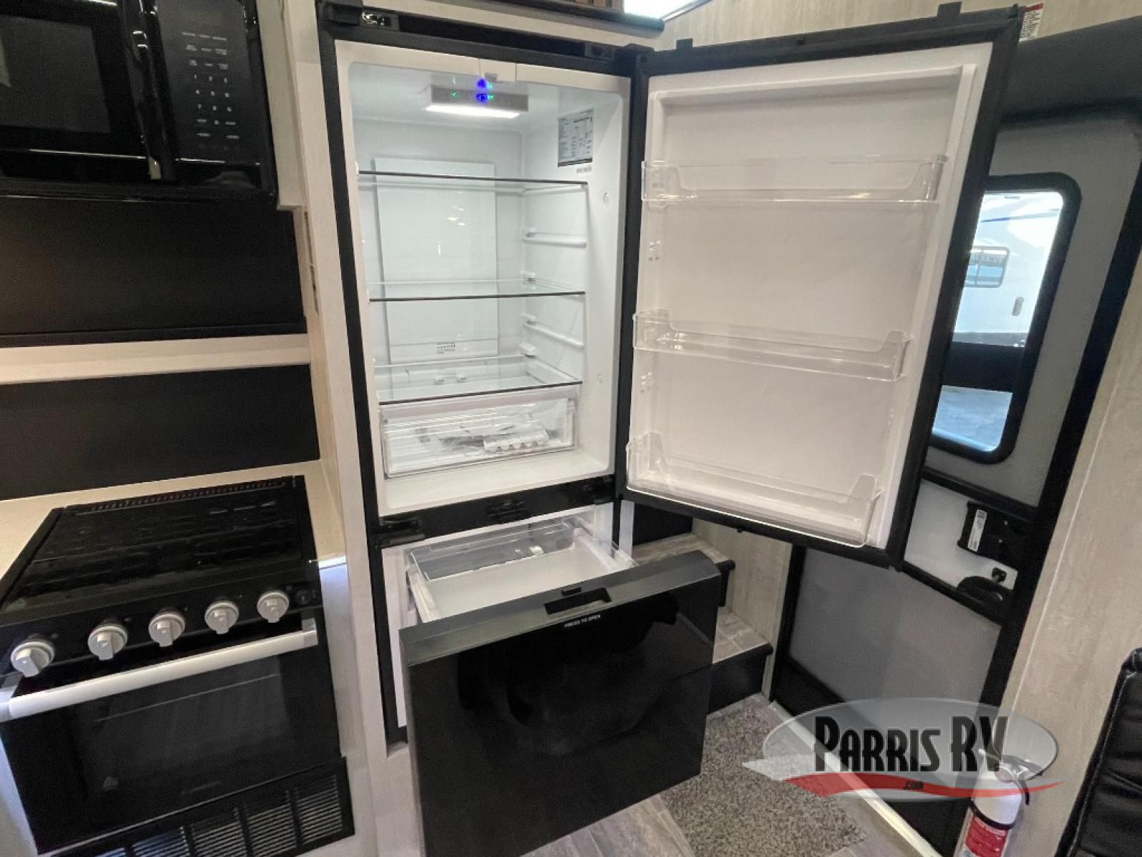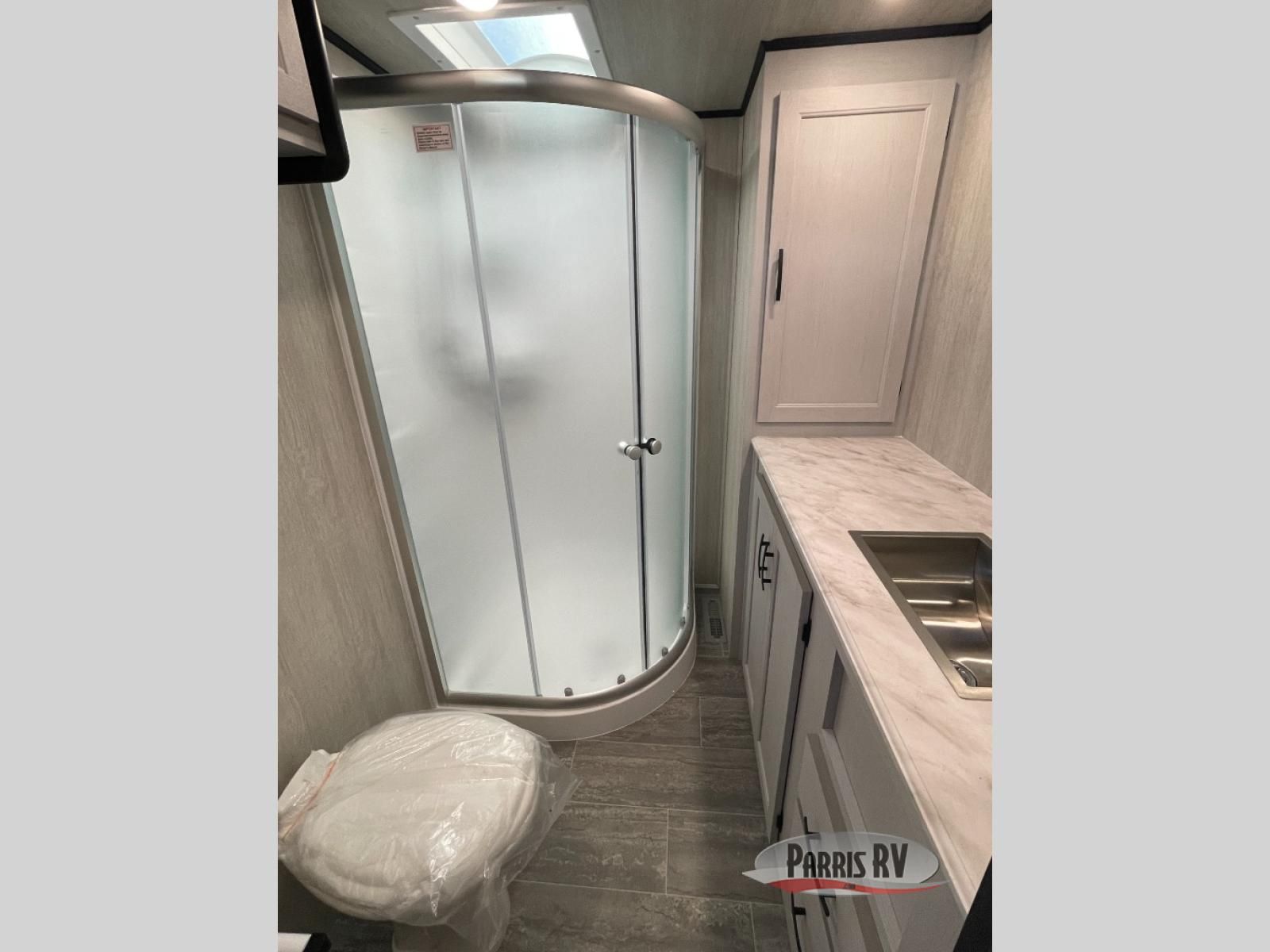 This toy hauler is ready for fun when you are! After your toys are unloaded from the garage, relax on the power sofa bed or let your guests take a rest on the power queen bed above the sofa. There are also dual swivel/rocker chairs with a table you can enjoy your morning coffee at each morning. The chef of your group can make eggs and bacon on the three burner cooktop before you all head out, and the full bath will allow you to clean up when you return. The front private bedroom will feel just like home with its RV queen bed, nightstand, wardrobe, and overhead cabinets. This model also has two optional slide outs if you'd like to add more interior space!