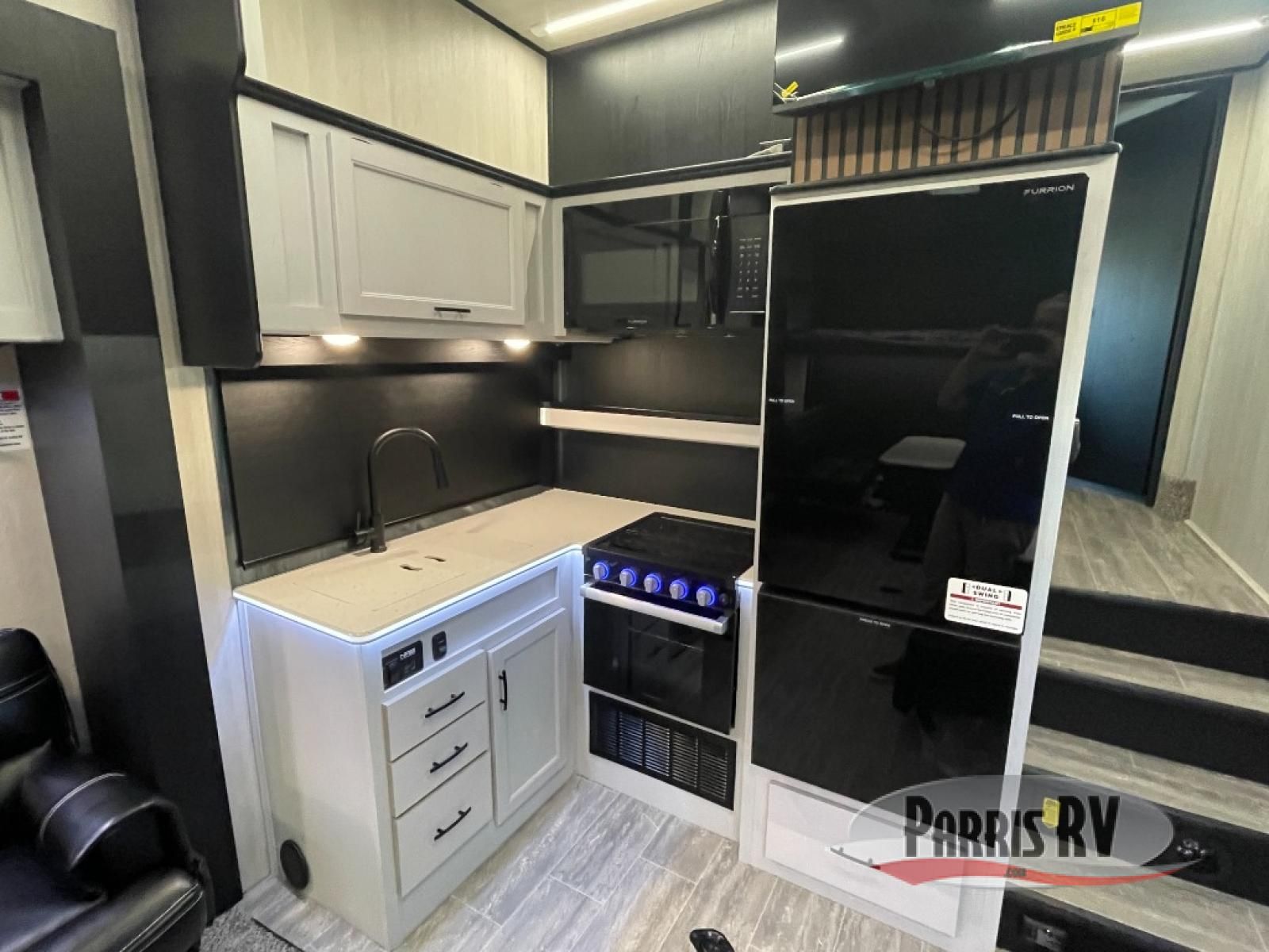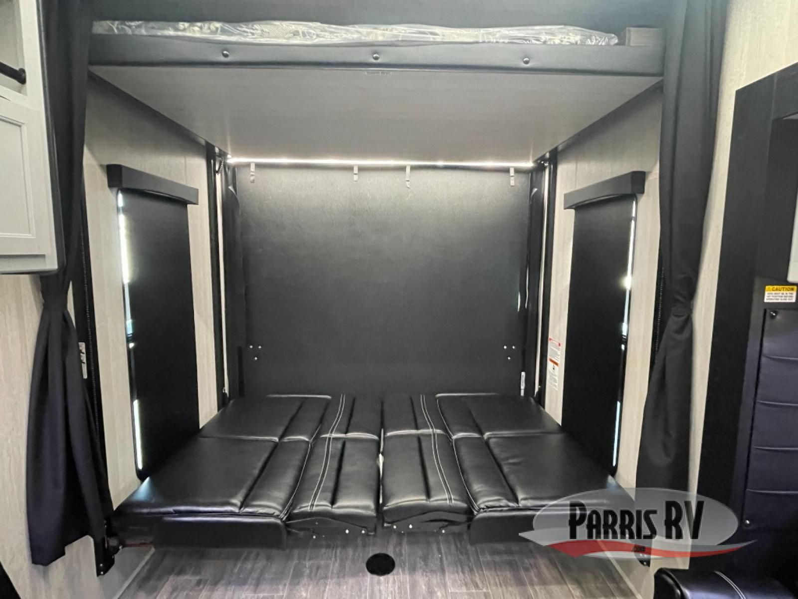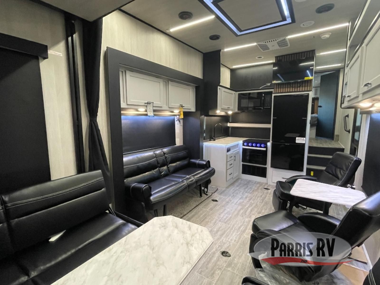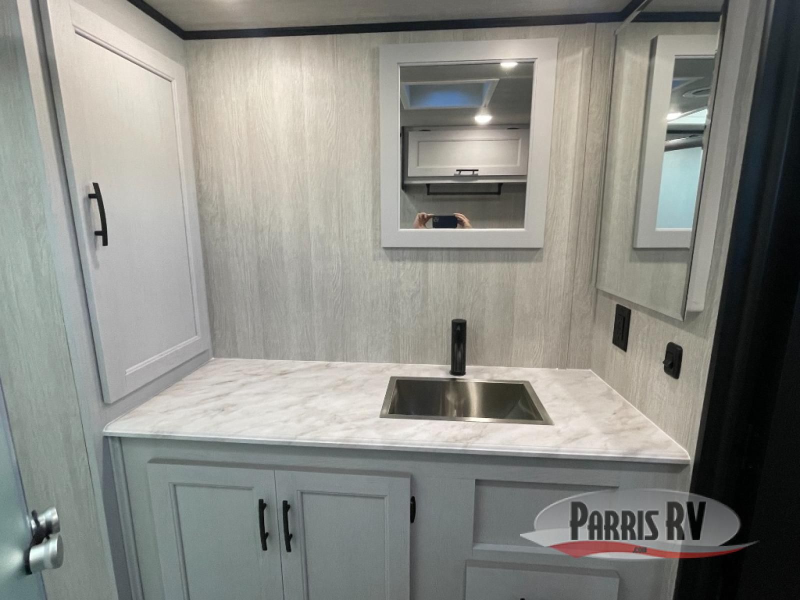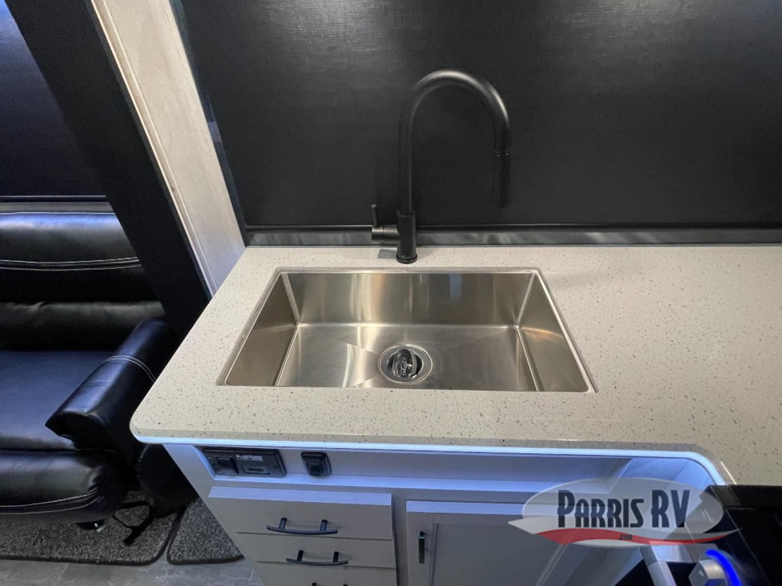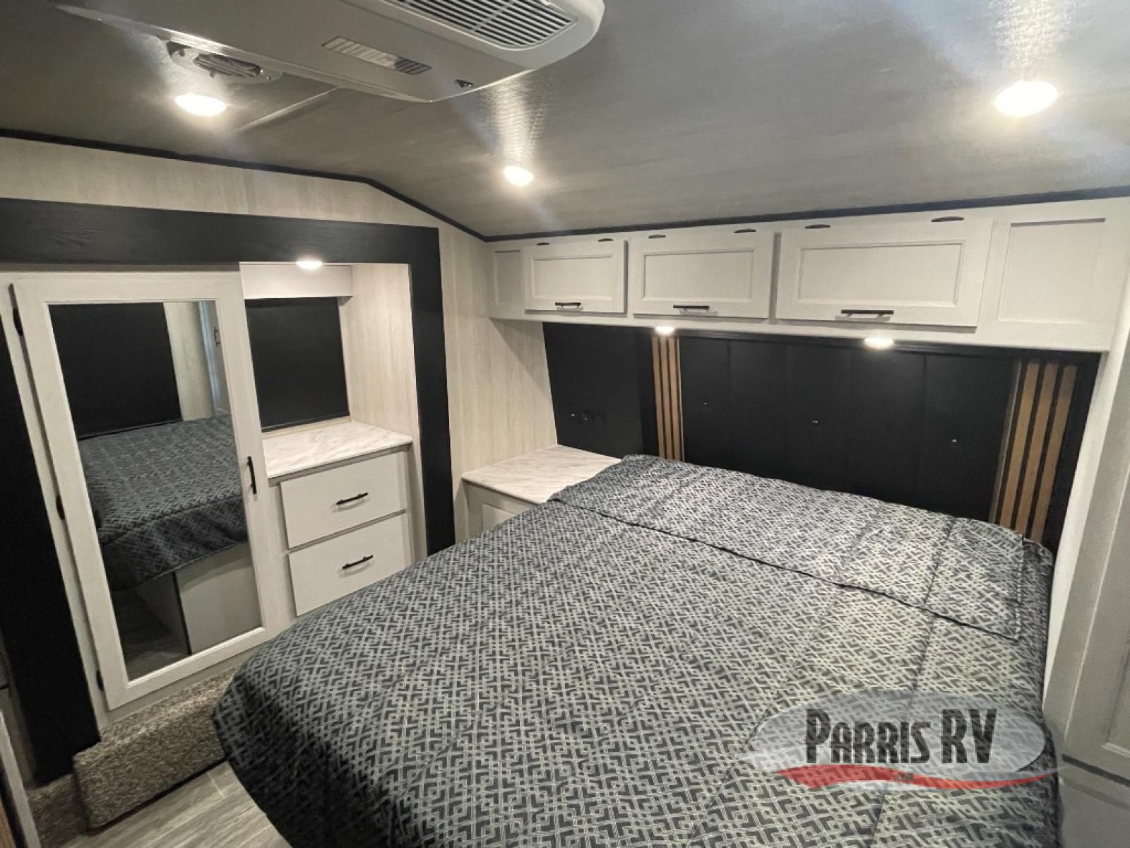 This toy hauler is ready for fun when you are! After your toys are unloaded from the garage, relax on the power sofa bed or let your guests take a rest on the power queen bed above the sofa. There are also dual swivel/rocker chairs with a table you can enjoy your morning coffee at each morning. The chef of your group can make eggs and bacon on the three burner cooktop before you all head out, and the full bath will allow you to clean up when you return. The front private bedroom will feel just like home with its RV queen bed, nightstand, wardrobe, and overhead cabinets. This model also has two optional slide outs if you'd like to add more interior space!