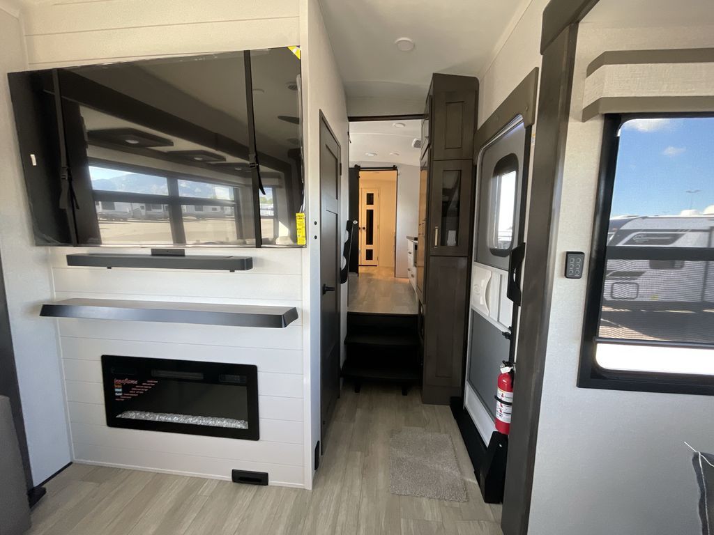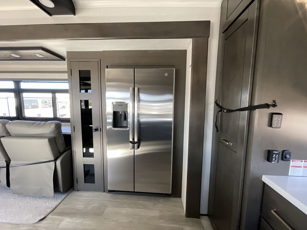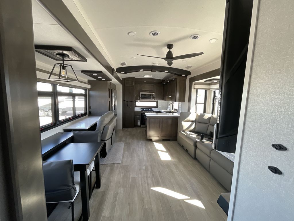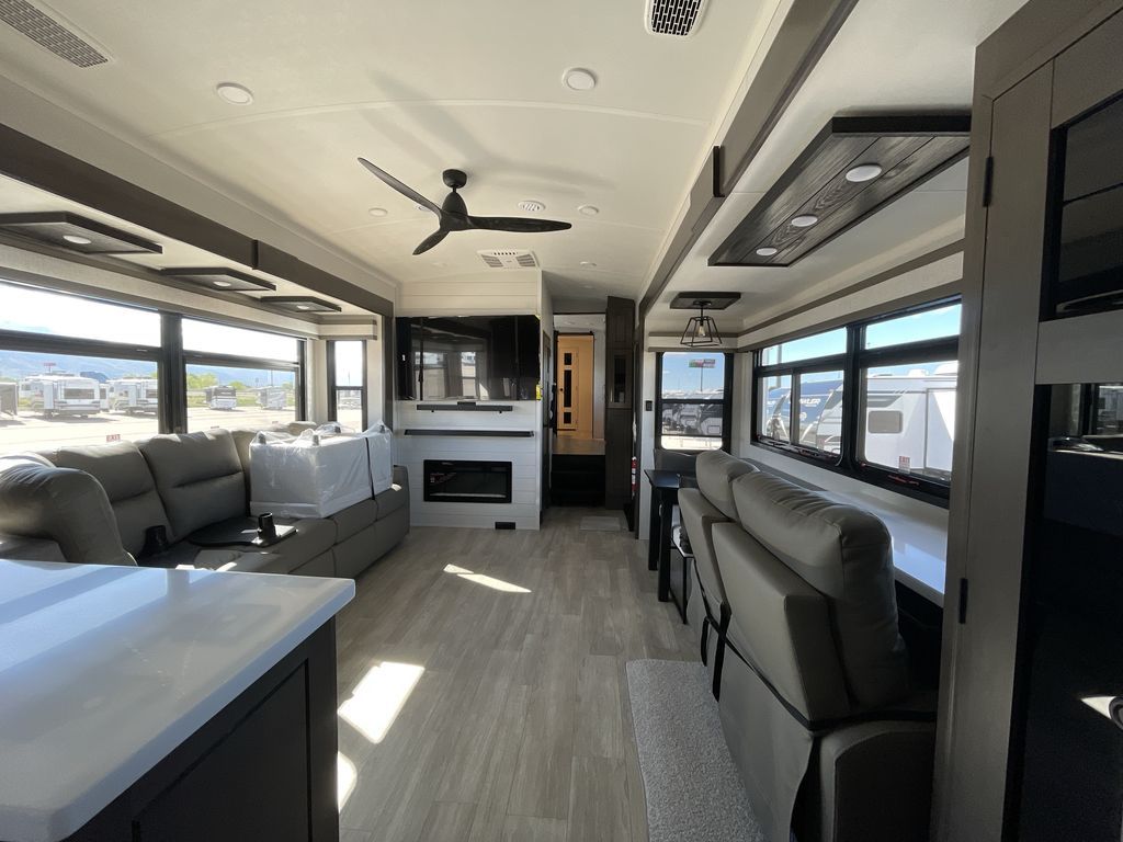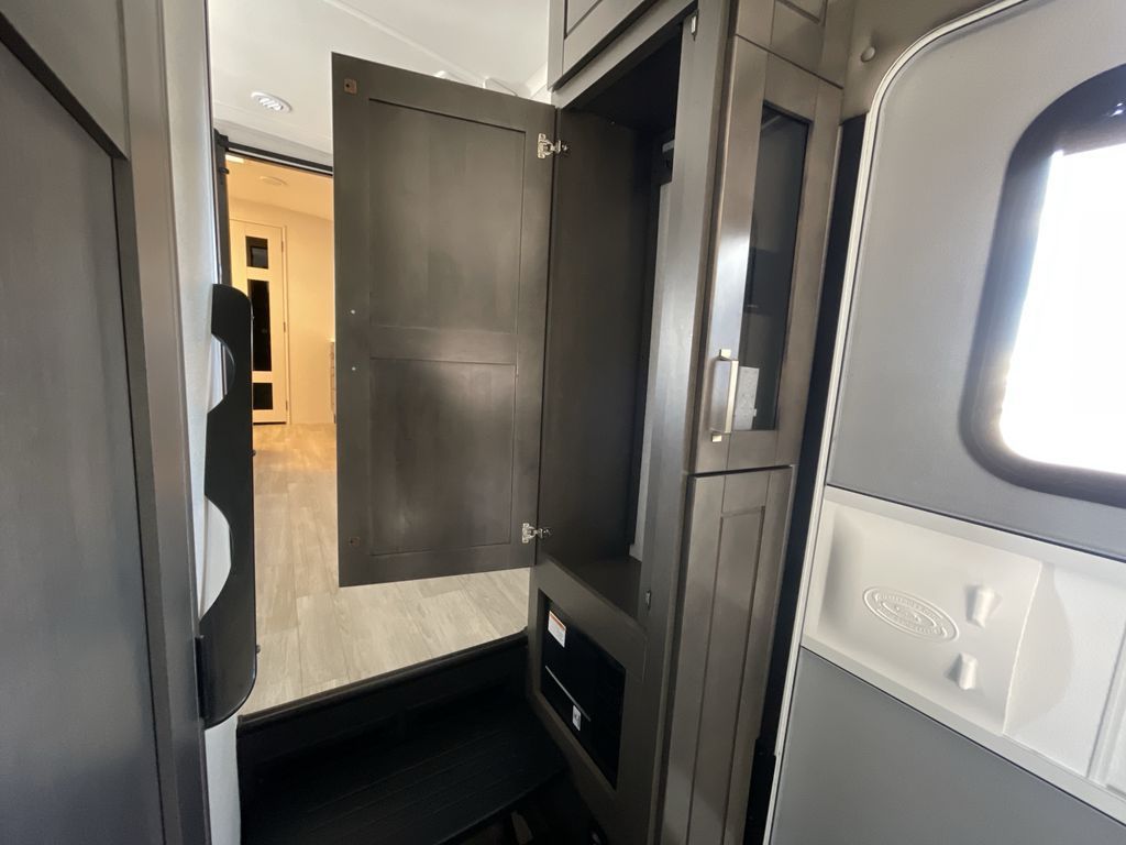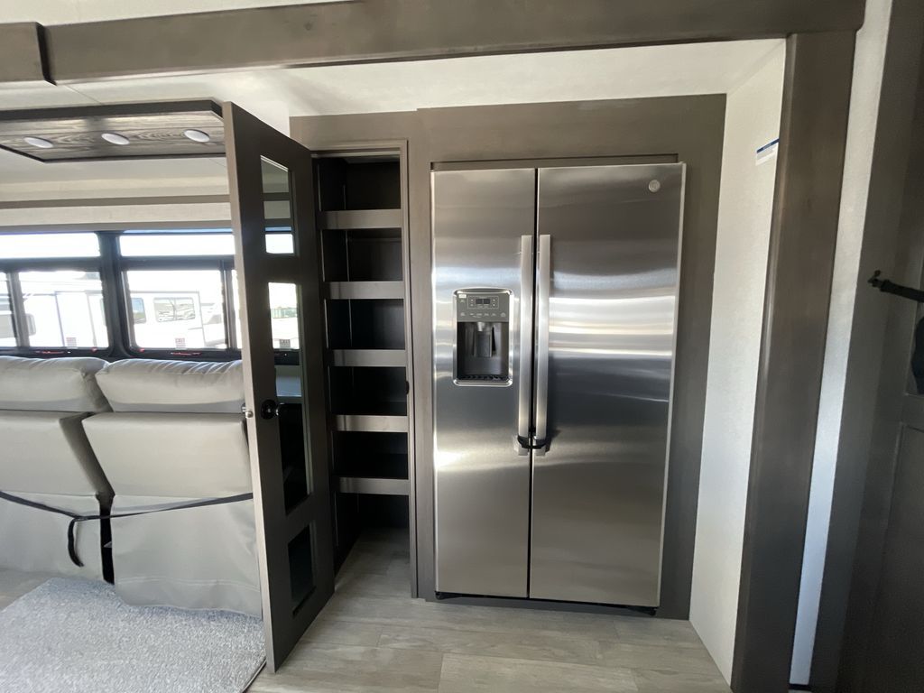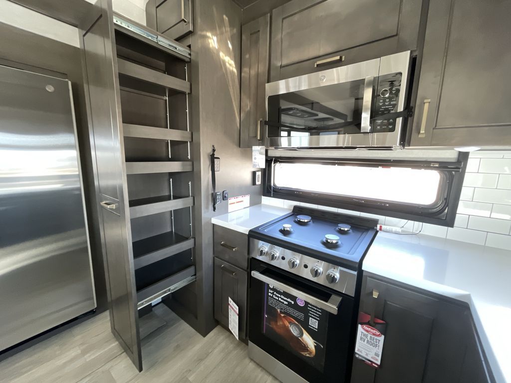 Starting from the back, this impressive 39RK features a rear kitchen designed in a convenient U-shape for easy accessibility and efficient meal prep. The kitchen is fully equipped with plenty of overhead cabinets, a convection microwave with an air fryer, a 24" range, and a pull-out pantry, perfect for the chef on the trip to cook in comfort. Across the kitchen, the large slide-out houses a 21-cu. ft. refrigerator and a second pantry with shelves, providing even more space to store groceries, snacks, and coffee essentials. The nearby desk/coffee bar and roll-out table create an inviting area to enjoy meals or unwind with a cup of coffee. The living area offers a spacious 100" L-shaped sofa and a theater seat facing the TV and fireplace, making it an ideal spot for relaxing or hosting movie nights. Moving forward, you’ll find a convenient half bathroom with linen shelves for added storage and accessibility. At the front, the private bedroom features a 72" x 80" king bed in a slide-out with a dresser across for ample storage. Finally, the full bathroom at the very front includes a 30" x 61" shower with a seat for comfort, a large sink, and a walk-in closet that provides generous space for all your clothing and gear.