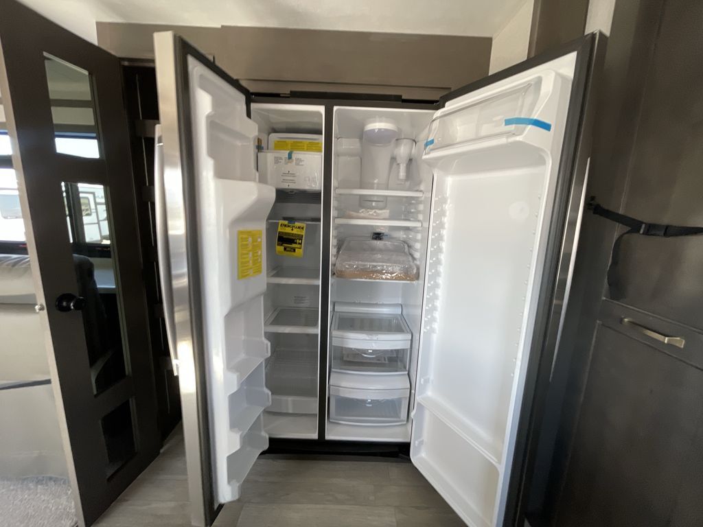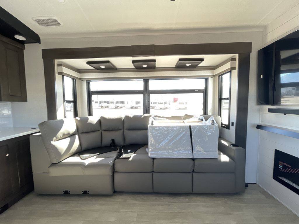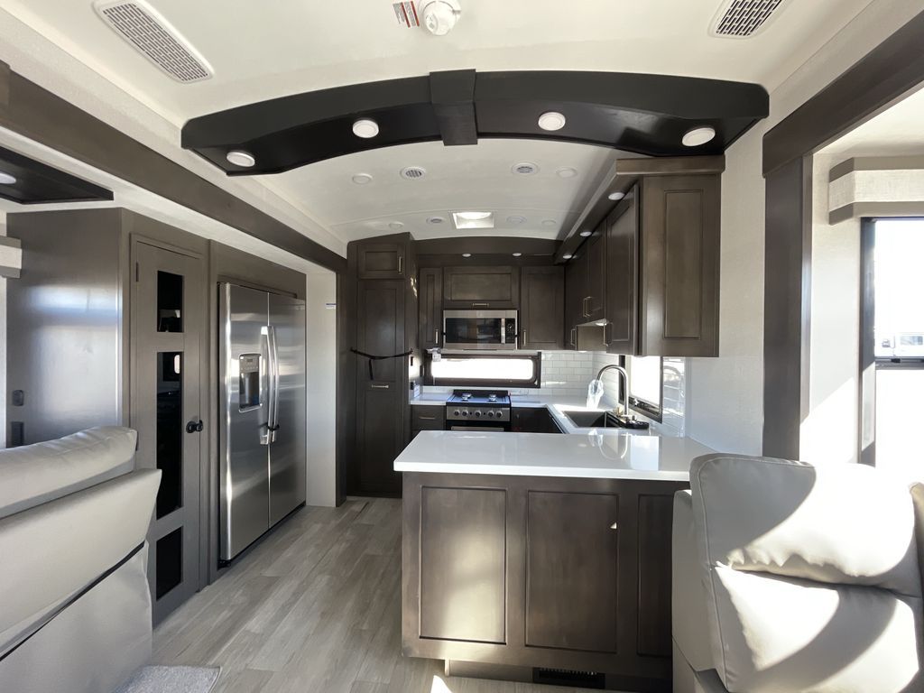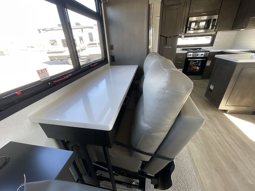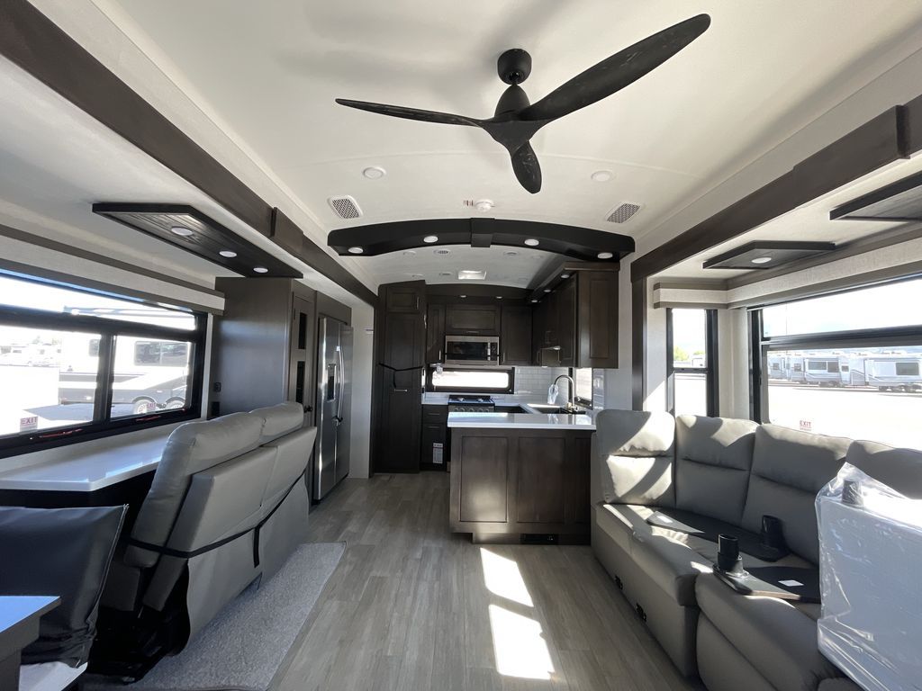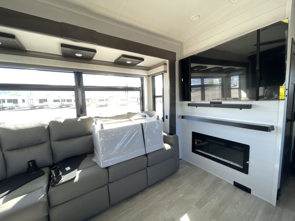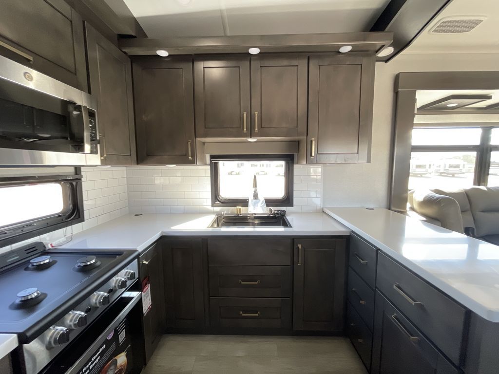 Starting from the back, this impressive 39RK features a rear kitchen designed in a convenient U-shape for easy accessibility and efficient meal prep. The kitchen is fully equipped with plenty of overhead cabinets, a convection microwave with an air fryer, a 24" range, and a pull-out pantry, perfect for the chef on the trip to cook in comfort. Across the kitchen, the large slide-out houses a 21-cu. ft. refrigerator and a second pantry with shelves, providing even more space to store groceries, snacks, and coffee essentials. The nearby desk/coffee bar and roll-out table create an inviting area to enjoy meals or unwind with a cup of coffee. The living area offers a spacious 100" L-shaped sofa and a theater seat facing the TV and fireplace, making it an ideal spot for relaxing or hosting movie nights. Moving forward, you’ll find a convenient half bathroom with linen shelves for added storage and accessibility. At the front, the private bedroom features a 72" x 80" king bed in a slide-out with a dresser across for ample storage. Finally, the full bathroom at the very front includes a 30" x 61" shower with a seat for comfort, a large sink, and a walk-in closet that provides generous space for all your clothing and gear.