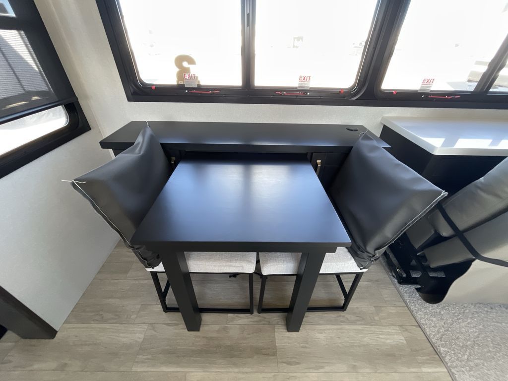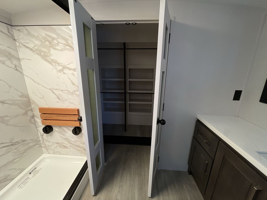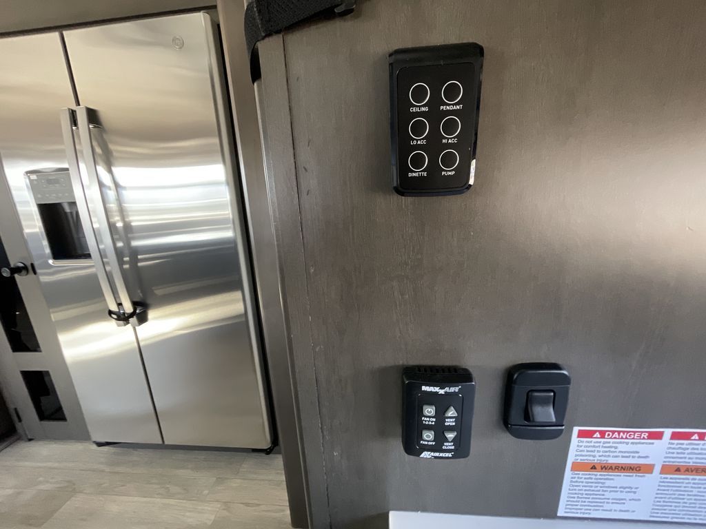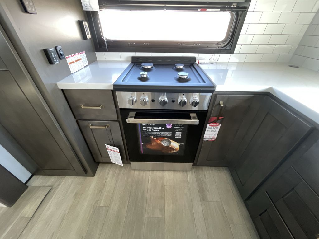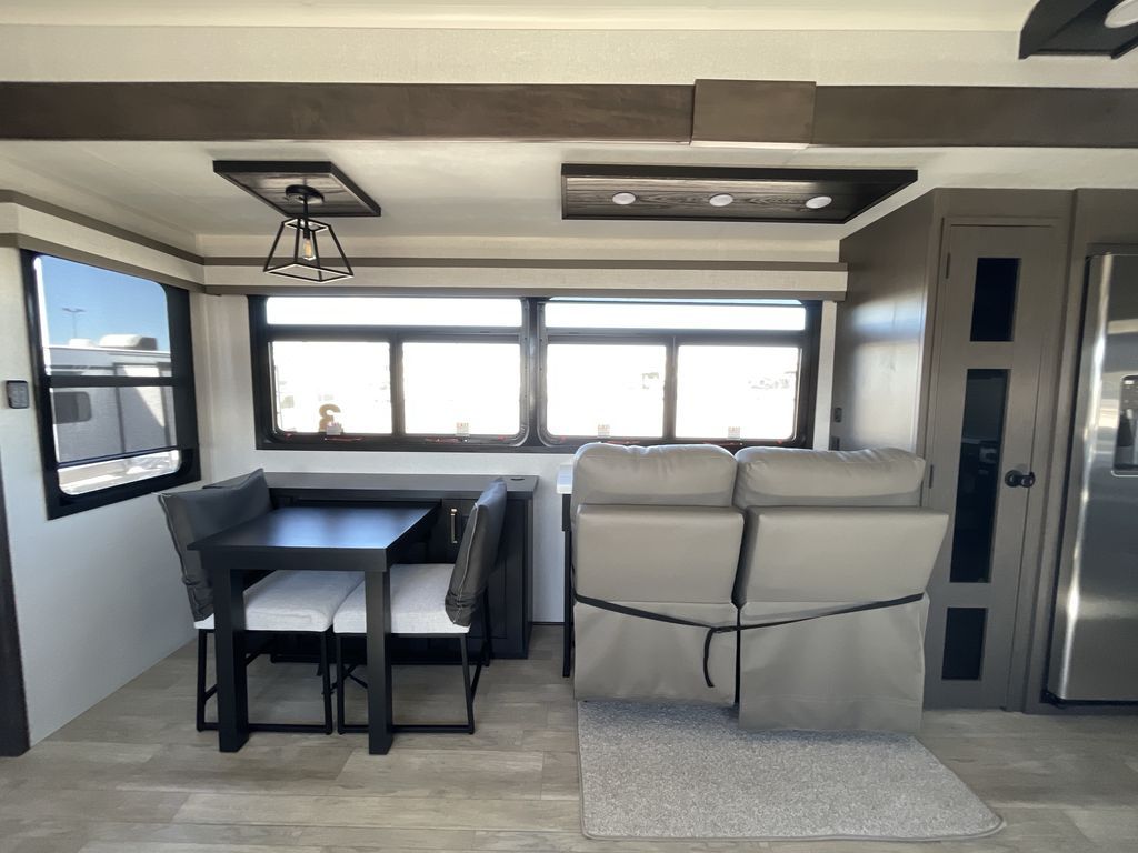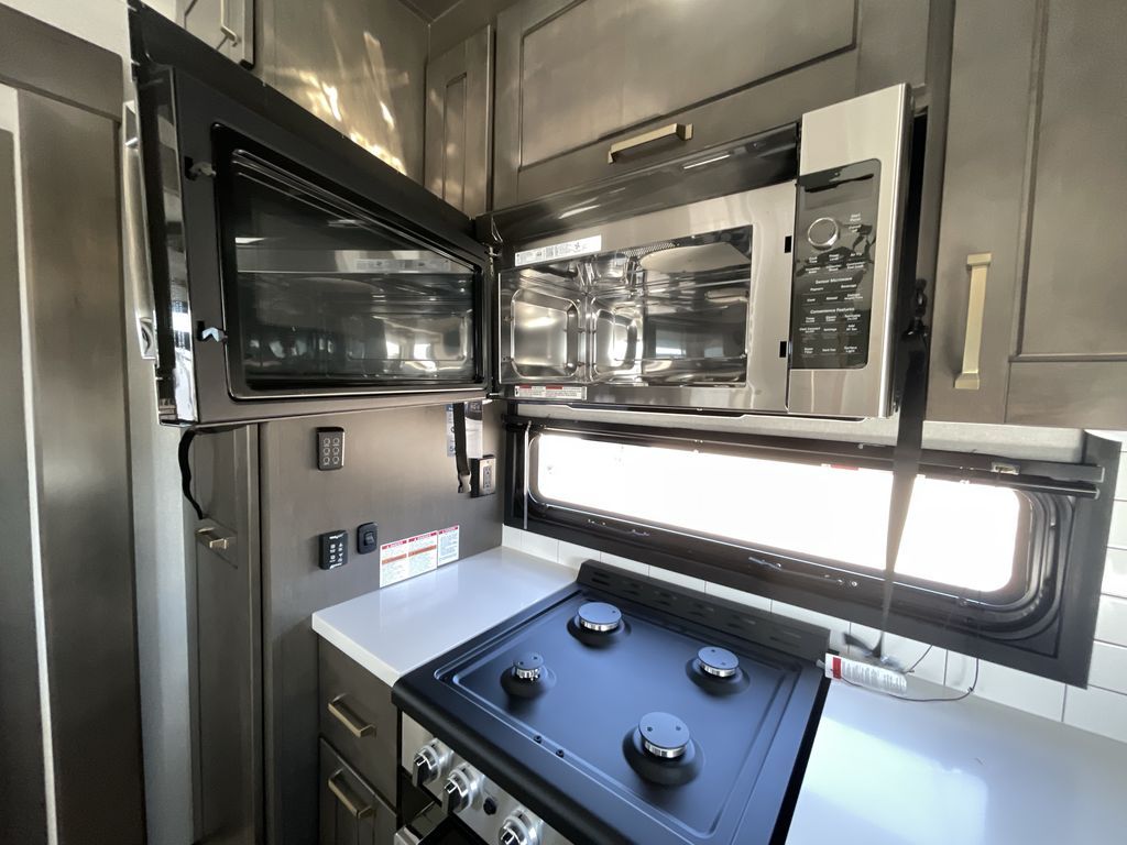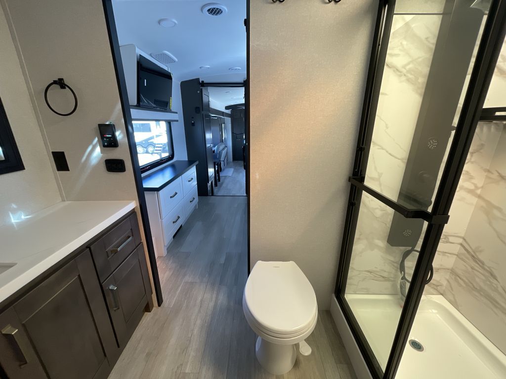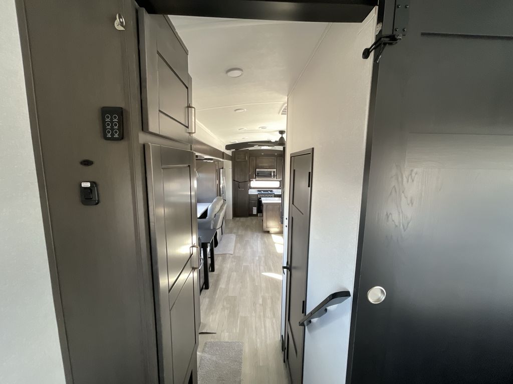 Starting from the back, this impressive 39RK features a rear kitchen designed in a convenient U-shape for easy accessibility and efficient meal prep. The kitchen is fully equipped with plenty of overhead cabinets, a convection microwave with an air fryer, a 24" range, and a pull-out pantry, perfect for the chef on the trip to cook in comfort. Across the kitchen, the large slide-out houses a 21-cu. ft. refrigerator and a second pantry with shelves, providing even more space to store groceries, snacks, and coffee essentials. The nearby desk/coffee bar and roll-out table create an inviting area to enjoy meals or unwind with a cup of coffee. The living area offers a spacious 100" L-shaped sofa and a theater seat facing the TV and fireplace, making it an ideal spot for relaxing or hosting movie nights. Moving forward, you’ll find a convenient half bathroom with linen shelves for added storage and accessibility. At the front, the private bedroom features a 72" x 80" king bed in a slide-out with a dresser across for ample storage. Finally, the full bathroom at the very front includes a 30" x 61" shower with a seat for comfort, a large sink, and a walk-in closet that provides generous space for all your clothing and gear.