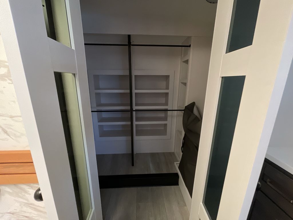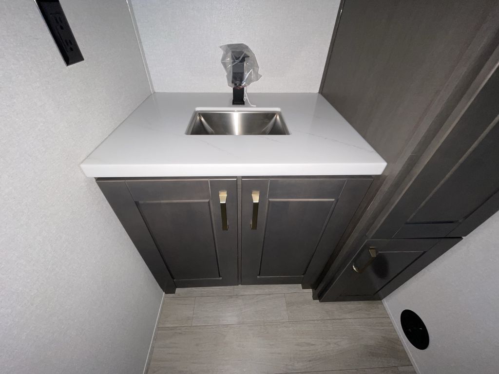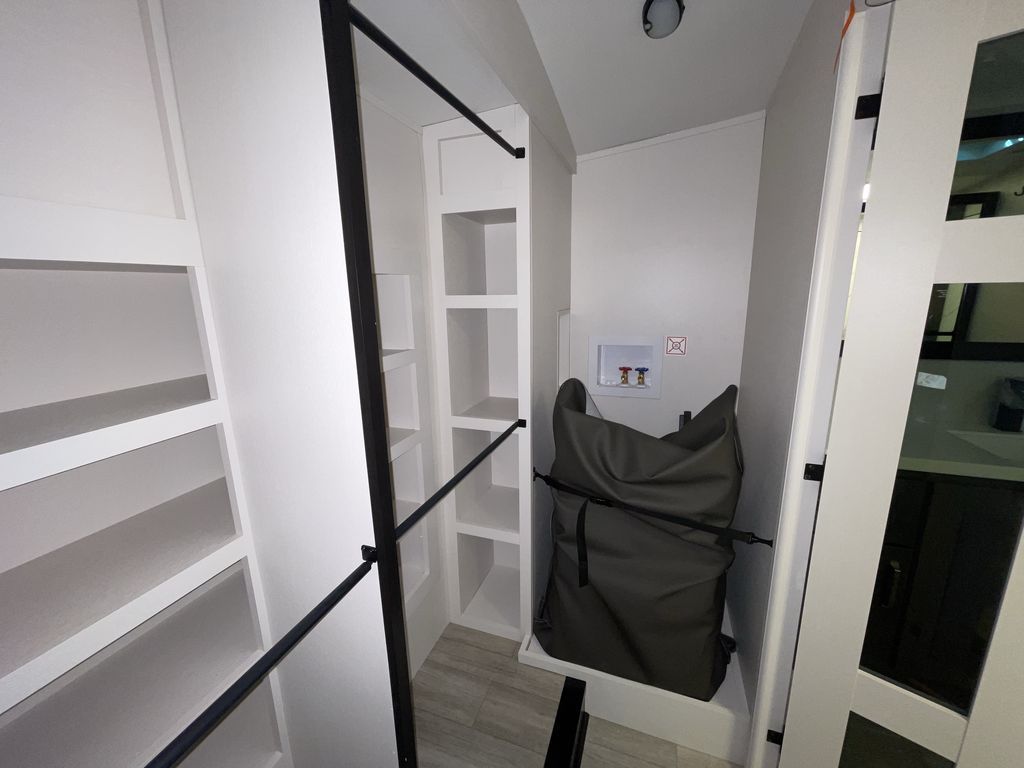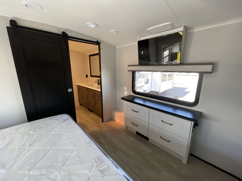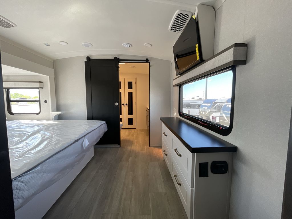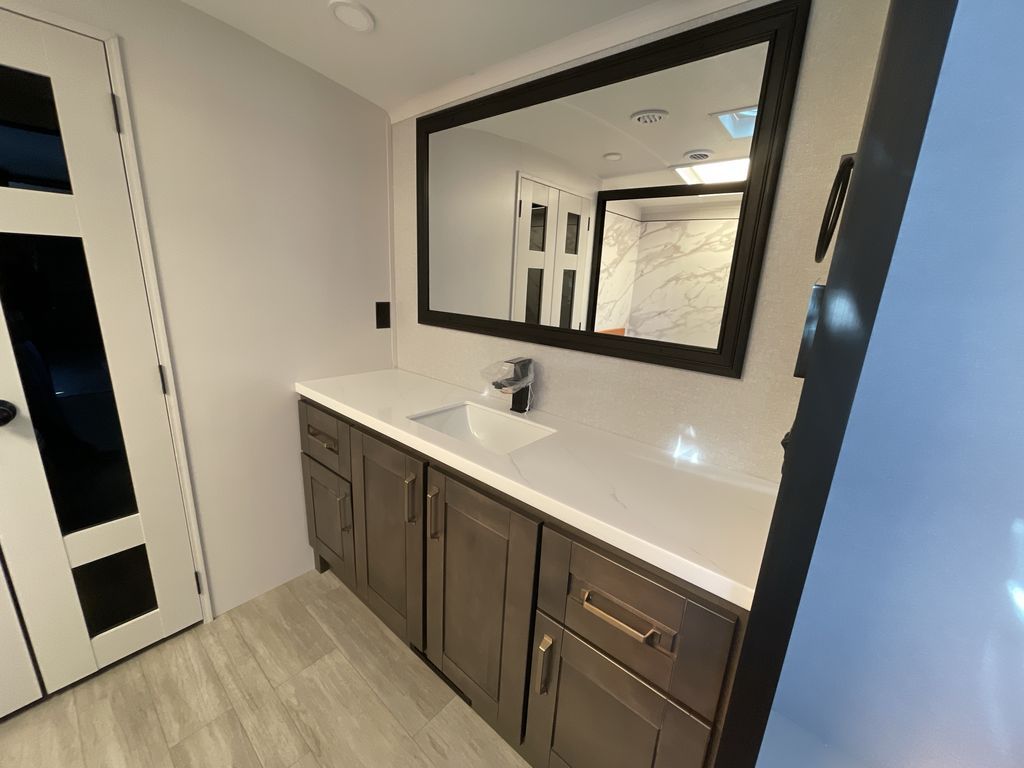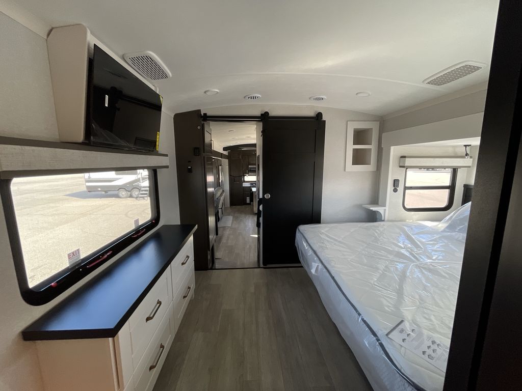 Starting from the back, this impressive 39RK features a rear kitchen designed in a convenient U-shape for easy accessibility and efficient meal prep. The kitchen is fully equipped with plenty of overhead cabinets, a convection microwave with an air fryer, a 24" range, and a pull-out pantry, perfect for the chef on the trip to cook in comfort. Across the kitchen, the large slide-out houses a 21-cu. ft. refrigerator and a second pantry with shelves, providing even more space to store groceries, snacks, and coffee essentials. The nearby desk/coffee bar and roll-out table create an inviting area to enjoy meals or unwind with a cup of coffee. The living area offers a spacious 100" L-shaped sofa and a theater seat facing the TV and fireplace, making it an ideal spot for relaxing or hosting movie nights. Moving forward, you’ll find a convenient half bathroom with linen shelves for added storage and accessibility. At the front, the private bedroom features a 72" x 80" king bed in a slide-out with a dresser across for ample storage. Finally, the full bathroom at the very front includes a 30" x 61" shower with a seat for comfort, a large sink, and a walk-in closet that provides generous space for all your clothing and gear.
