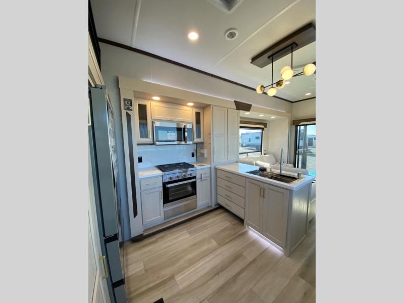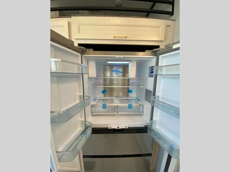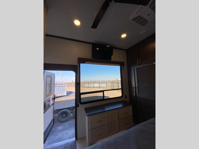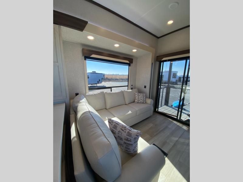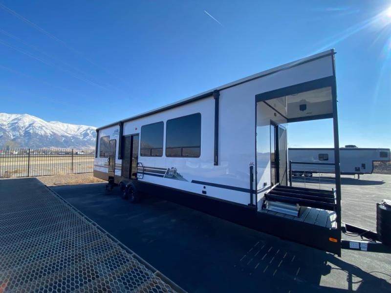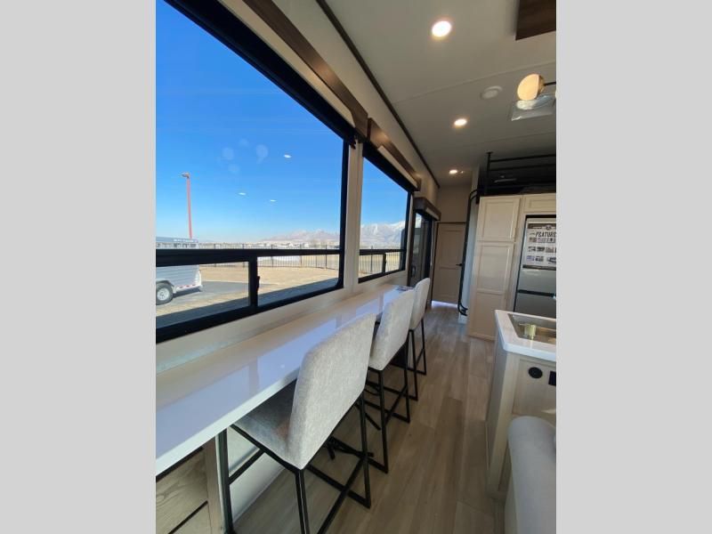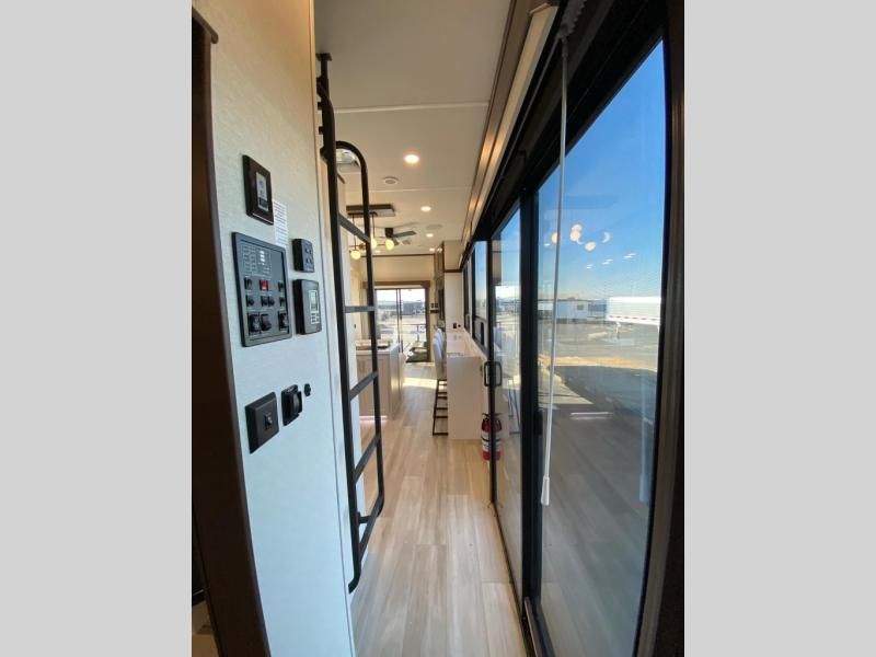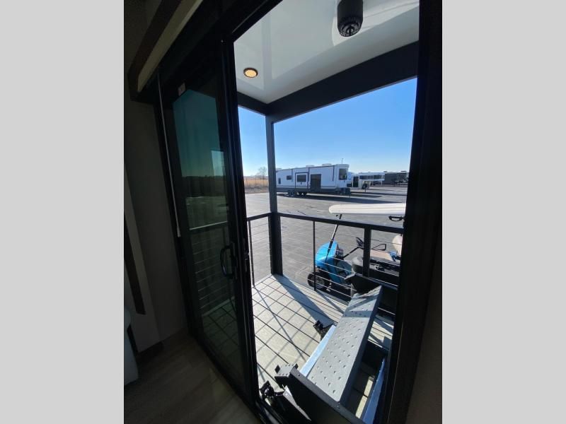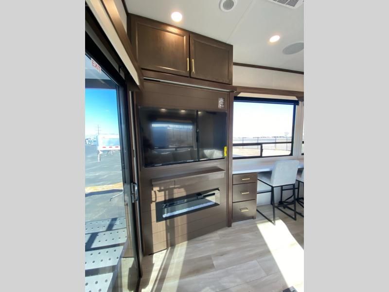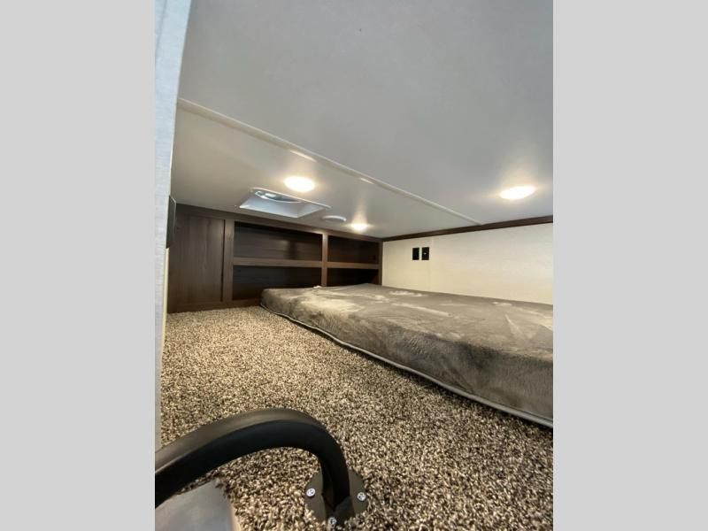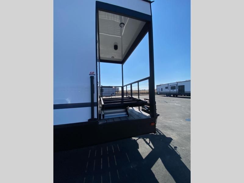 If you need more sleeping or storage space, this destination trailer is the one for you! There is a front covered porch with sliding glass doors that enters in to the front living area. Here, you'll enjoy relaxing on the sectional hide-a-bed sofa across from the entertainment center and fireplace. The spacious bar top with three seats will provide a place to dine, and the middle kitchen is any chef's dream with its two pantries, spacious 18 cu. ft. 12V refrigerator, and plenty of counter space! When you're ready for your own space, you can retreat to the rear bedroom where you'll find a king bed slide out, a wardrobe, a dresser, drawers, and even washer and dryer prep. The comfort doesn't stop there! There is also a loft above the full bath that includes a ladder and a mattress, so you can use this space for more sleeping or storage space!