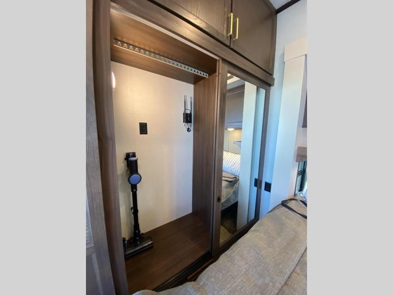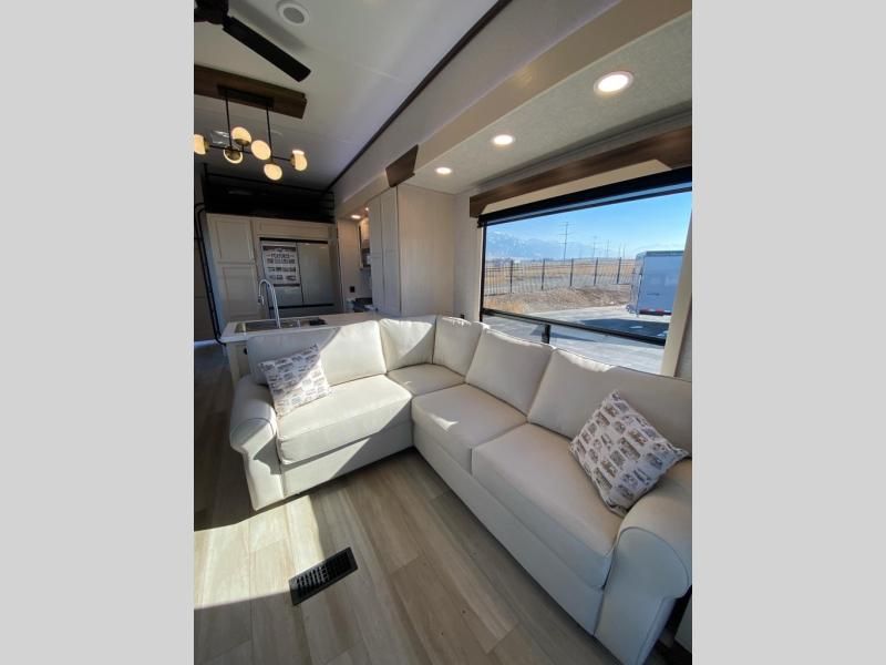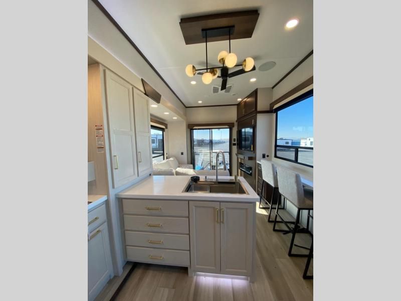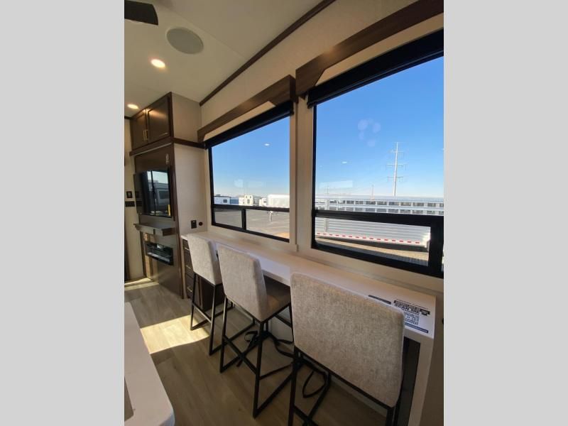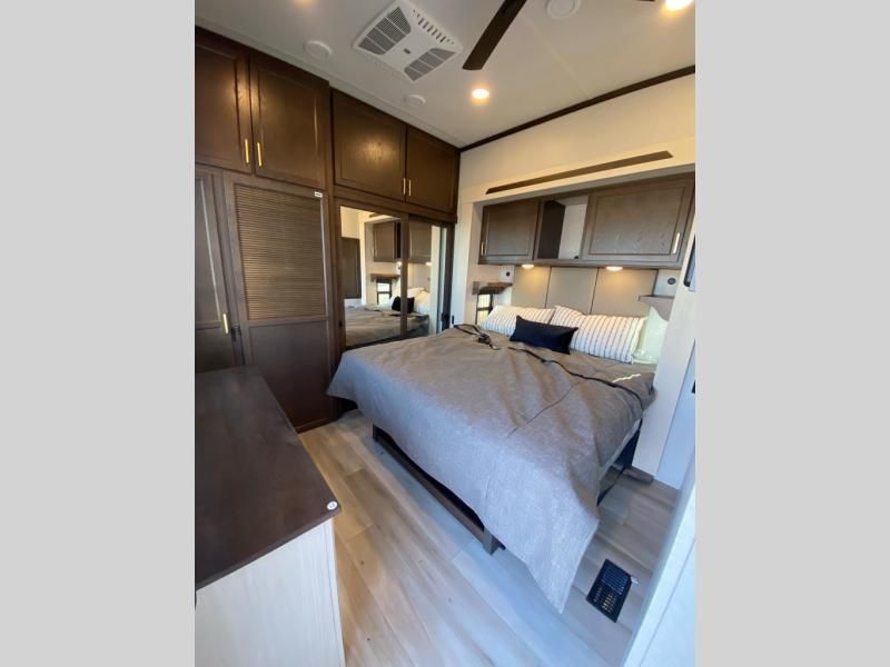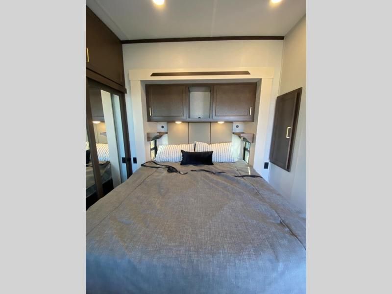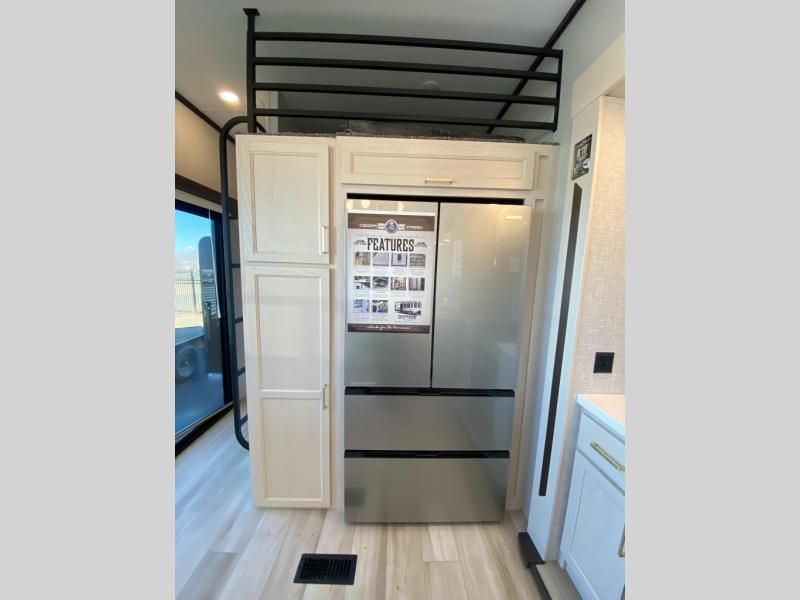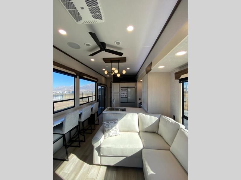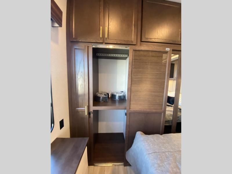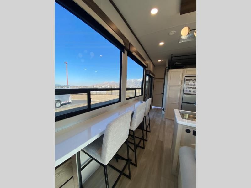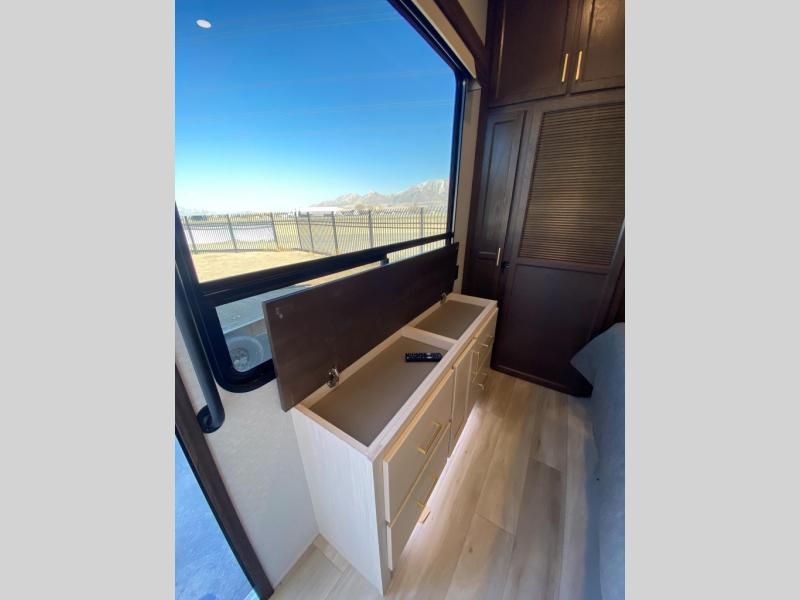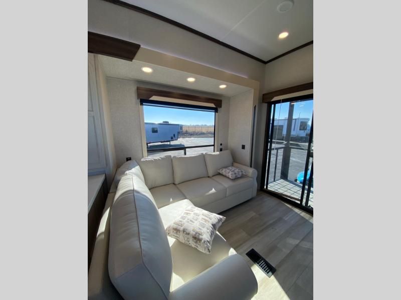 If you need more sleeping or storage space, this destination trailer is the one for you! There is a front covered porch with sliding glass doors that enters in to the front living area. Here, you'll enjoy relaxing on the sectional hide-a-bed sofa across from the entertainment center and fireplace. The spacious bar top with three seats will provide a place to dine, and the middle kitchen is any chef's dream with its two pantries, spacious 18 cu. ft. 12V refrigerator, and plenty of counter space! When you're ready for your own space, you can retreat to the rear bedroom where you'll find a king bed slide out, a wardrobe, a dresser, drawers, and even washer and dryer prep. The comfort doesn't stop there! There is also a loft above the full bath that includes a ladder and a mattress, so you can use this space for more sleeping or storage space!