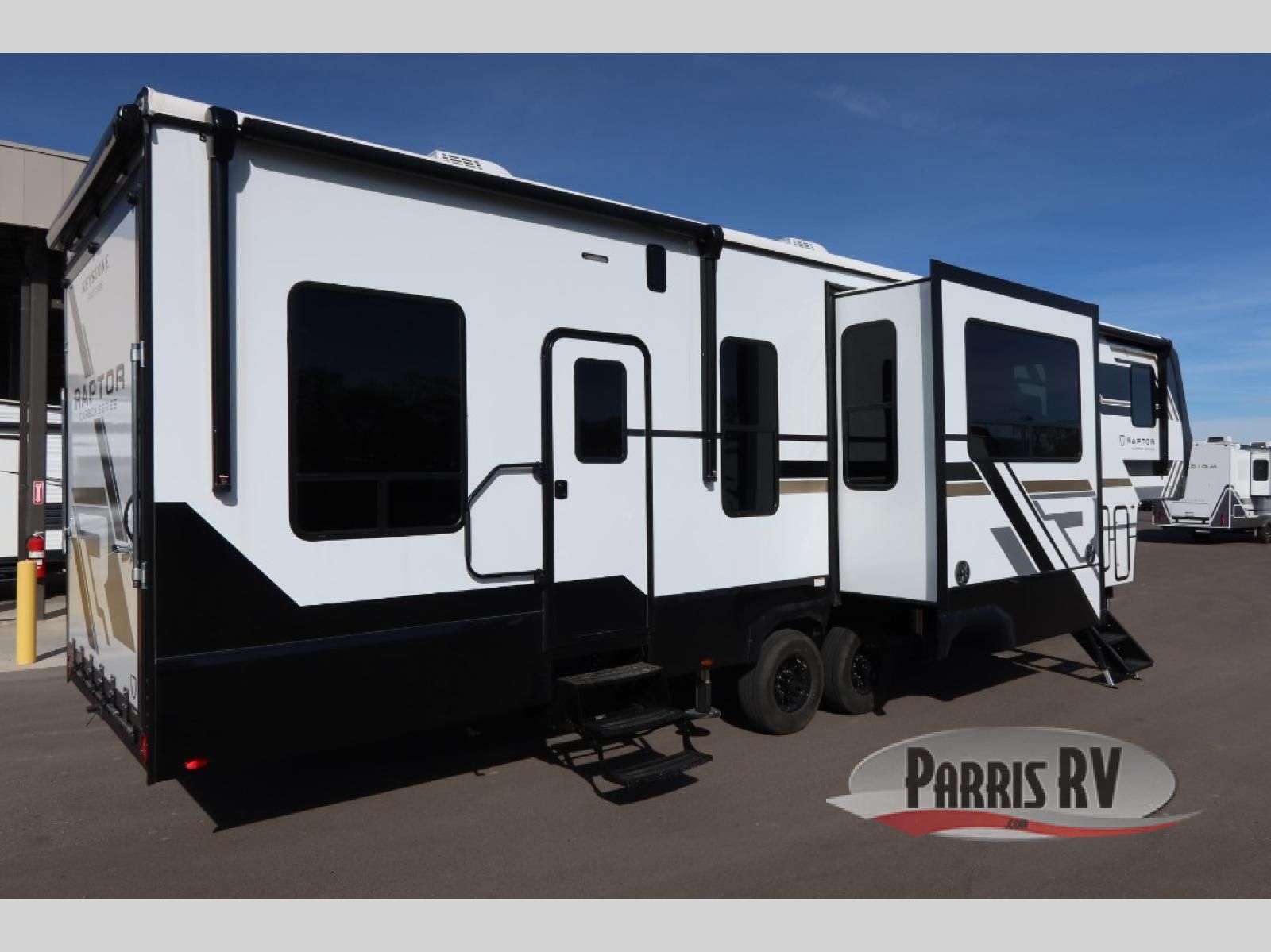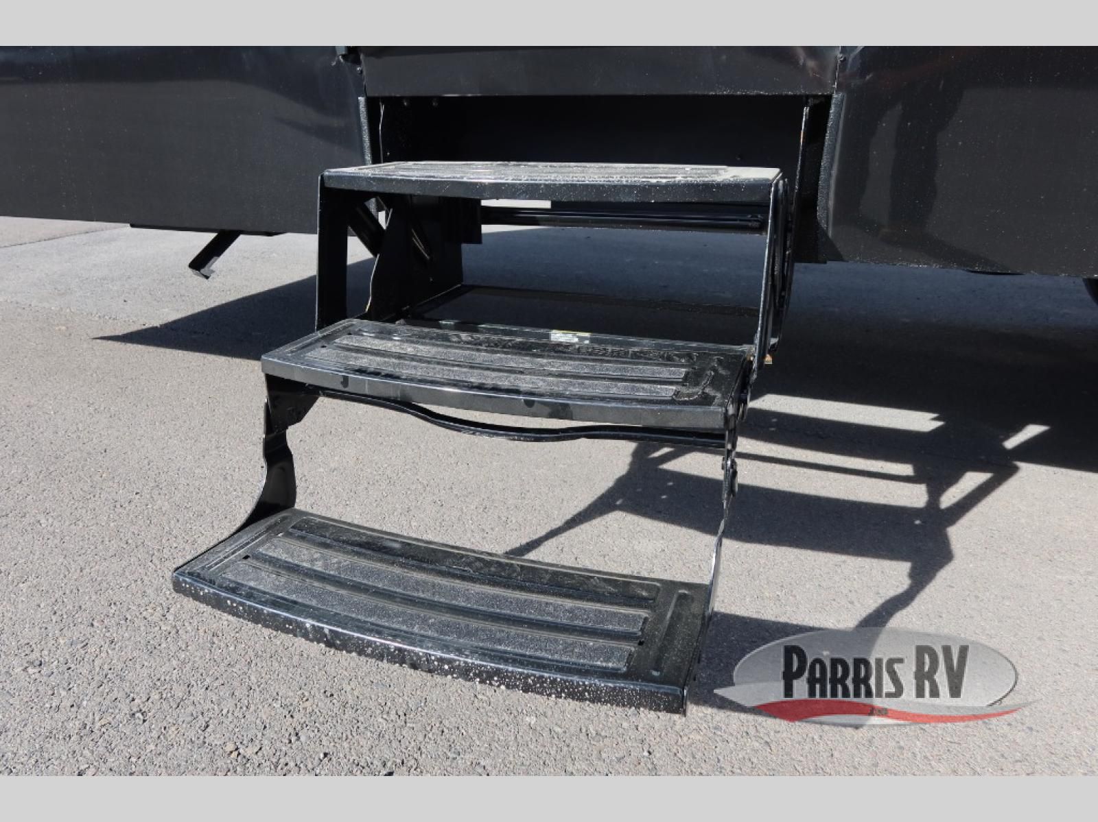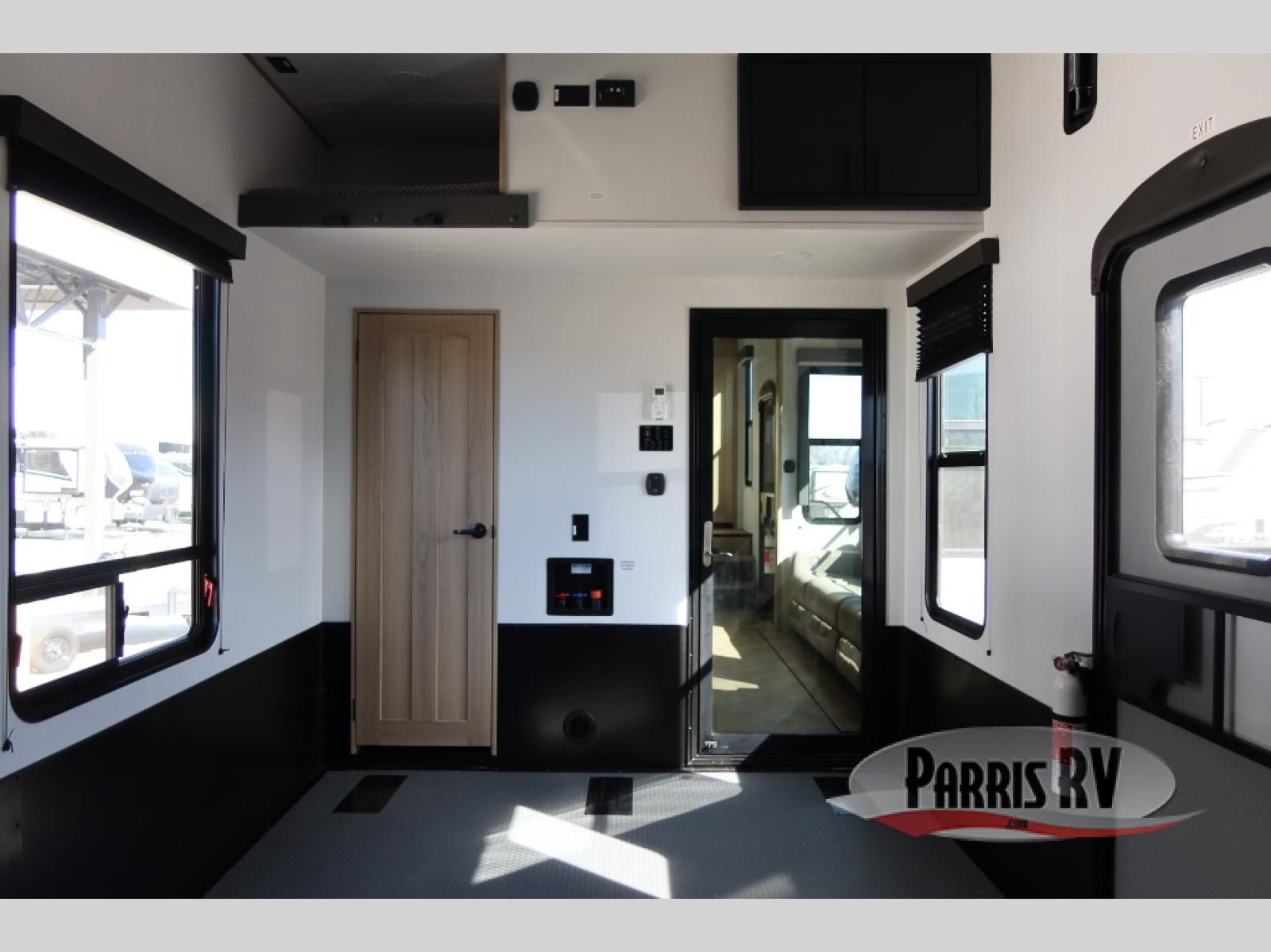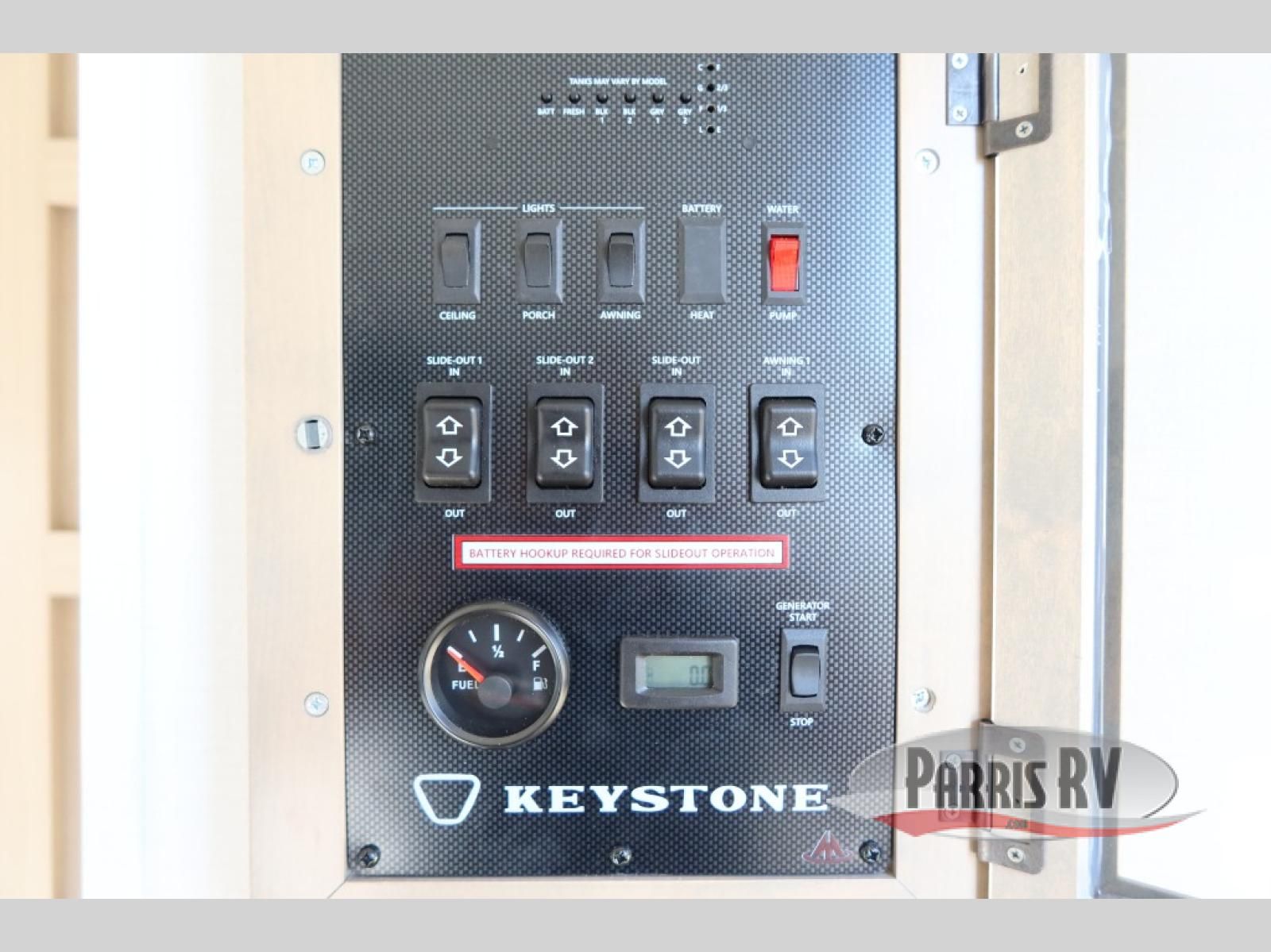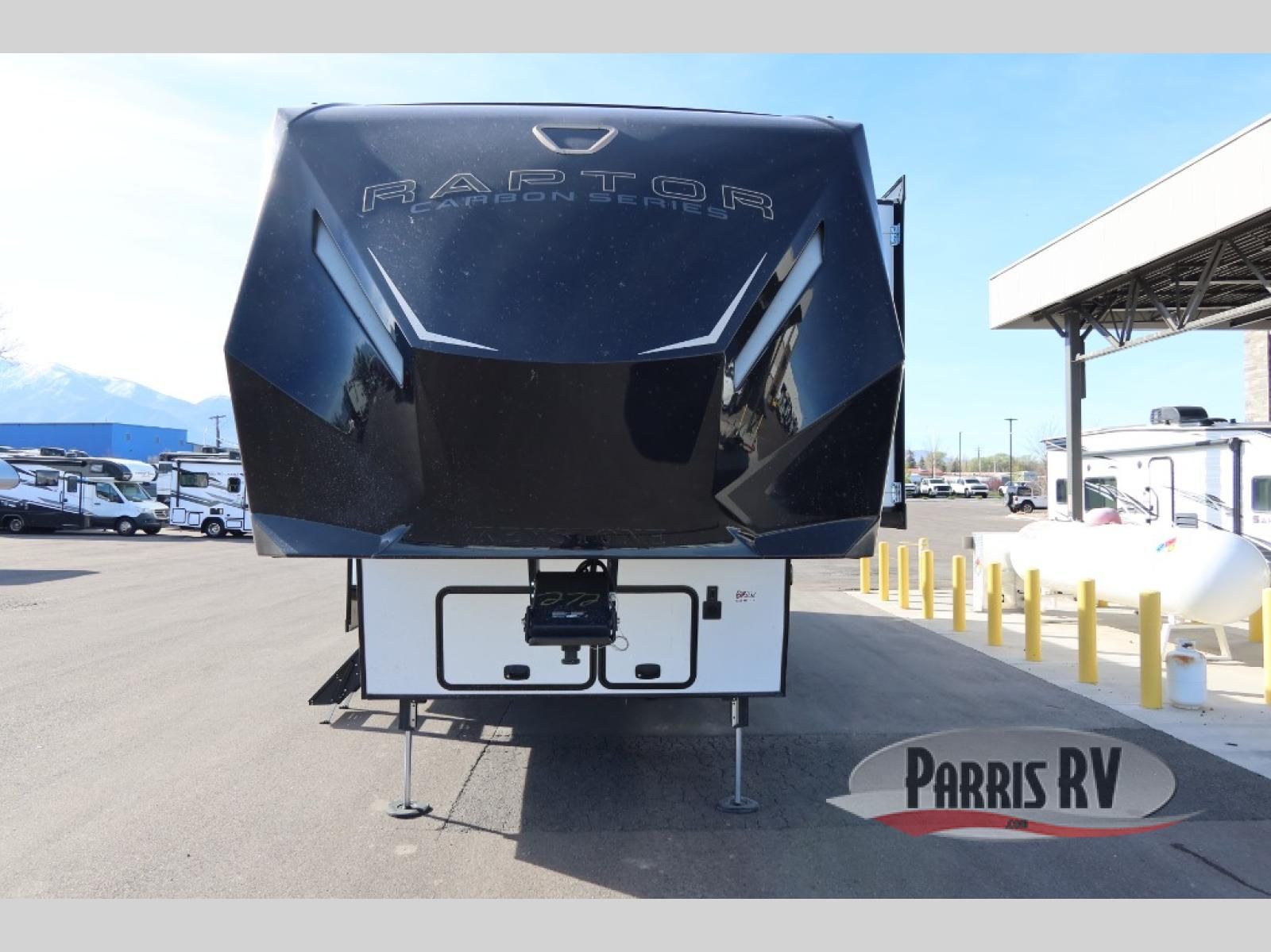 With any Keystone Raptor Carbon Series toy hauler fifth wheel, you will enjoy a new chassis with a larger pass-through storage and a new front cap with LED lighting. There is also an upgraded MORryde CRE3000 suspension, a 6-point hydraulic Level-Up system, and a Nautilus exterior convenience center to easily access all your hookups. Inside, you'll love the hardwood soft-close cabinet doors, pressed countertops, and Thomas Payne furniture. The Extreme Weather Package will add protection against the elements, and the on-demand tankless water heater will provide endless hot showers!