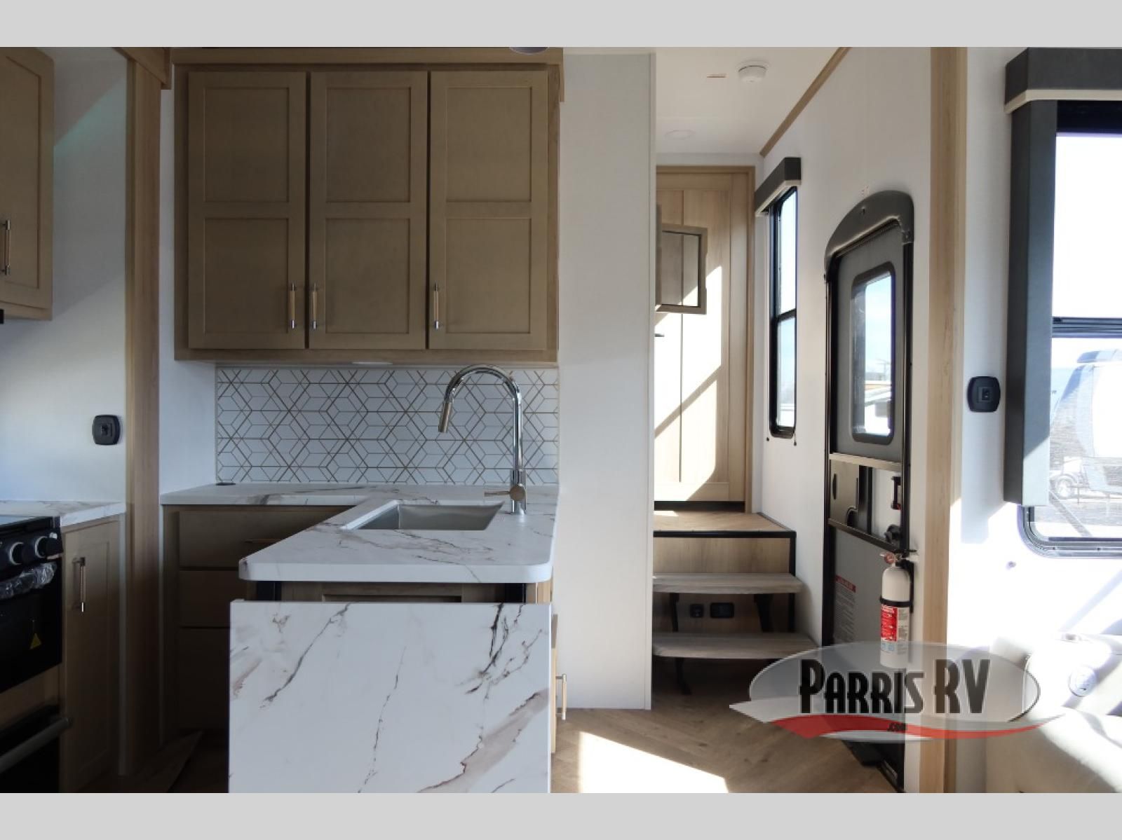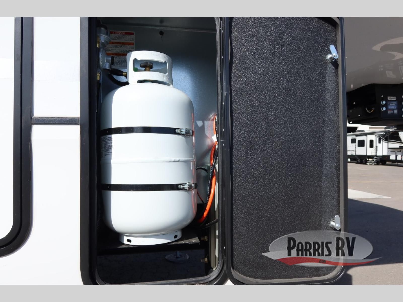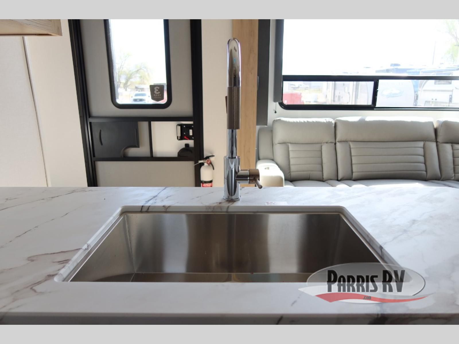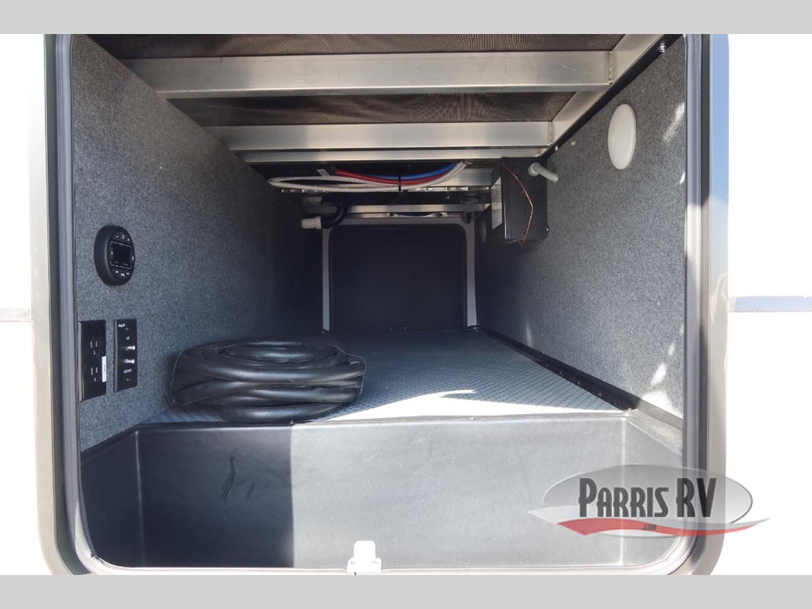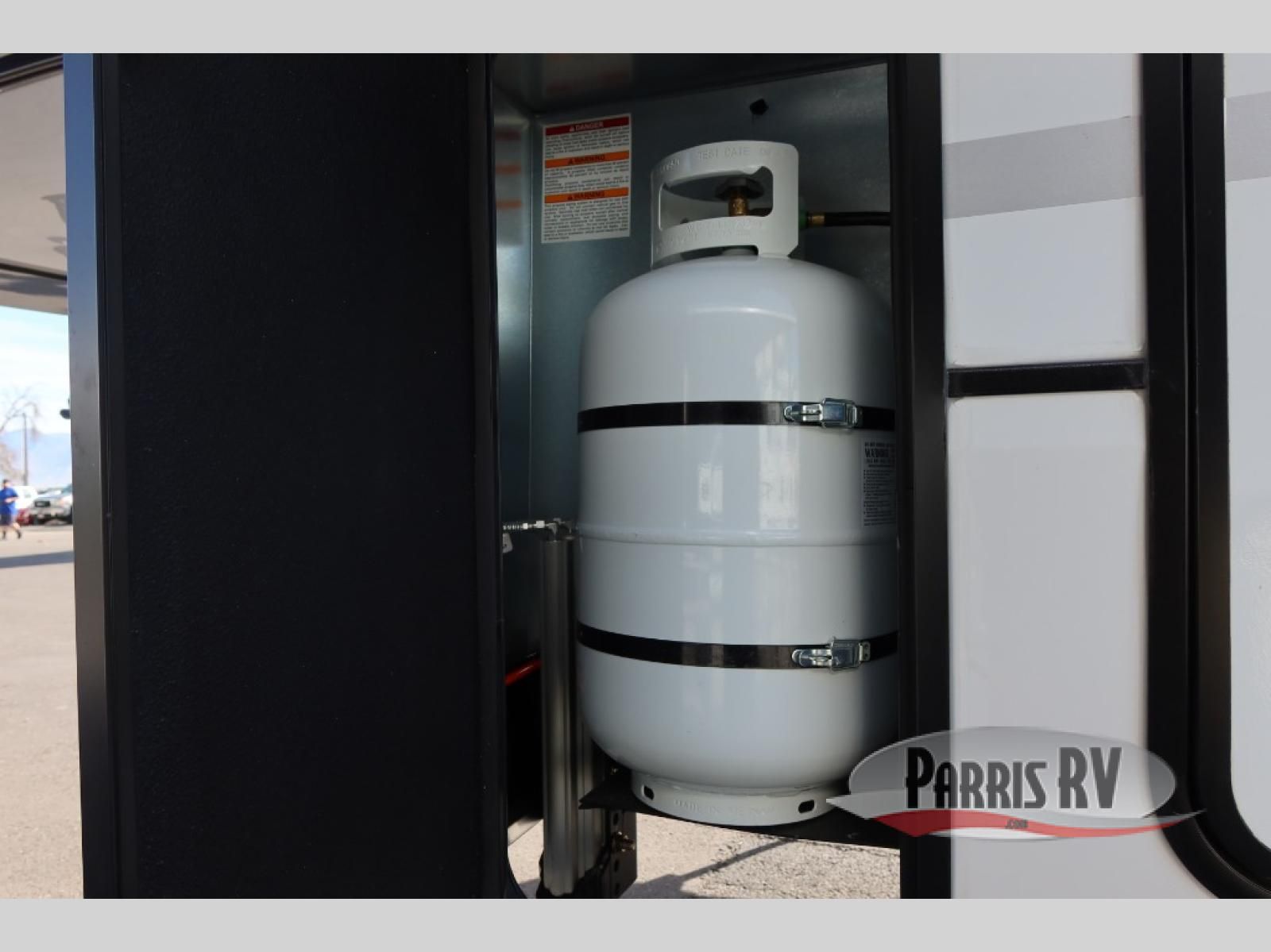 With any Keystone Raptor Carbon Series toy hauler fifth wheel, you will enjoy a new chassis with a larger pass-through storage and a new front cap with LED lighting. There is also an upgraded MORryde CRE3000 suspension, a 6-point hydraulic Level-Up system, and a Nautilus exterior convenience center to easily access all your hookups. Inside, you'll love the hardwood soft-close cabinet doors, pressed countertops, and Thomas Payne furniture. The Extreme Weather Package will add protection against the elements, and the on-demand tankless water heater will provide endless hot showers!
