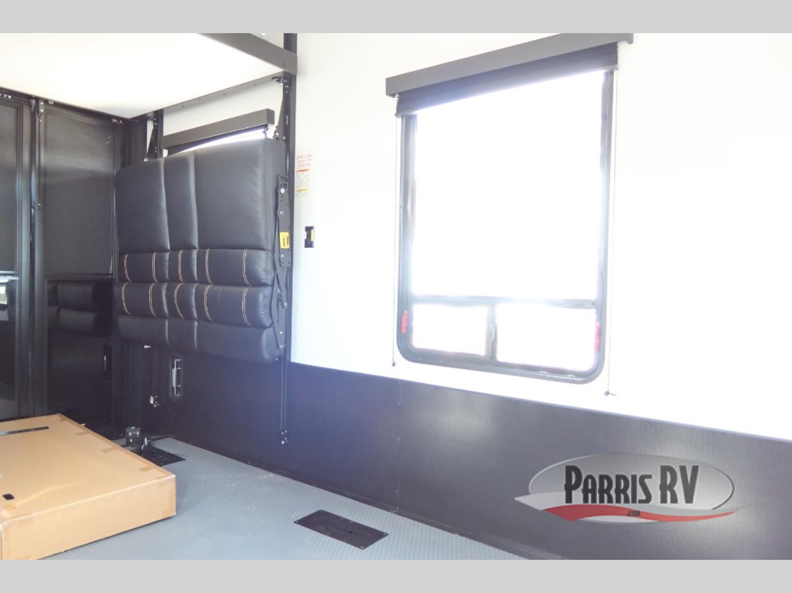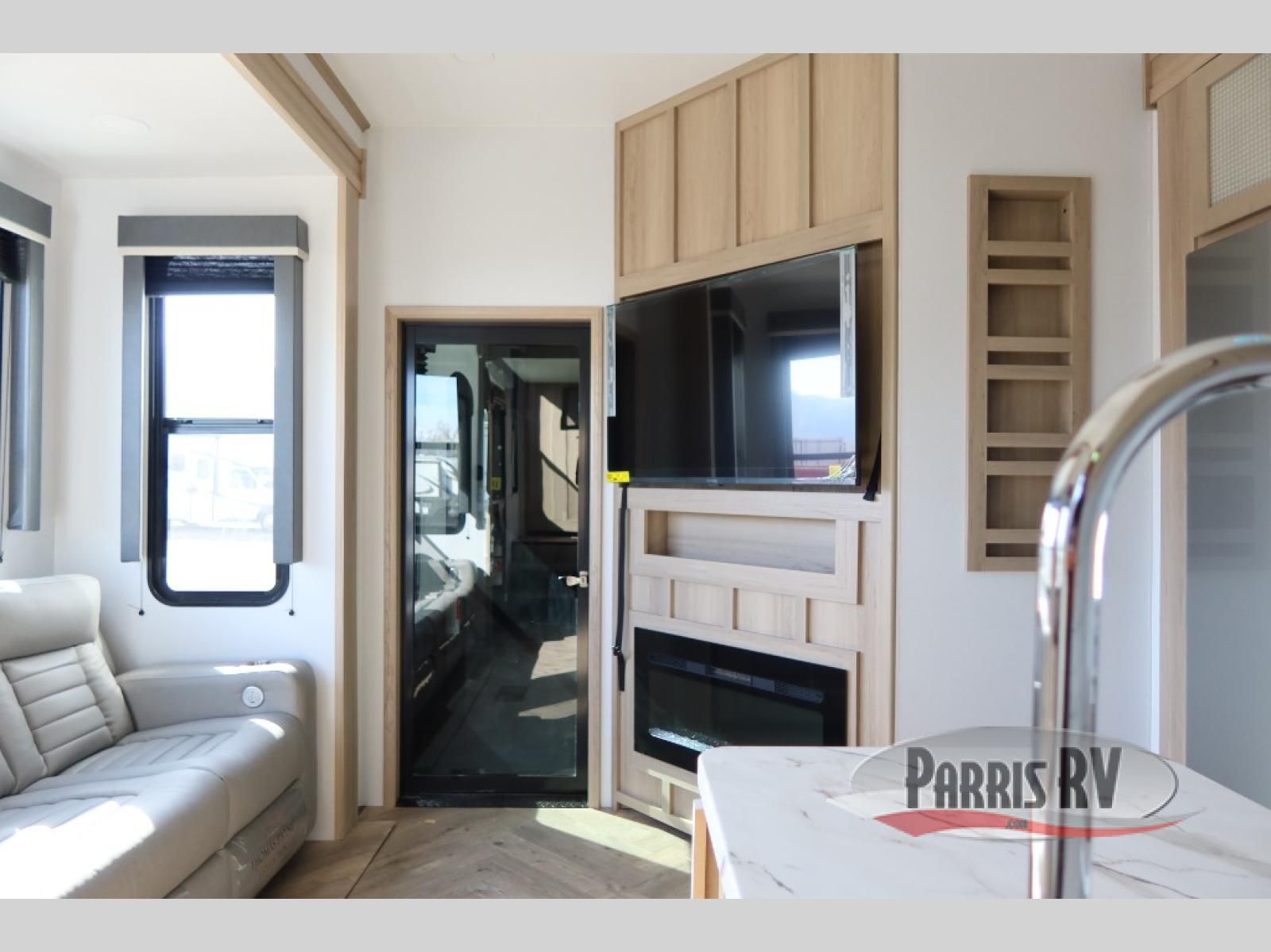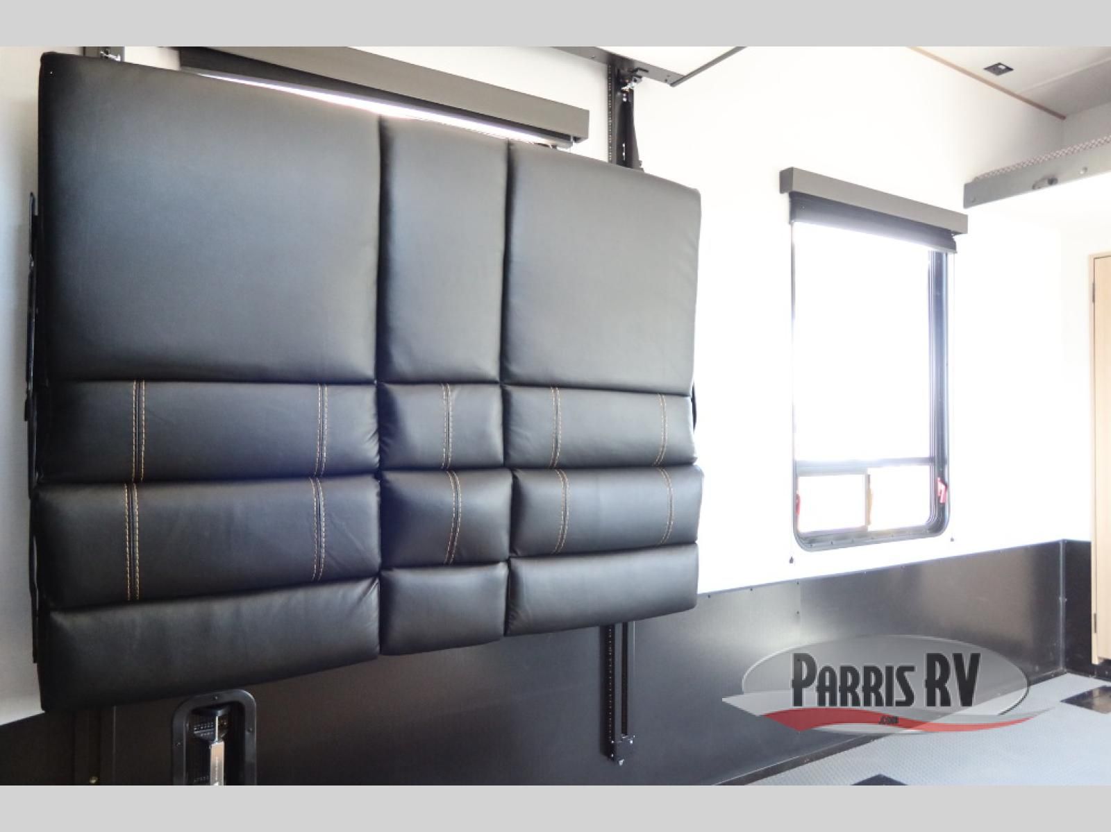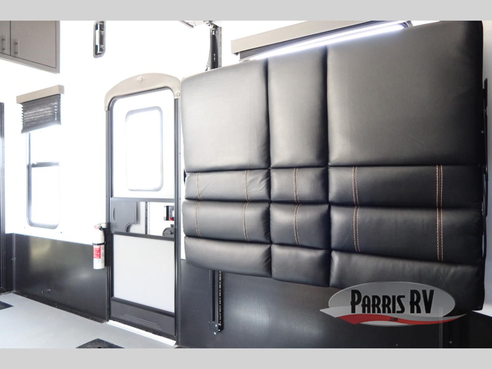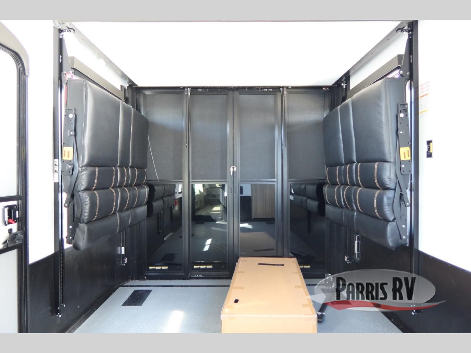 Featuring a spacious king bed with nightstands on each side, this front private bedroom will be your favorite spot to rest! The wardrobe with drawers provides ample storage for your clothes and personal items, helping you stay organized on the road. The bath and a half layout provides convenience and flexibility, ensuring that everyone has their own space to get ready in the morning. The living area is a vibrant hub of entertainment, featuring a reclining sofa with lumbar support and a tilting headrest. The state-of-the-art entertainment center with smart LED TV provides endless hours of fun, while the microwave and sink make meal prep a snap. Further, the garage is designed for ultimate adventure, with ample space for your favorite toys and an electric bed with dual opposing sofas that convert into a comfortable sleeping area.
